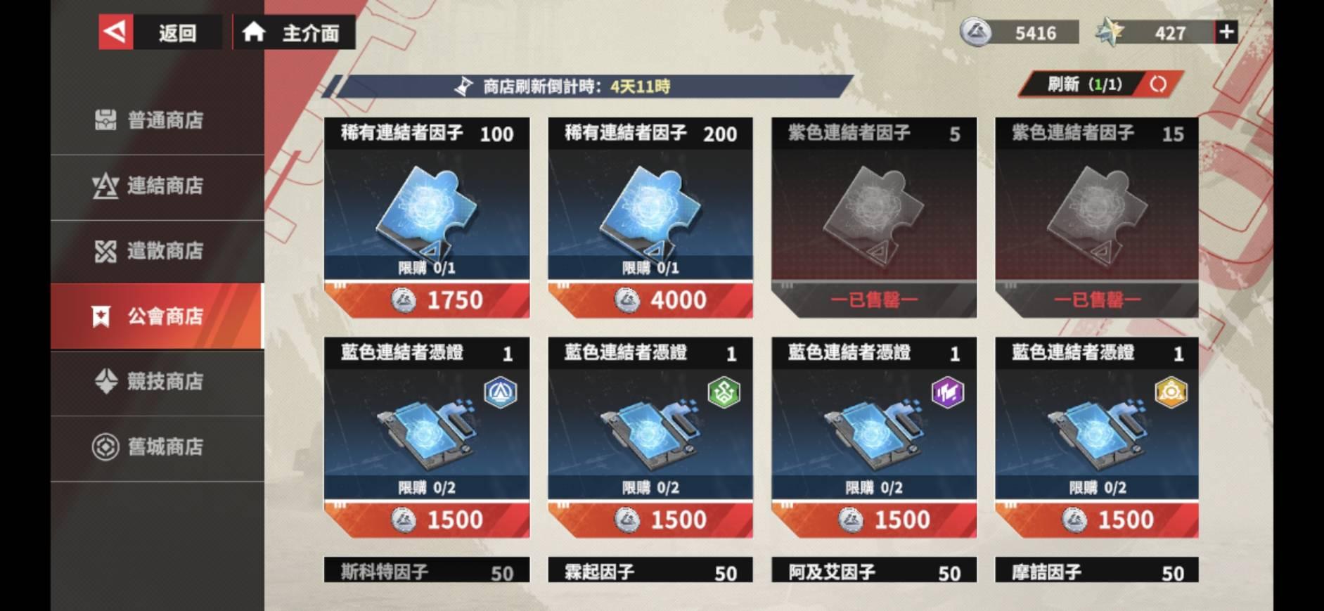 (4)公會商店:每週一刷新,清單固定,貨幣是公會幣,優先換紫色連結者因子。
