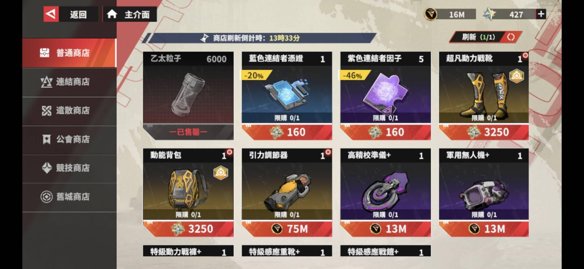 (1)普通商店:每日刷新,乙太幣必買(角色升級到20級倍數時突破用)。