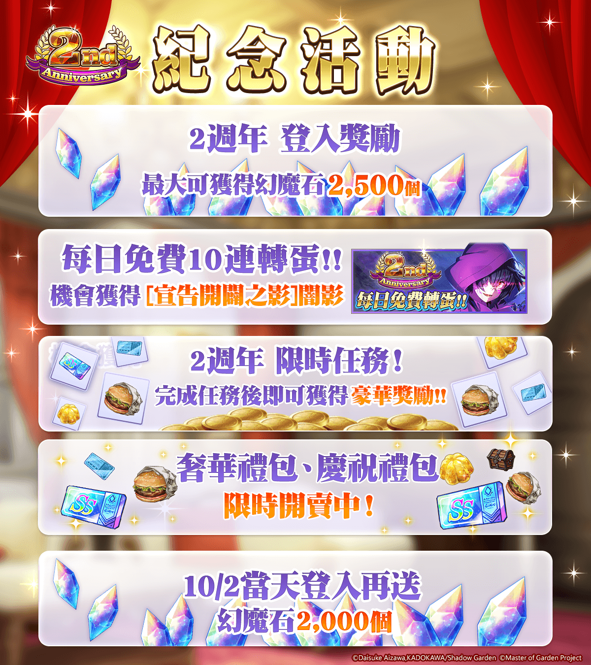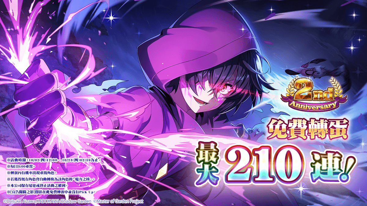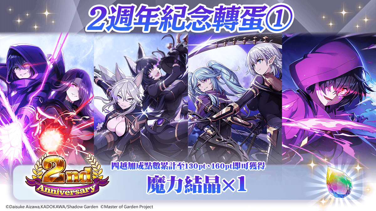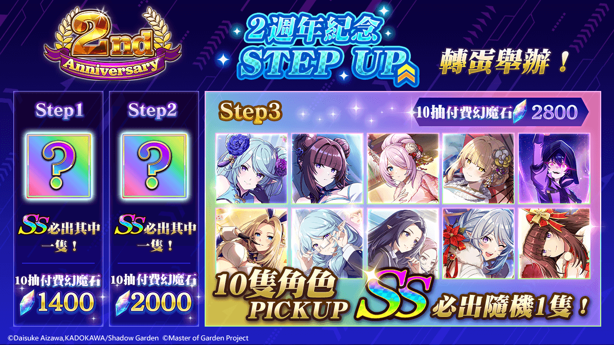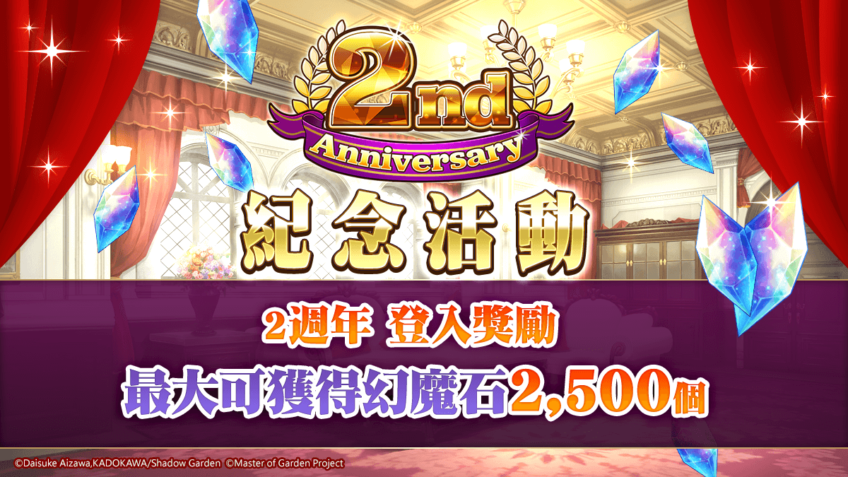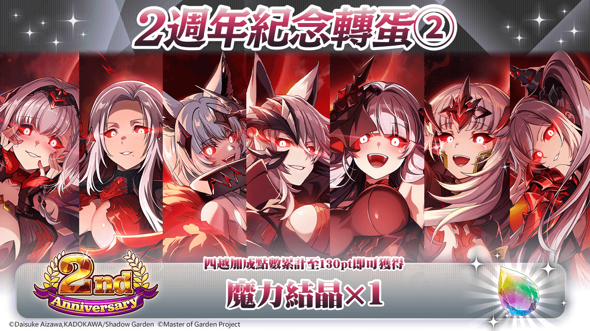 此外,繁體中文版方面另外舉行發行 2 週年慶祝活動,包含 登入就送幻魔石、每日免費 10 連轉蛋、特別登入獎勵、推出限時任務、實施 紀念轉蛋 ① & ② & STEP UP 轉蛋、販售獨家禮包。