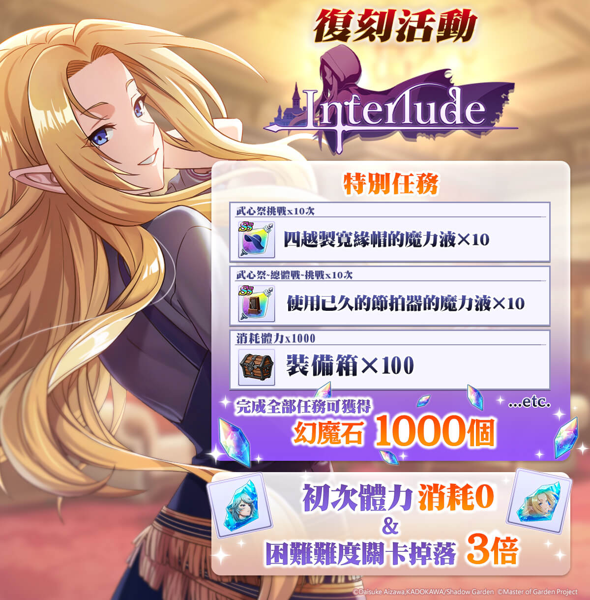 同時期間內 12 月 26 日至 1 月 16 日舉行復刻活動「Interlude」,當中包含實施 Hard 關卡加成活動、限定任務 以及舉辦復刻轉蛋。