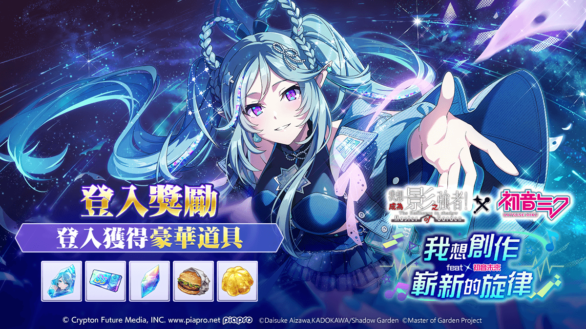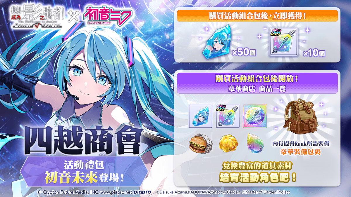 於四越商會內新增合作活動禮包【初音未來】,內容包含了 角色碎片、魔力液 等道具。