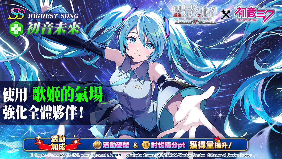 伴隨『我想創作嶄新的旋律 feat. 初音未來』合作活動舉行,自 10 月 2 日率先登場的期間限定轉蛋卡池角色【HIGHEST SONG】初音未來,是名使用「歌姬氣場」來強化全體夥伴並在施展奧義後變換 BGM 由 初音未來 演唱「HIGHEST」的綠色屬性輸出角色,日後則會實裝【つながる星河一天】伊普西龍。