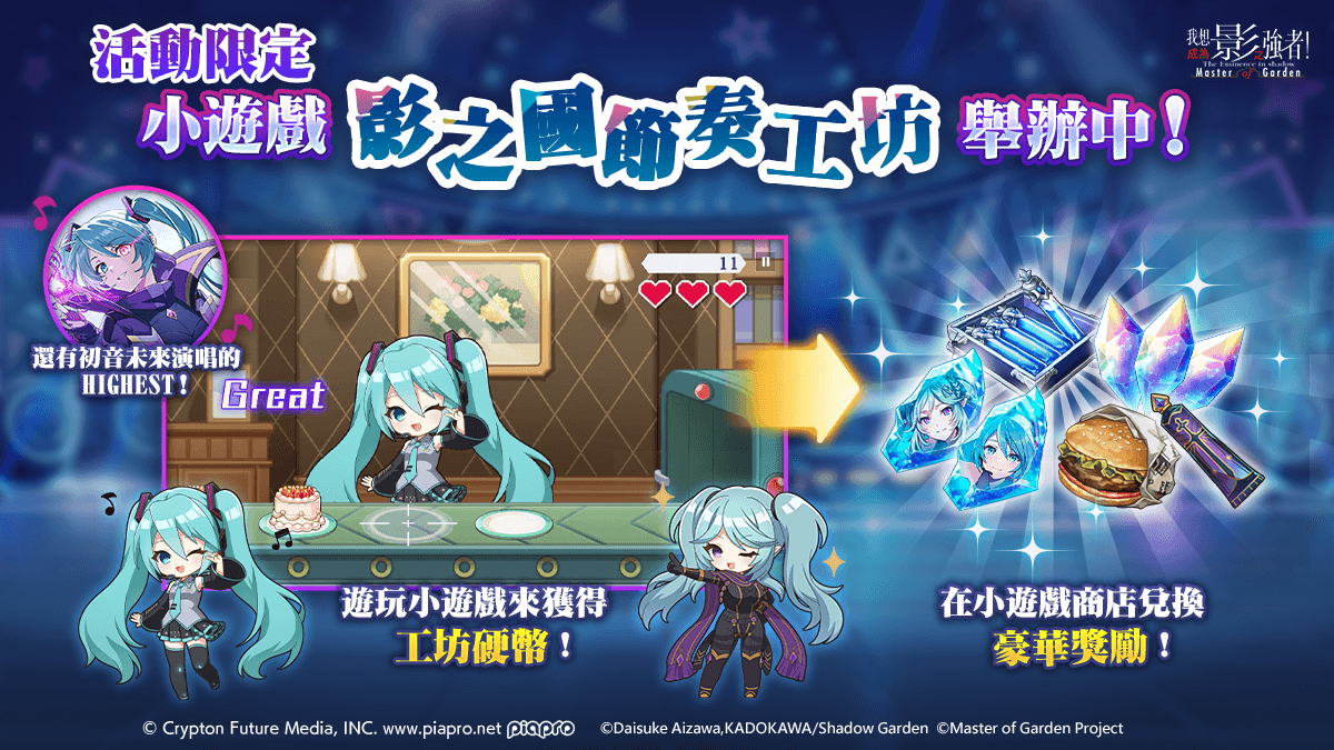 官方表示,自 10 月 2 日(四)舉辦的『我想創作嶄新的旋律 feat. 初音未來』合作活動,講述『在為下一場演奏會的主題煩惱時,伊普西龍收到了 席德 的原創曲請求。陷入完全卡關的 伊普西龍,得到了 希妲 伸出的援手。如果是歌曲的話就得請到專業的,決定拜託虛擬歌手而進行了召喚實驗……沒想到被召喚出來的竟然是 初音未來!?伊普西龍 夥同 初音,再加上其他七影的力量一同朝著完成新曲的目標邁進 —— 究竟能否順利舉辦演奏會呢!?』。