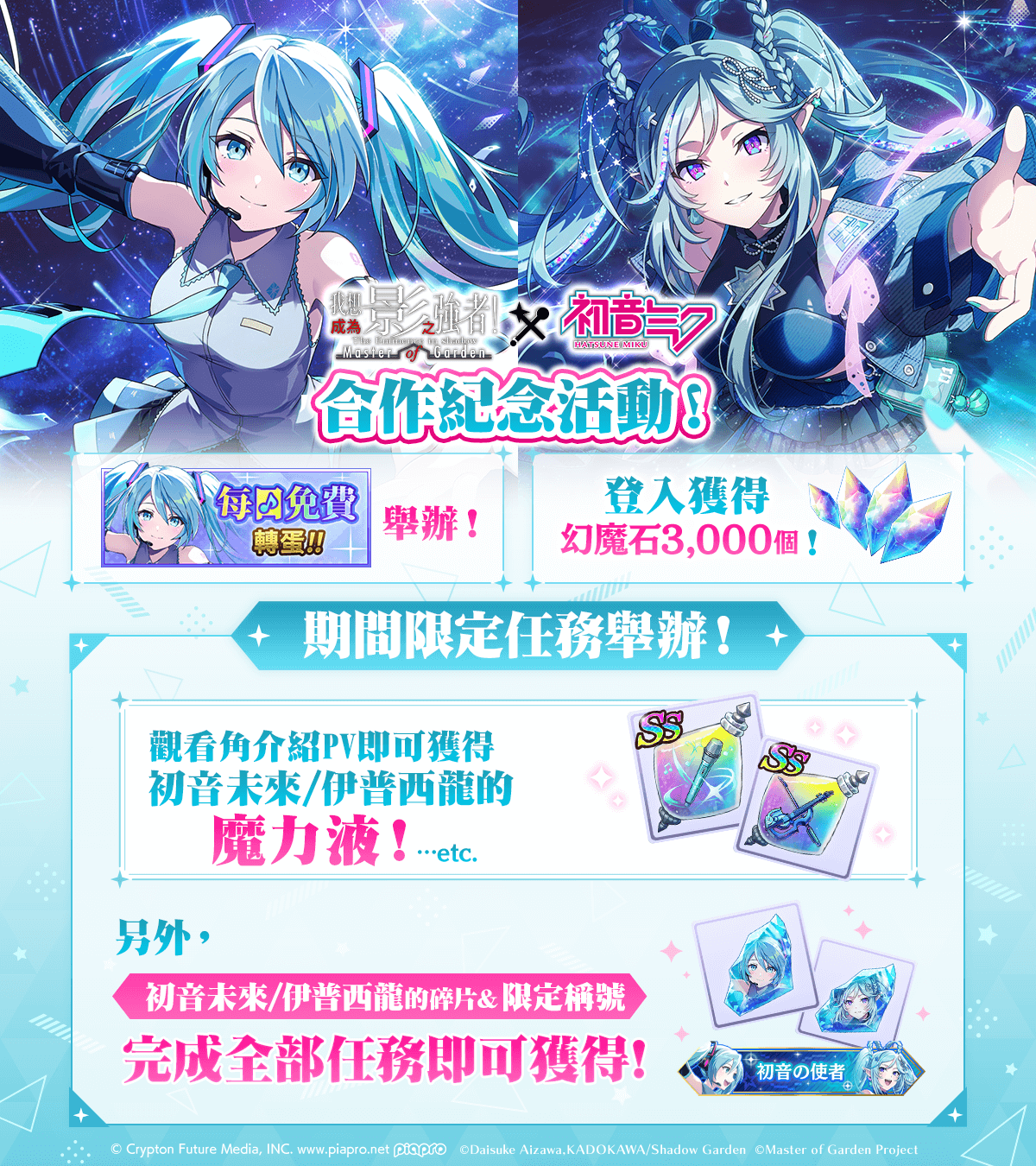為紀念『我想創作嶄新的旋律 feat. 初音未來』合作活動舉行,於遊戲內實施一系列活動,包括期間內每日免費抽、期間內首次登入遊戲可獲得 3000 幻魔石、觀看角色宣傳影片獲得 初音未來/伊普西龍 魔力液道具、完成任務得特別稱號&角色碎片、期間限定開放【つながる星河一天】伊普西龍「影 stagram」拍攝功能 。
