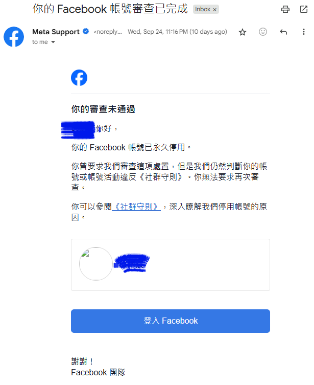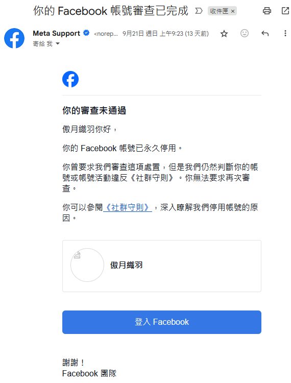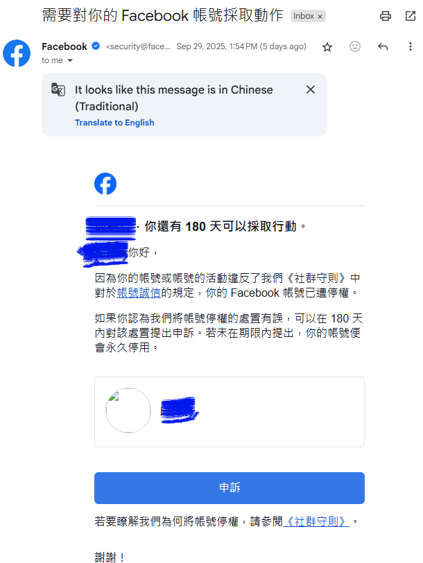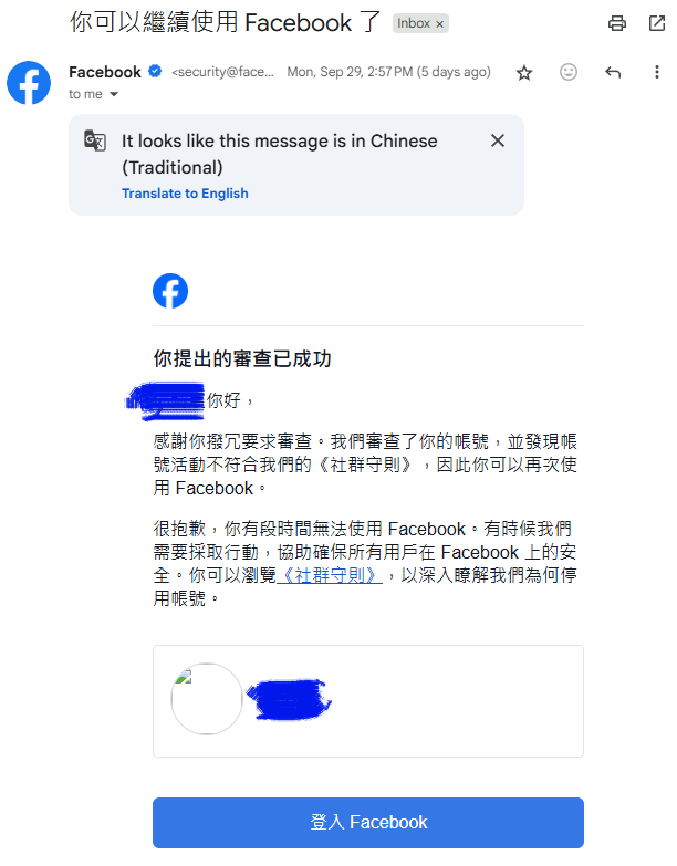 4.在9/29時,這個帳號也突然跳出被封鎖,我這邊提出申訴後,過約一小時有成功解鎖