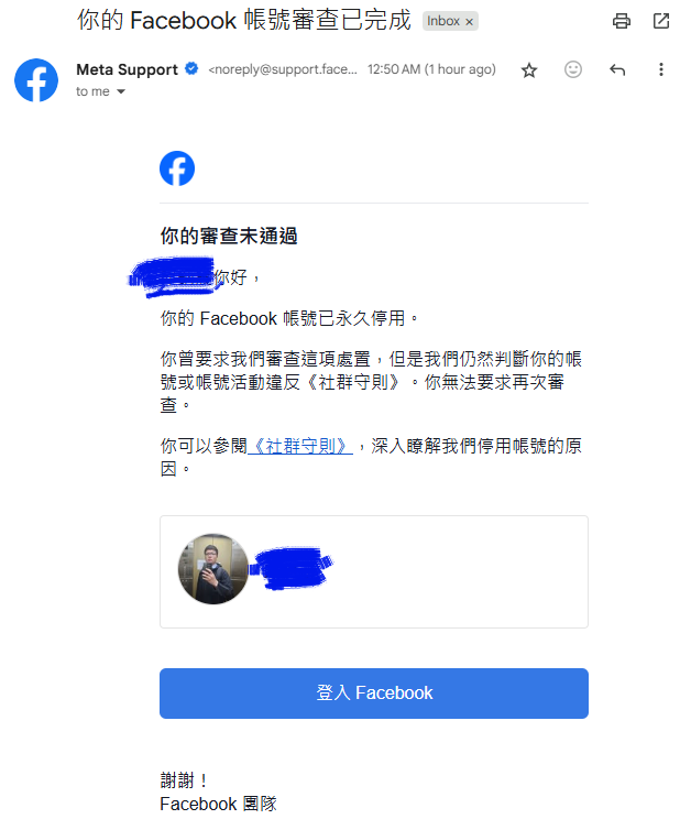 當下也配合錄製了一段上傳,然而不到5分鐘就收到信件通知永久封鎖