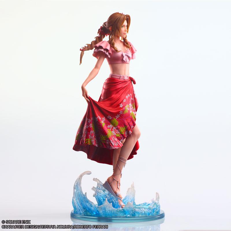 來自《Final Fantasy VII Rebirth》,擁有溫柔純潔心靈並支持夥伴的艾莉絲·蓋恩茲博羅以泳裝造型登場。柔和的粉色上衣與鮮豔花朵圖案沙龍在夏日陽光下華麗映襯,帶著微笑的表情療癒人心。從髮飾與編織髮型的細緻造型,到輕盈展開的裙擺布料表現,都在重視角色特質的前提下精心重現。採用透明材質的台座設計靈感來自往復的海浪,將足尖輕觸浪花的姿態如實呈現,宛如擷取夏日海邊佇立的夢幻時刻。