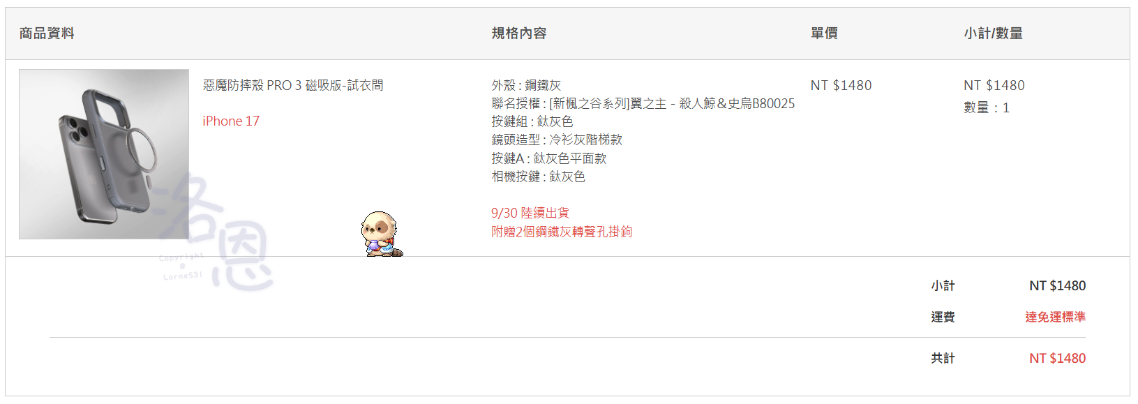 這次買的型號是 iPhone 17 惡魔防摔殼 PRO 3 磁吸版,NT$ 1480。