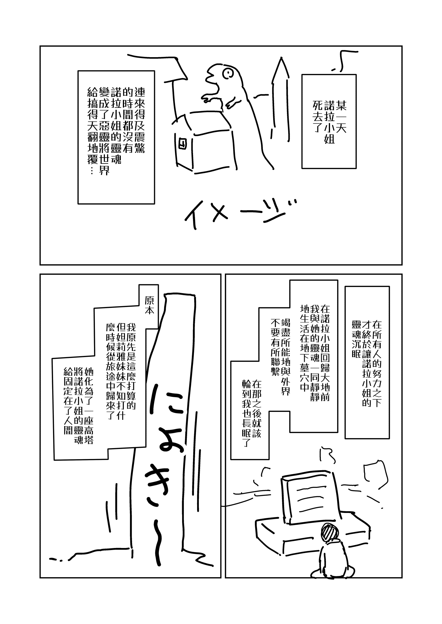 終於說往事了... 諾拉死亡沒甚麼好說的,畢竟是壽命有限的人類(除非後續發生甚麼) 至於死後變惡靈又是另一回事了,除非威脅到帕拉,以諾拉的性格而言,她應該不會讓事態如此發展 事情恐怕不是可以簡略過. 妲莉婭變成塔把諾拉的靈魂留在世上,準備復活諾拉,雖然可以理解,畢竟她們一家的羈絆是特別的 但還是想從妲莉婭口中交代她的動機和真相.