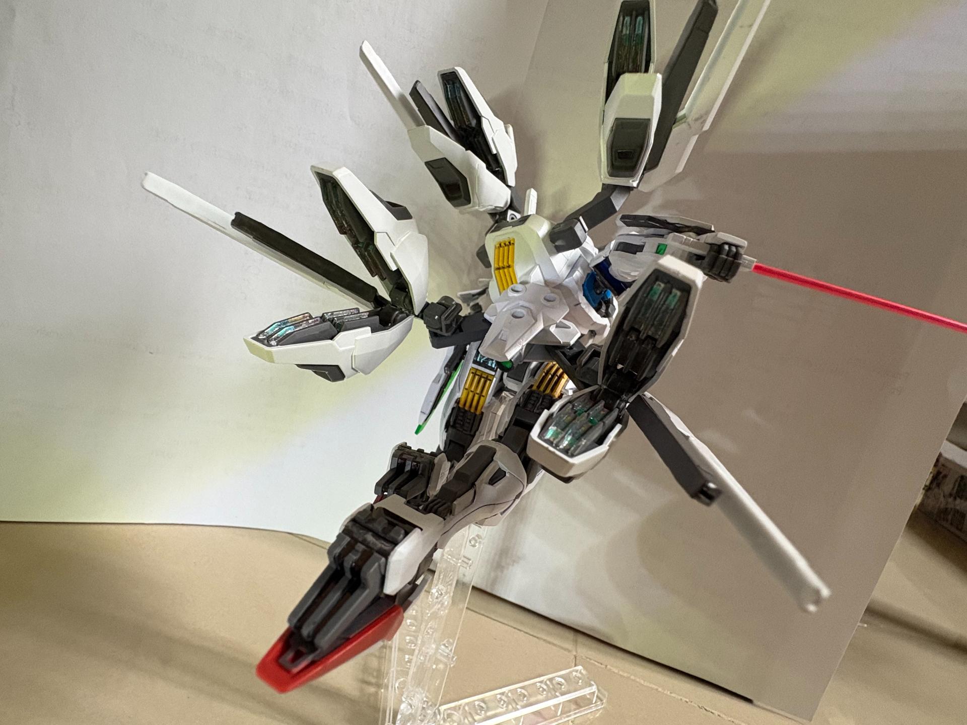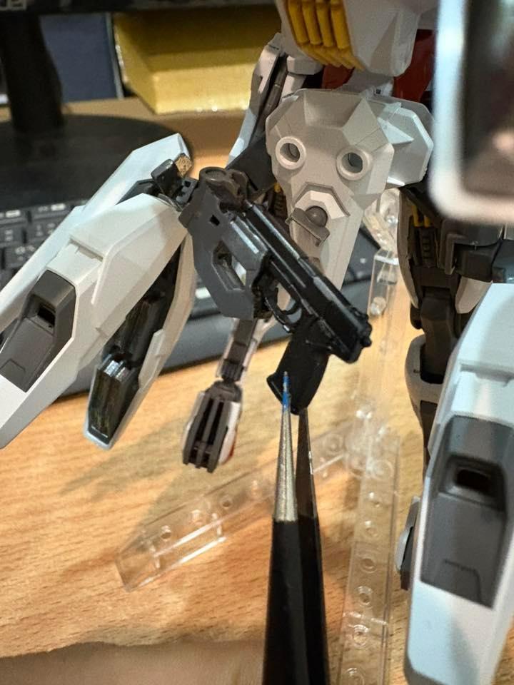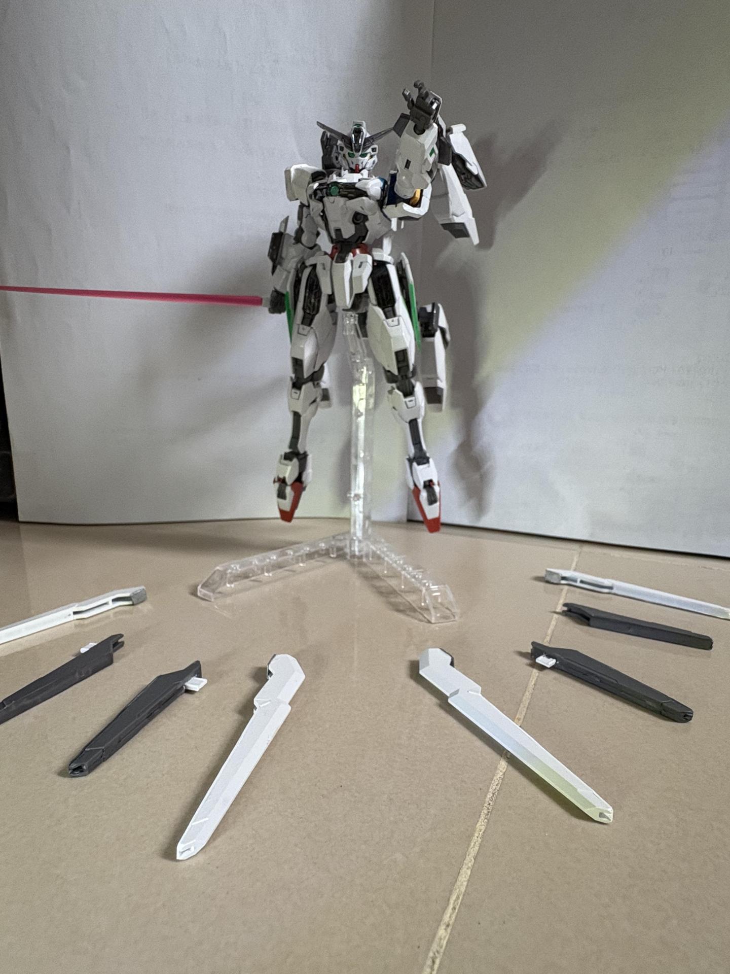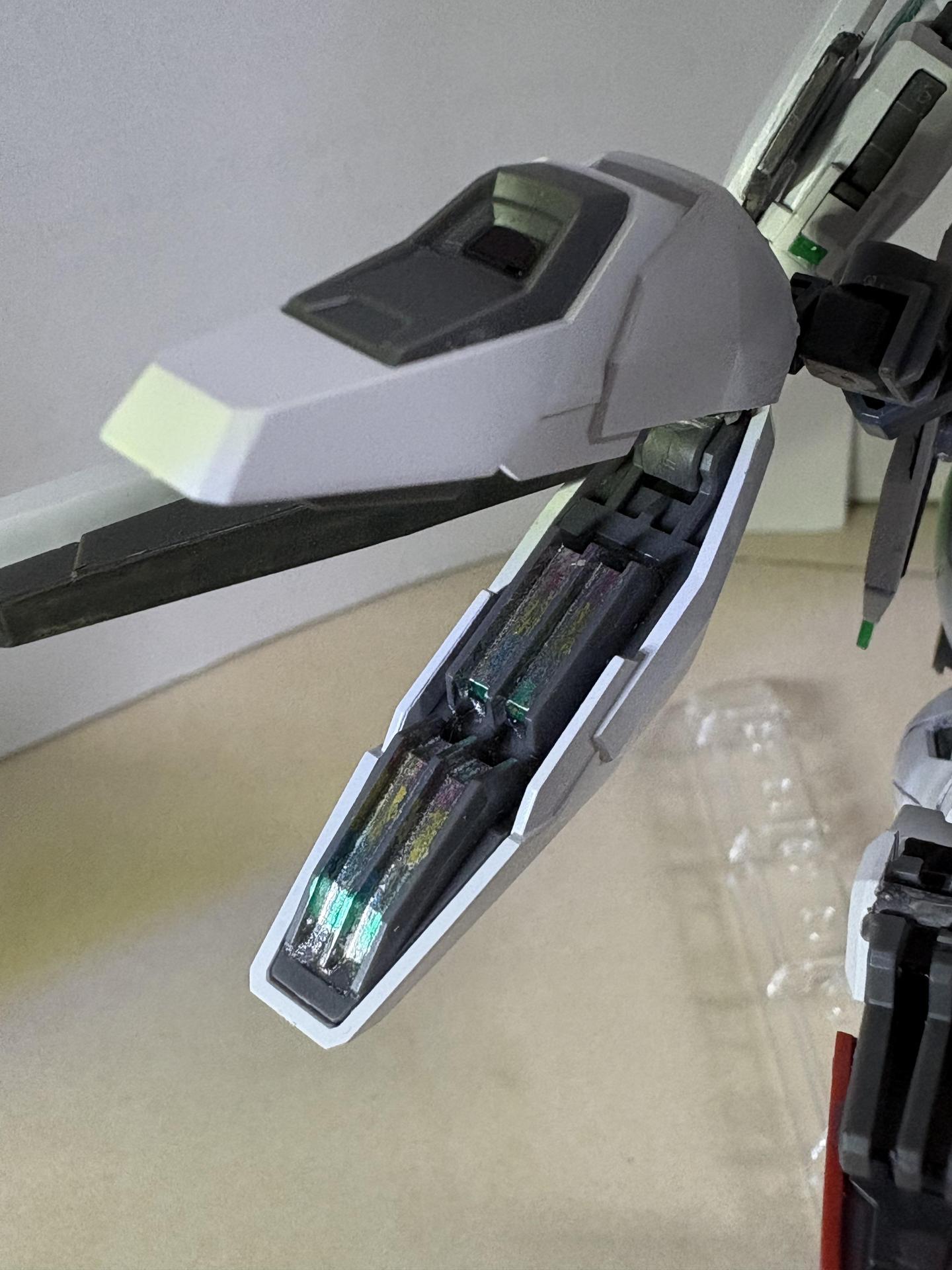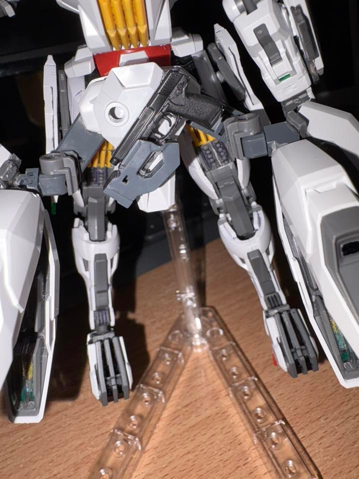 下掛式GN光束衝鋒槍模組是用RG能天使的大型GN劍裡面的光束槍改成的,而槍則是壽屋發售的創採少女庭園用的Mk23手槍。