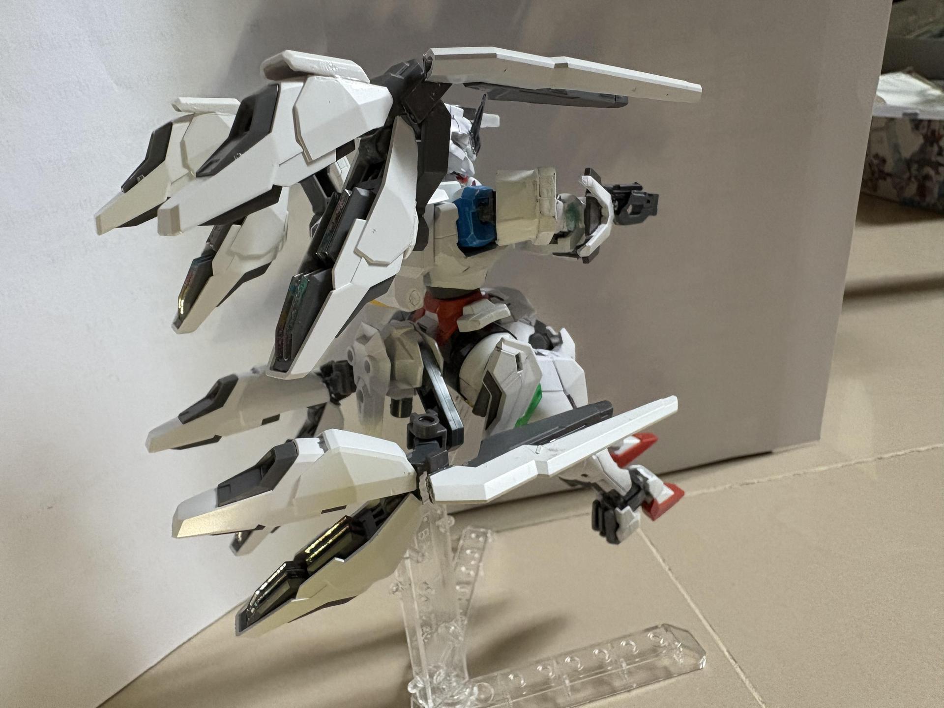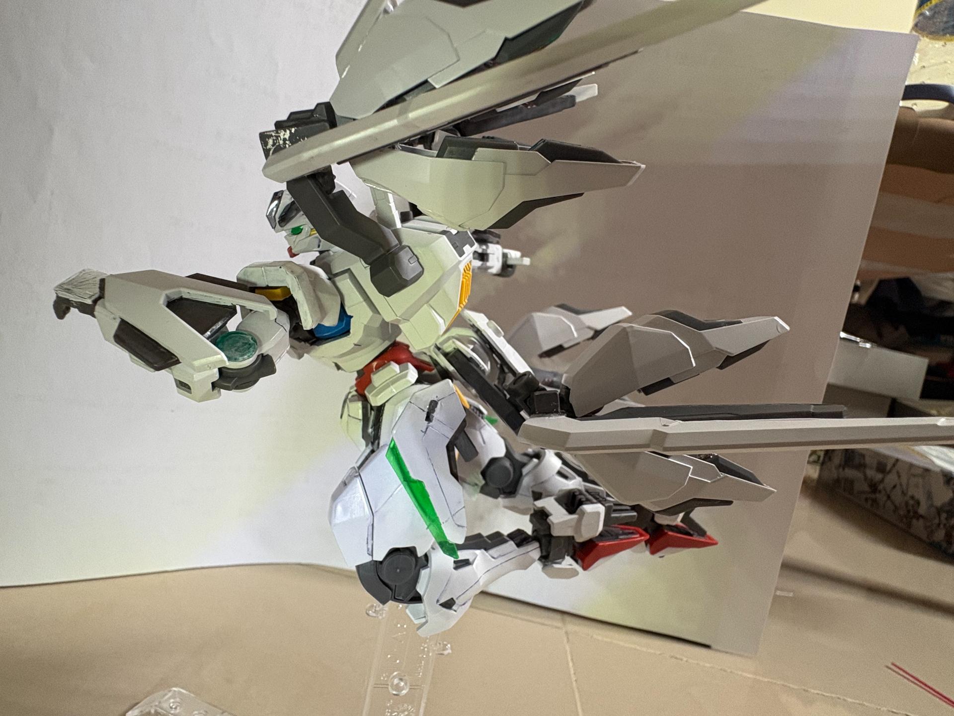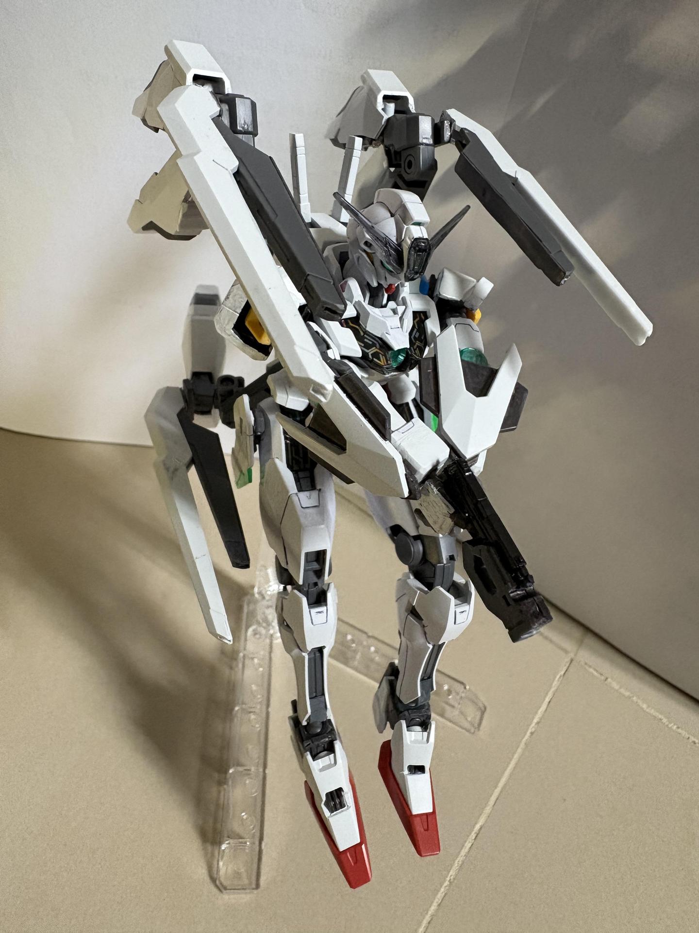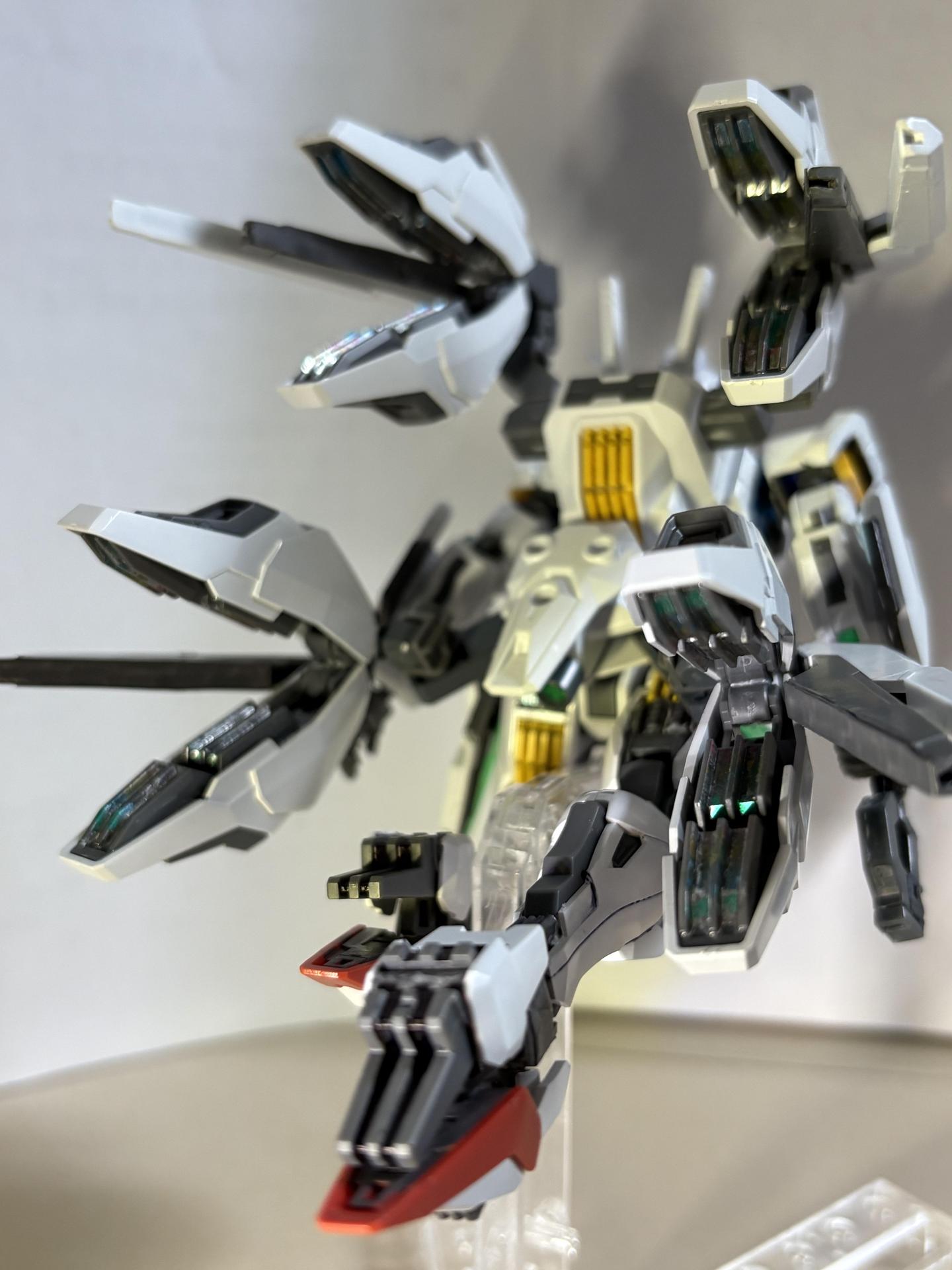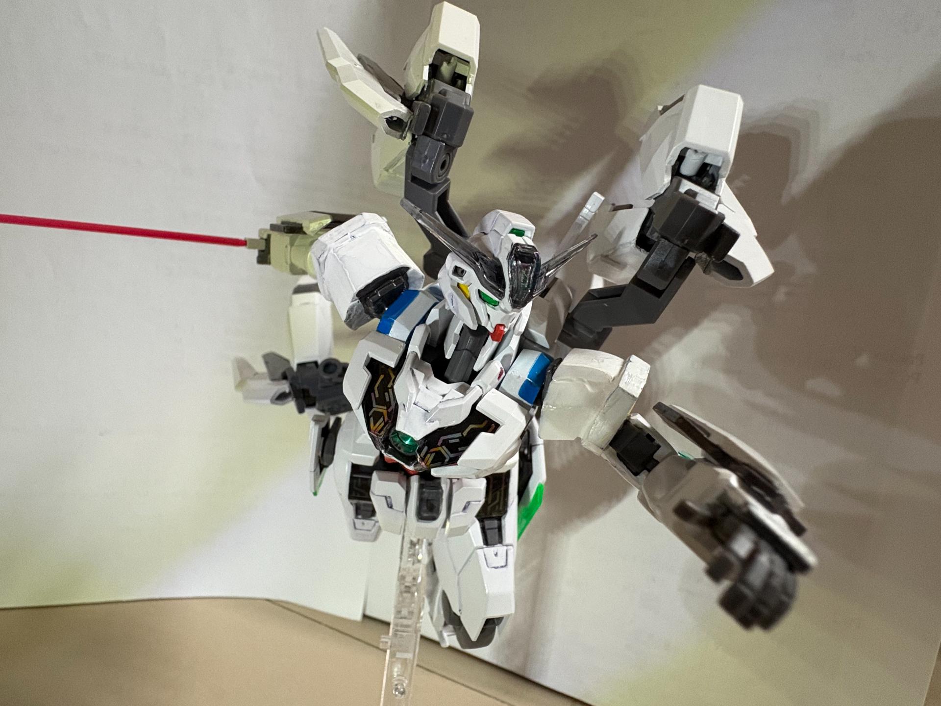 下掛式GN光束衝鋒槍模組是用RG能天使的大型GN劍裡面的光束槍改成的,而槍則是壽屋發售的創採少女庭園用的Mk23手槍。