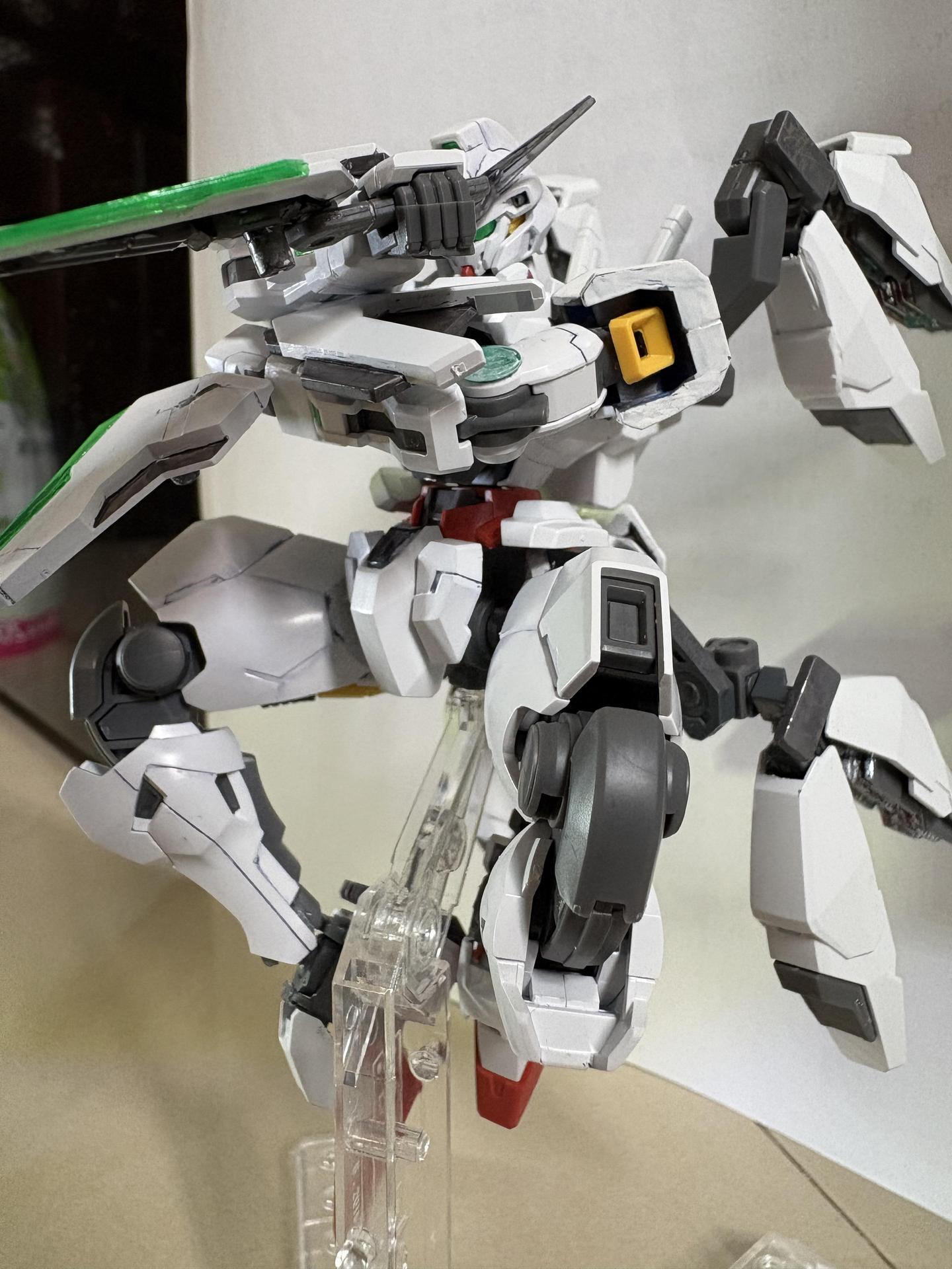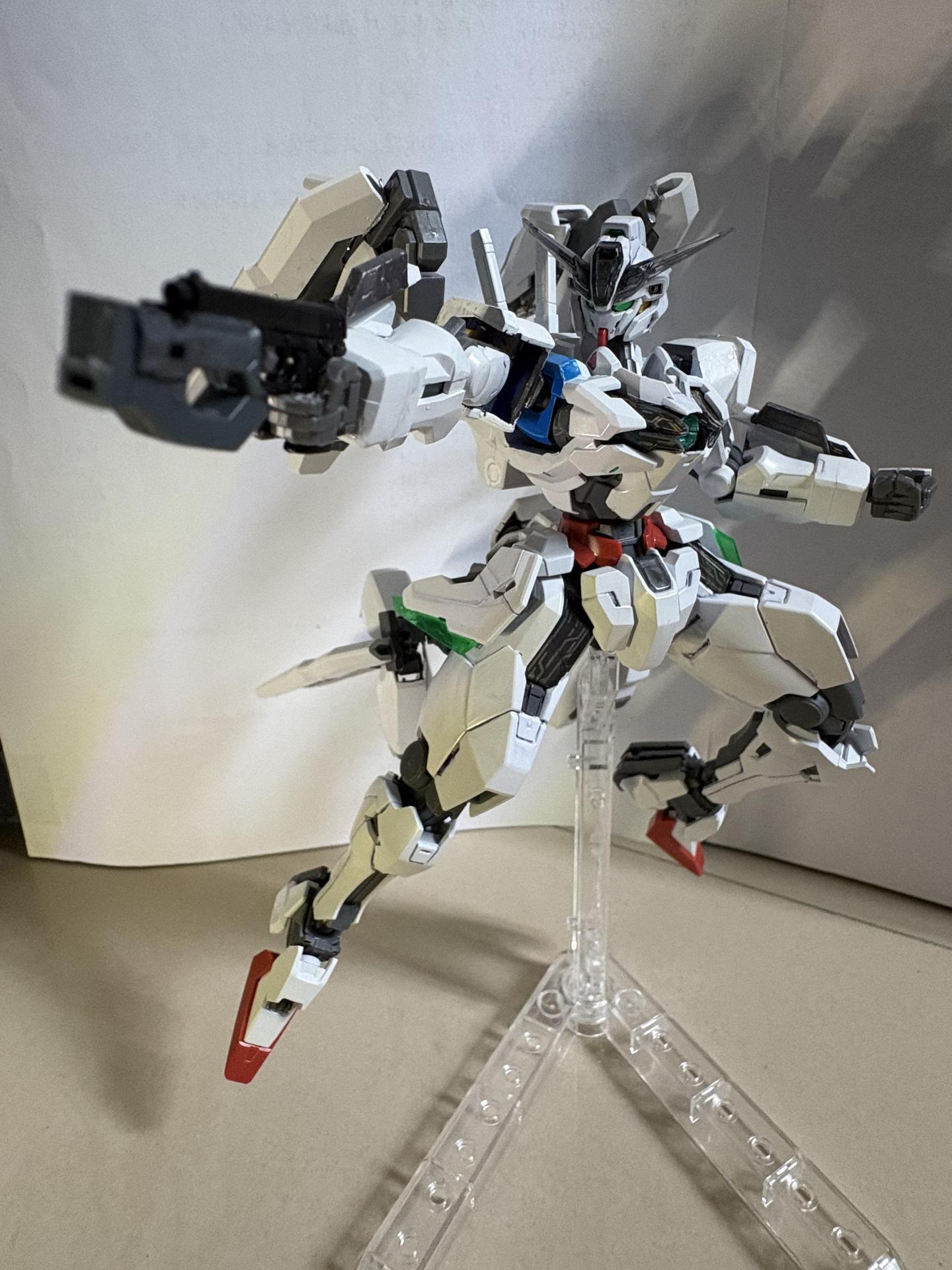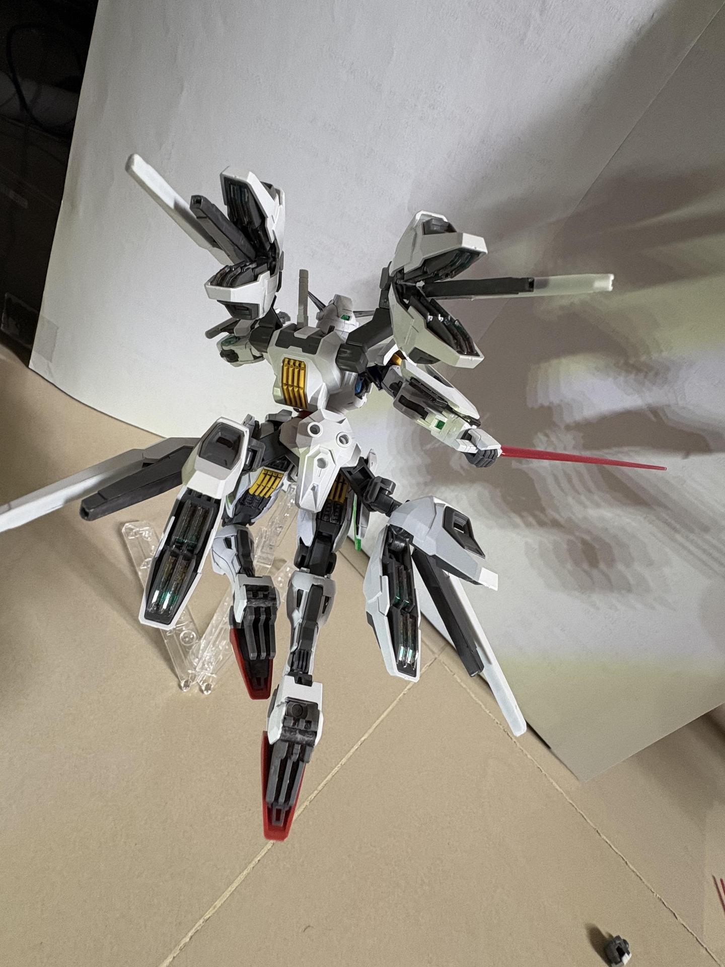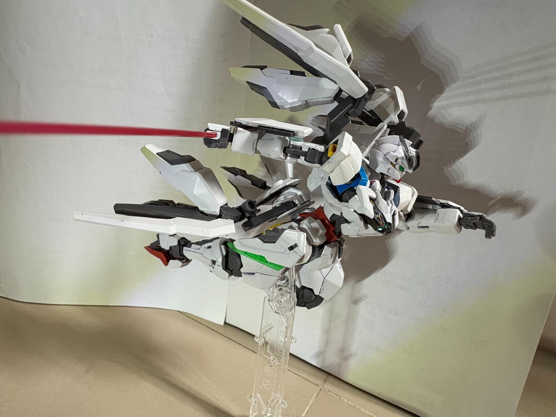 下掛式GN光束衝鋒槍模組是用RG能天使的大型GN劍裡面的光束槍改成的,而槍則是壽屋發售的創採少女庭園用的Mk23手槍。