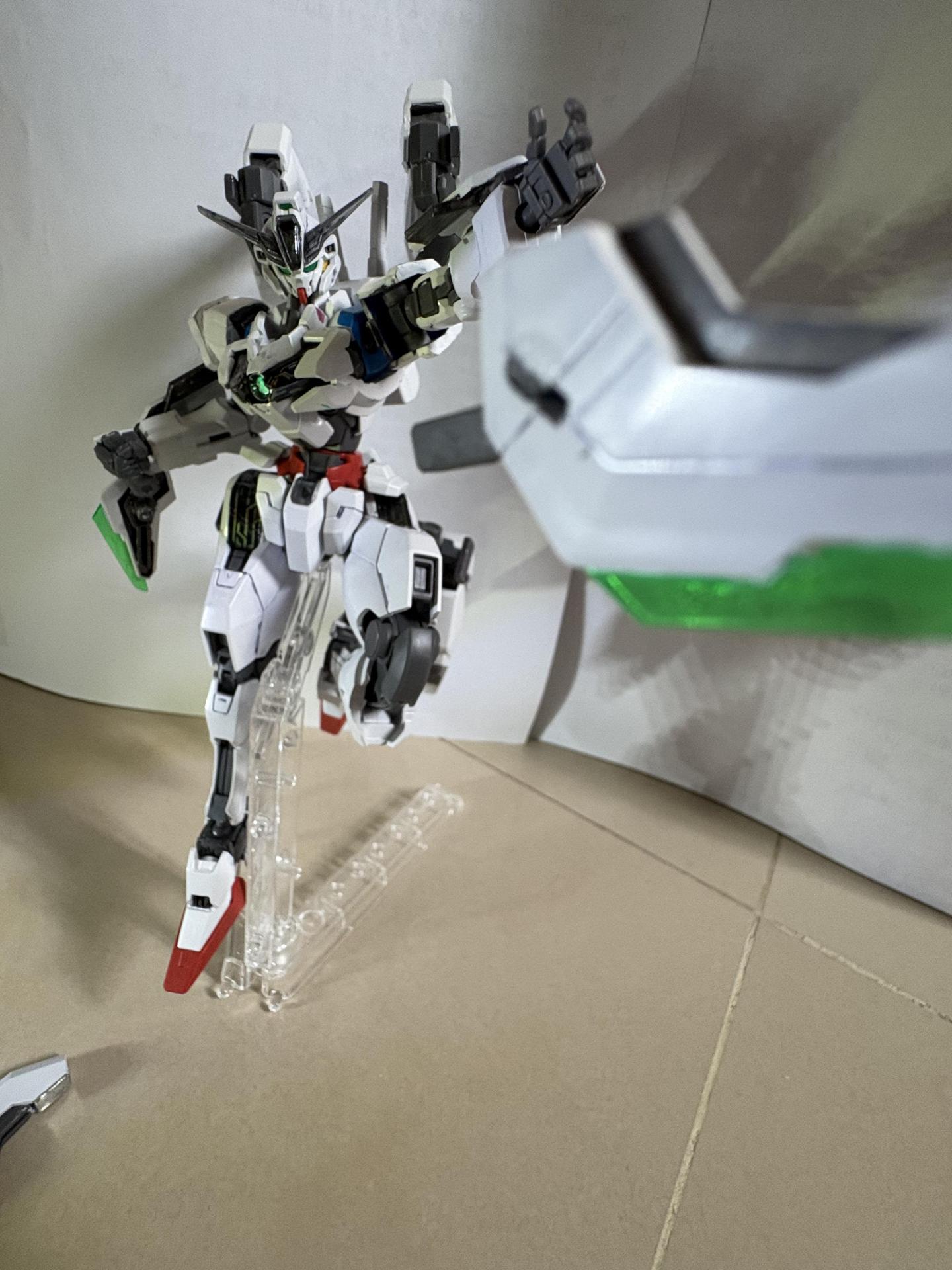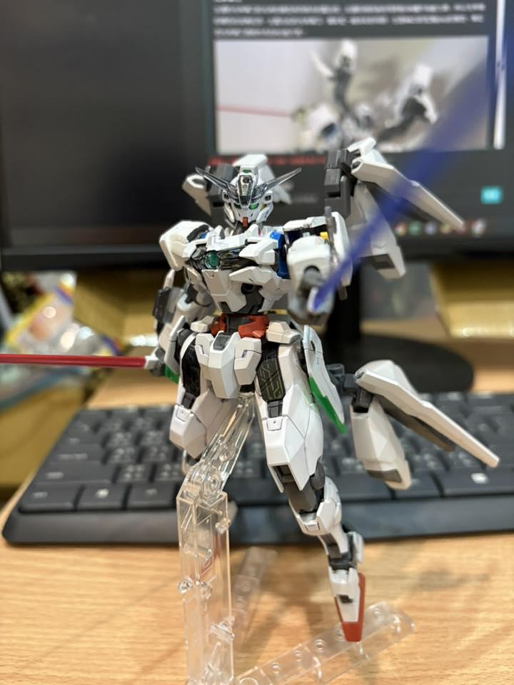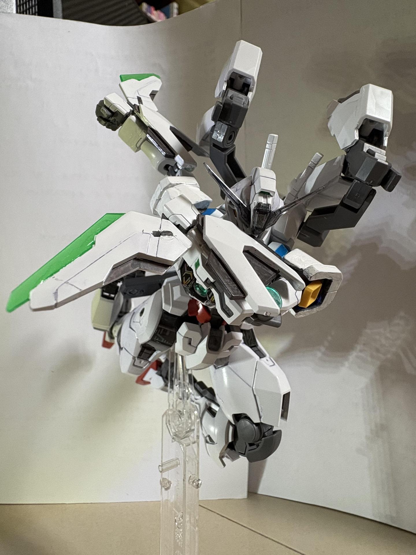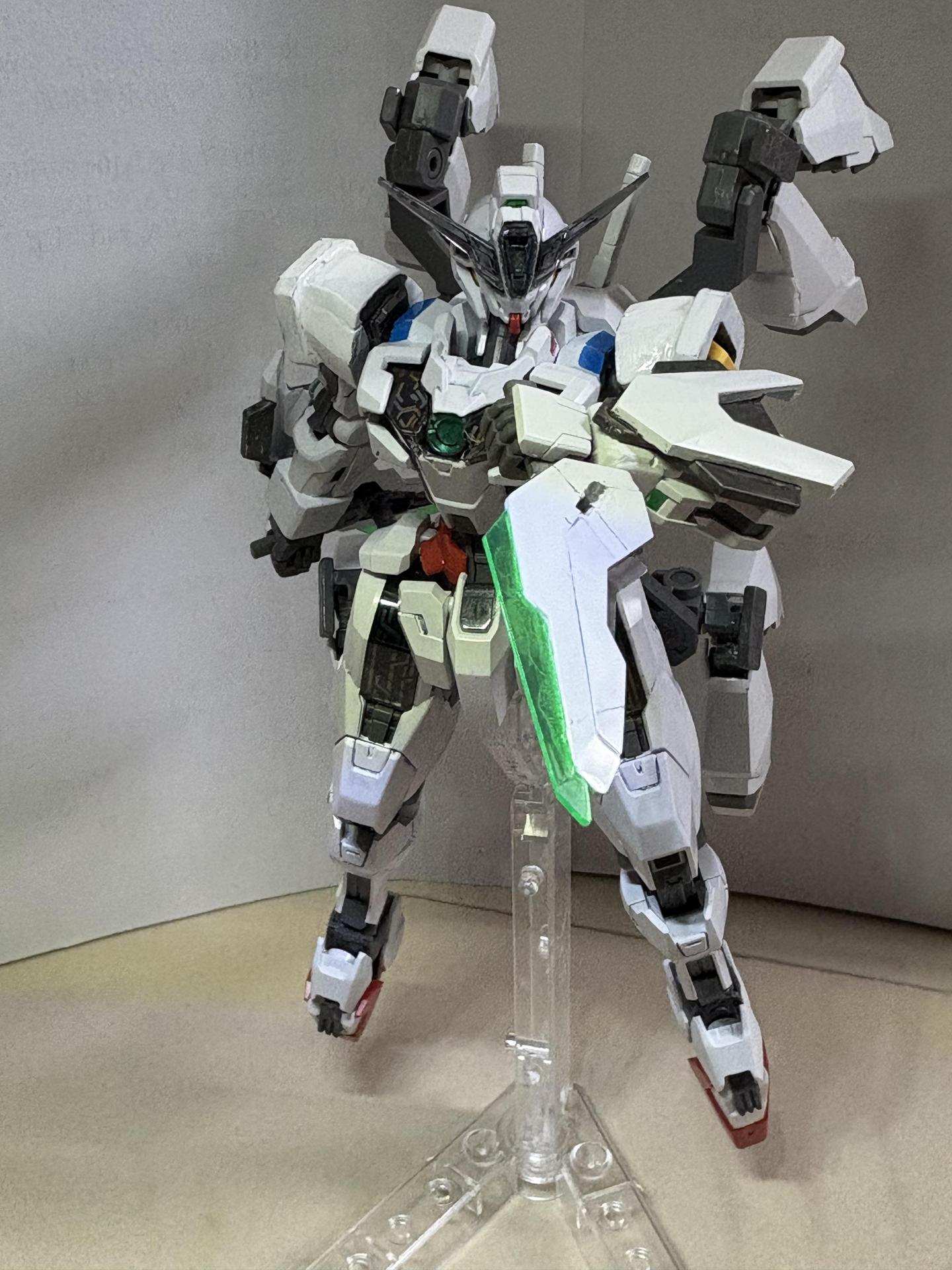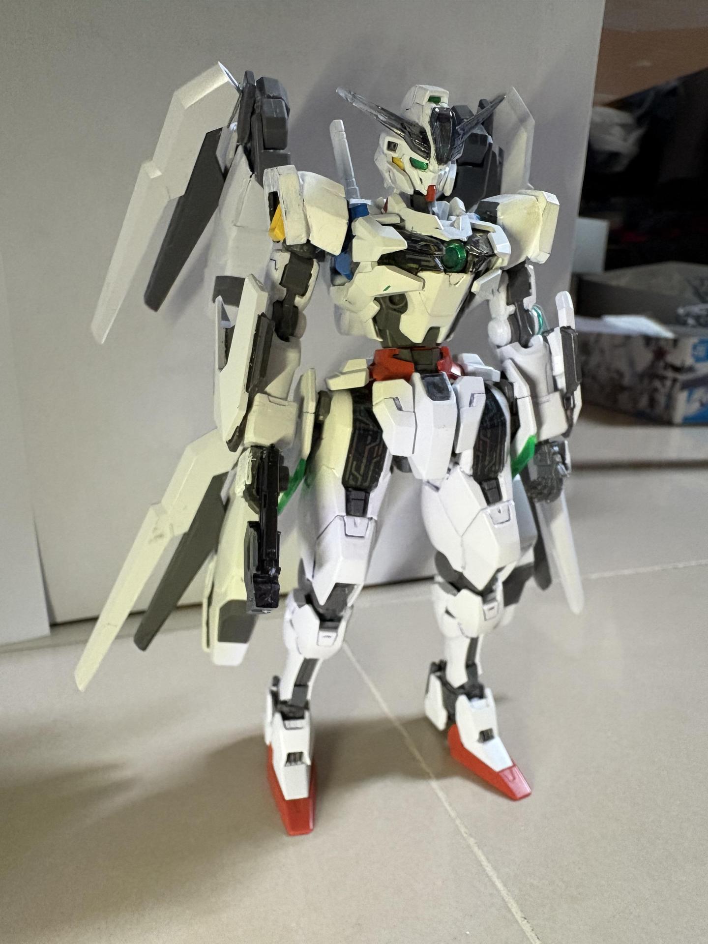 下掛式GN光束衝鋒槍模組是用RG能天使的大型GN劍裡面的光束槍改成的,而槍則是壽屋發售的創採少女庭園用的Mk23手槍。