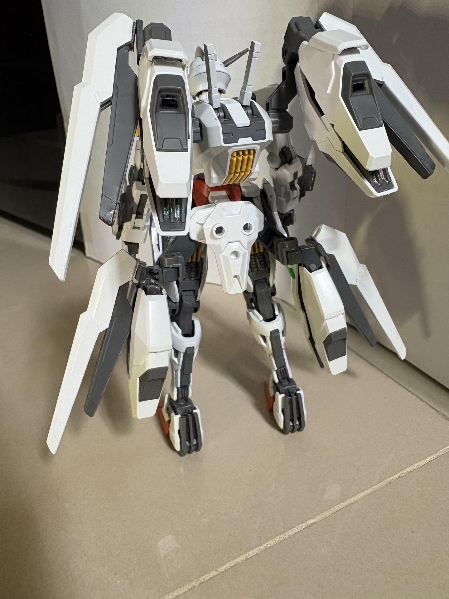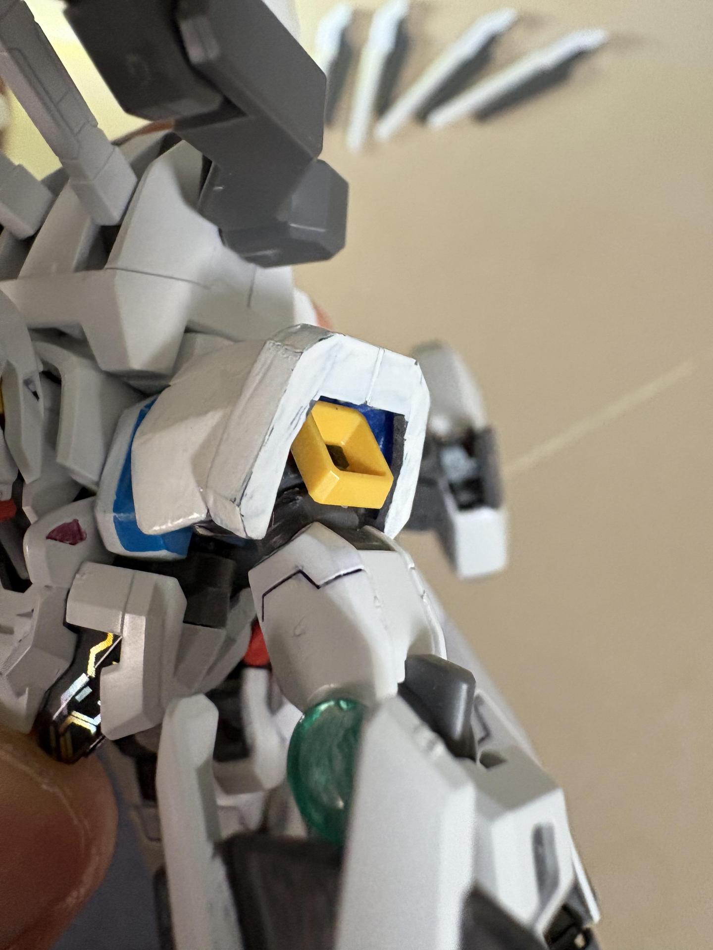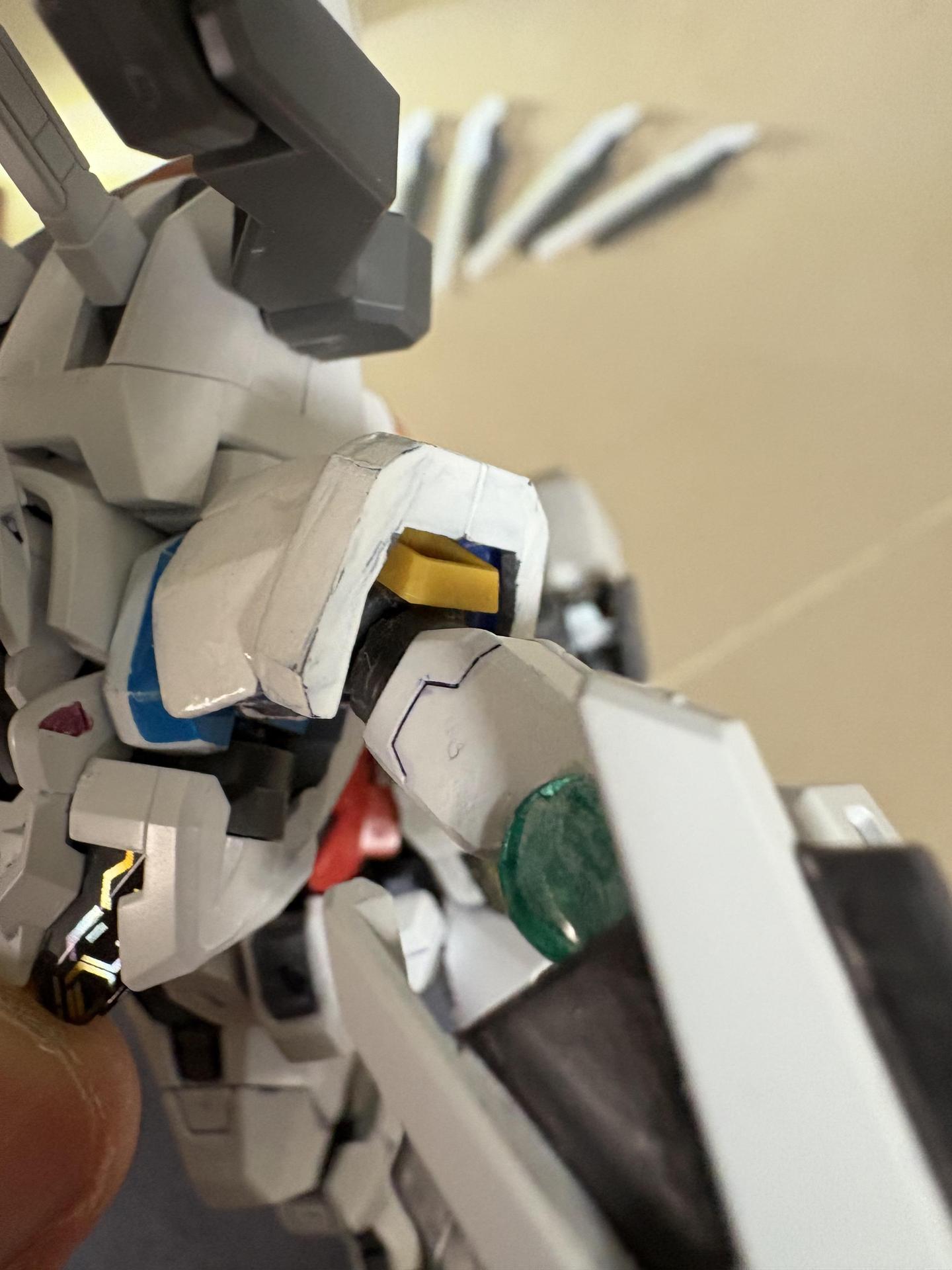 為了讓虹神星鋼彈肩膀不要這麼寬、壯碩,肩膀裝甲是用比異靈鋼彈肩甲小許多的00Q的左肩甲,並且肩膀關節也適當的改造了一下