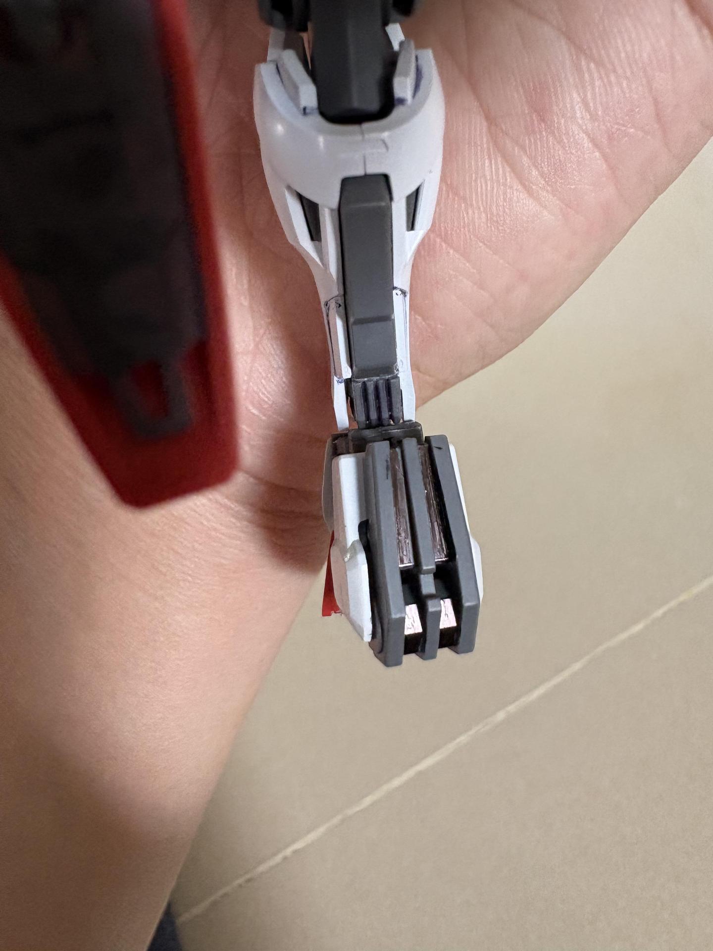 沒有要使用ELS手槍的時候,手槍可以掛載在臀部後方的光束盾的灰色連接件上。這個灰色的連接件是用廢框架做的,剛做好後測試時不小心把手槍的護弓撐斷了QwQ,所以改插在下掛模組的空洞上
