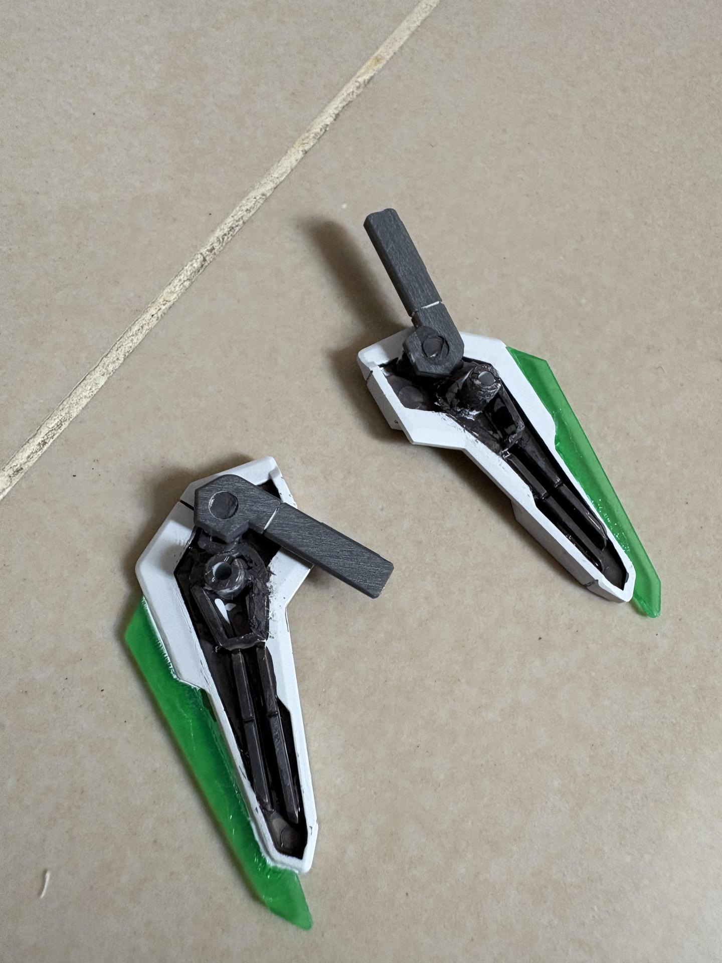 異靈鋼彈原本肩甲內的噴口沿用了,用瞬間膠黏在PC軟膠關節上,手臂平舉時會收到肩甲內。