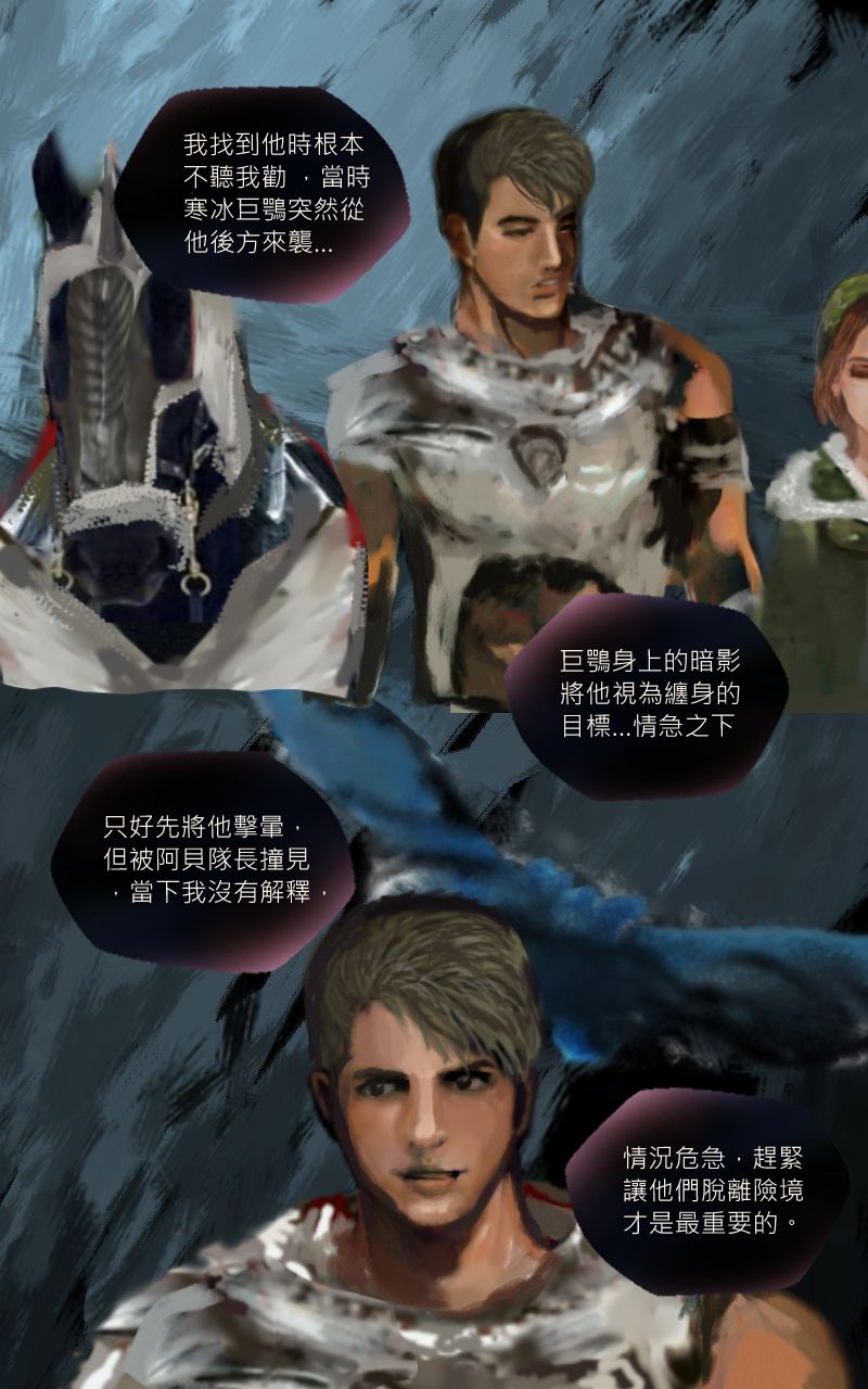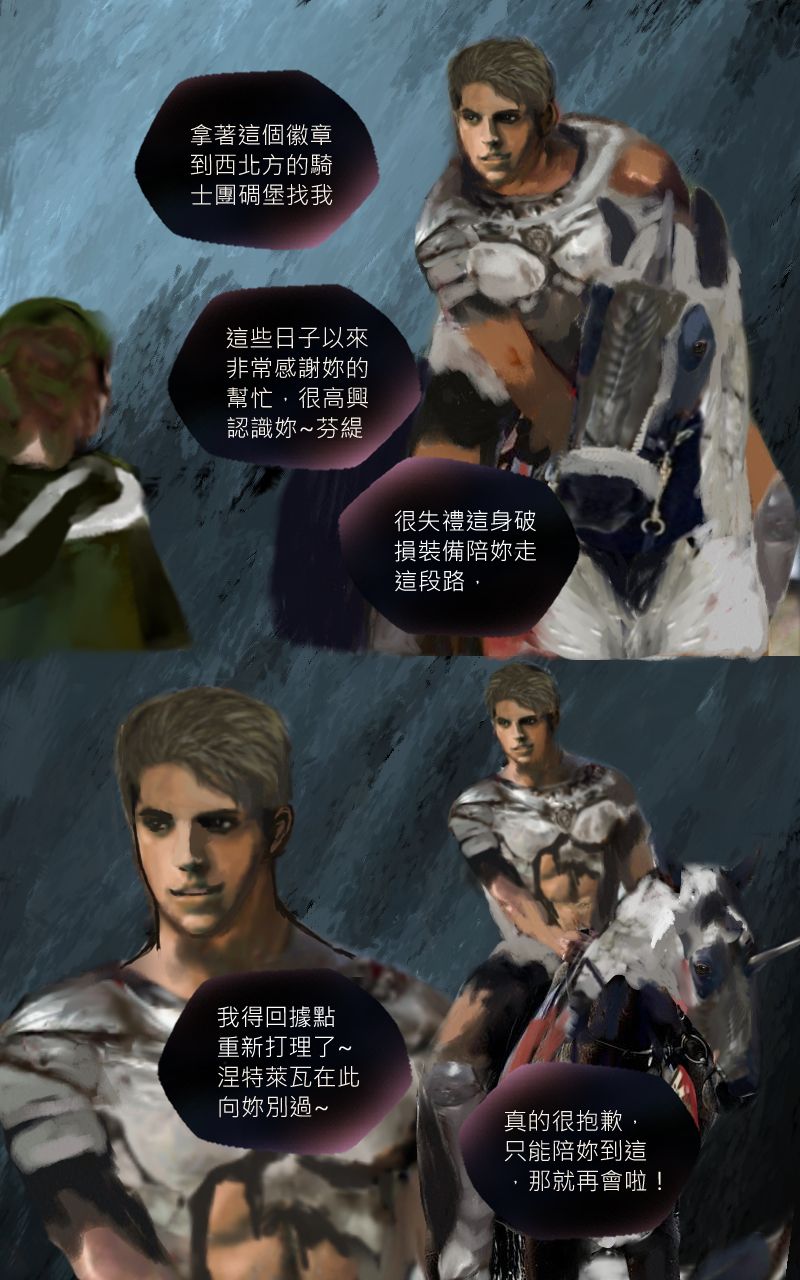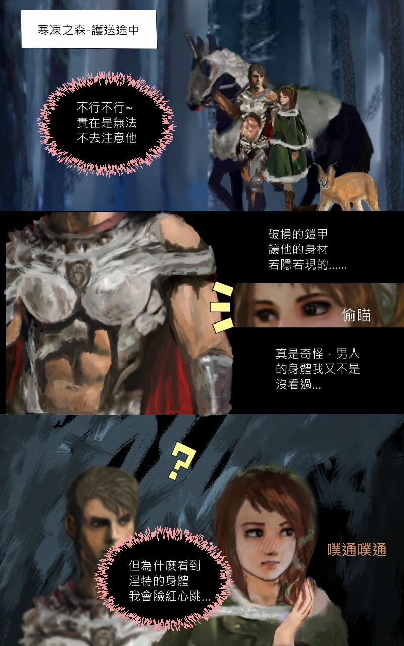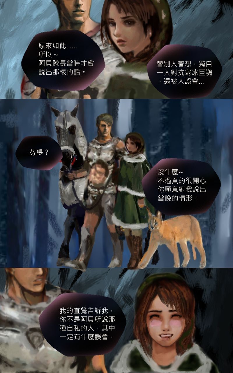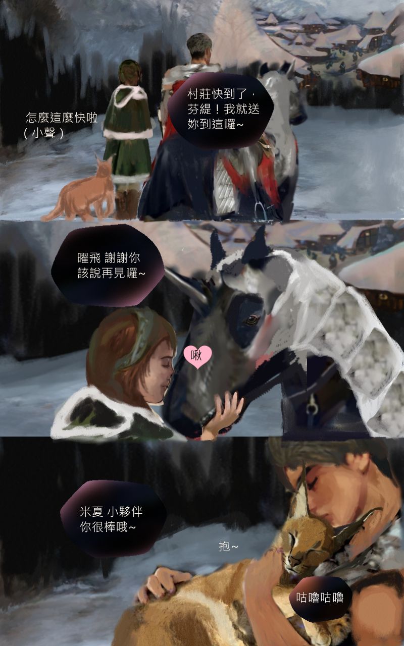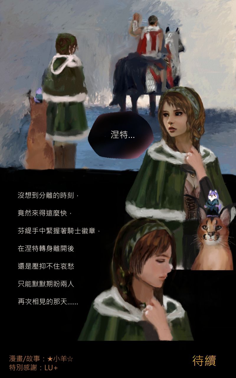 感謝井爵的贊助,因為兩人都太害羞了,所以只對各自的動物夥伴做出親密舉動~~如果回顧前幾話可以發現芬緹與曜飛見面後,涅特都是讓她騎曜飛居多,然後涅特在救了芬緹之前,同時也救了被冰困住的米夏(這情境我沒有畫出來,是在對話中提到),米夏進化變成紫電米夏,卻只能使出3次攻擊,涅特也是因為得知這個資訊後,獨自一人跳到寒冰巨鶚身上與牠搏鬥~然後要芬緹與接住變回原形的米夏,所以其實除了是暗示外,本身的舉動也是真實的在感謝彼此的動物夥伴呢~ 兩人未來一定能重逢敬請期待,祝井爵有個美好的週三~~[e35]