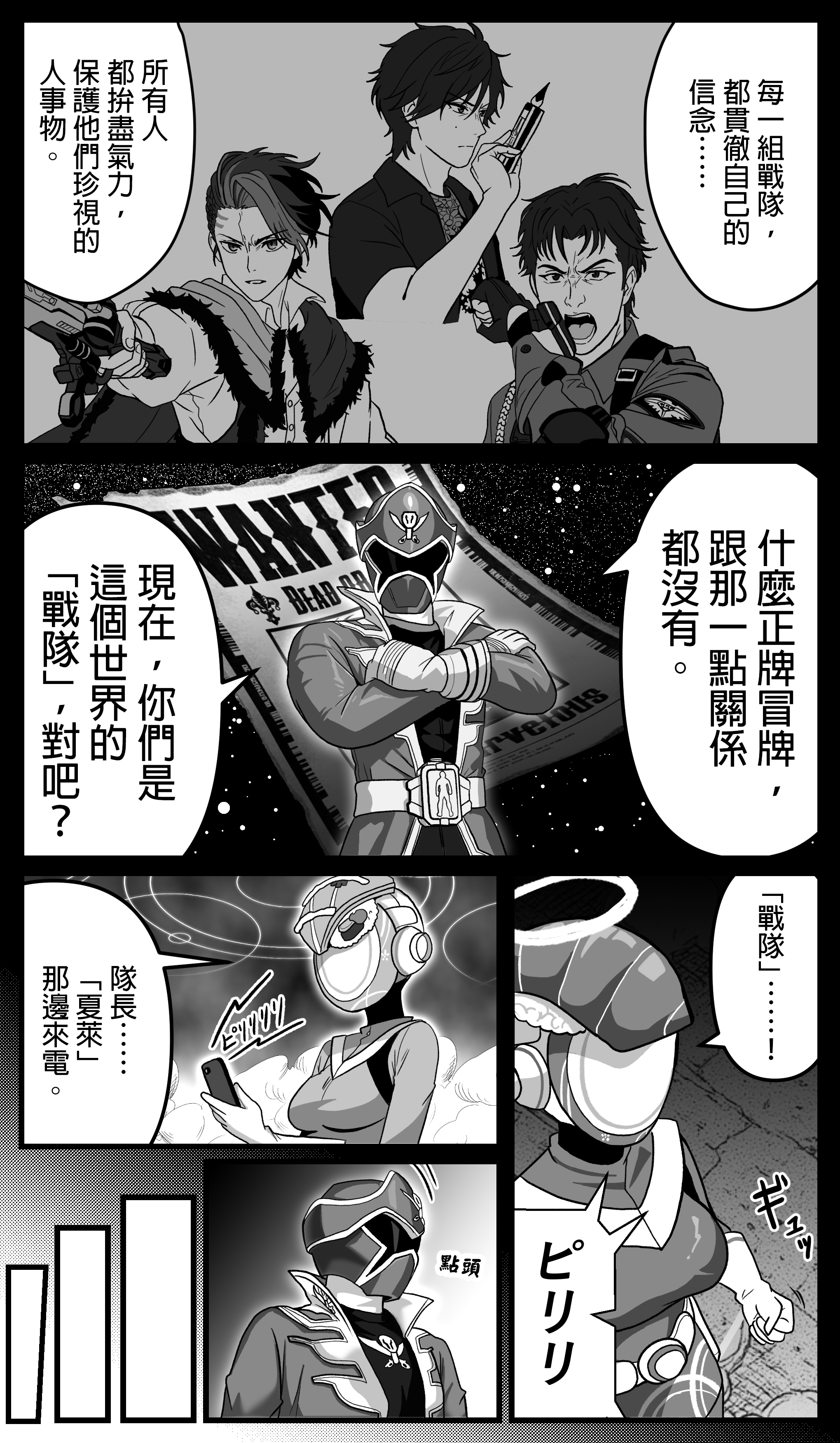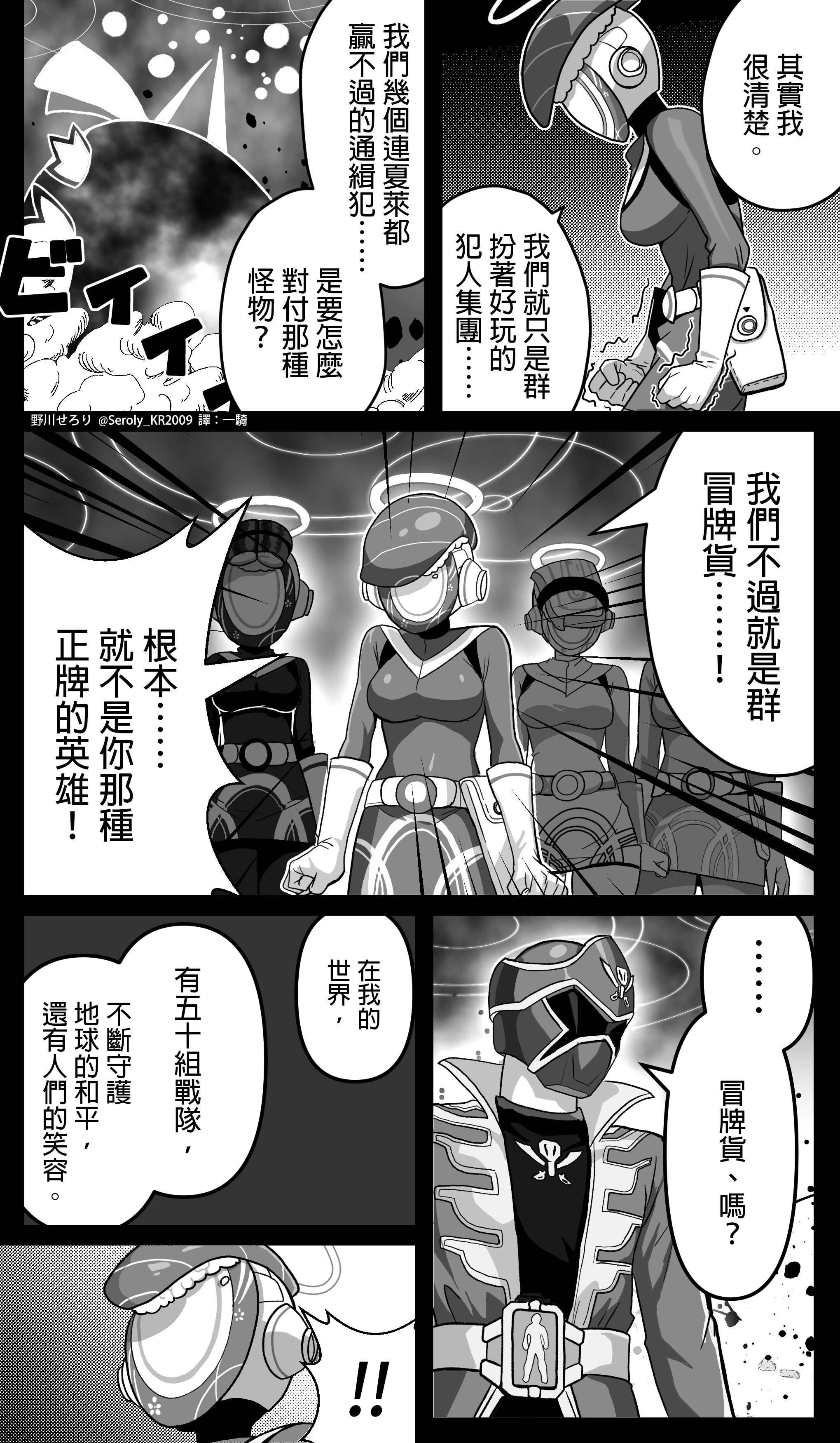 那三位也都是所謂的「冒牌貨」,左邊是君王者前期自稱邪惡之王而且搶走了原本紅國的變身器成為君王者,中間侍戰隊的殿下是本尊的影武者,右邊是時間連者的時間火焰,其原本變身者因為擔心自己未來會死(因為未來時間火焰的變身者會有死亡的歷史)所以設計讓別人頂替,然後海賊也都是所謂的「冒牌貨」