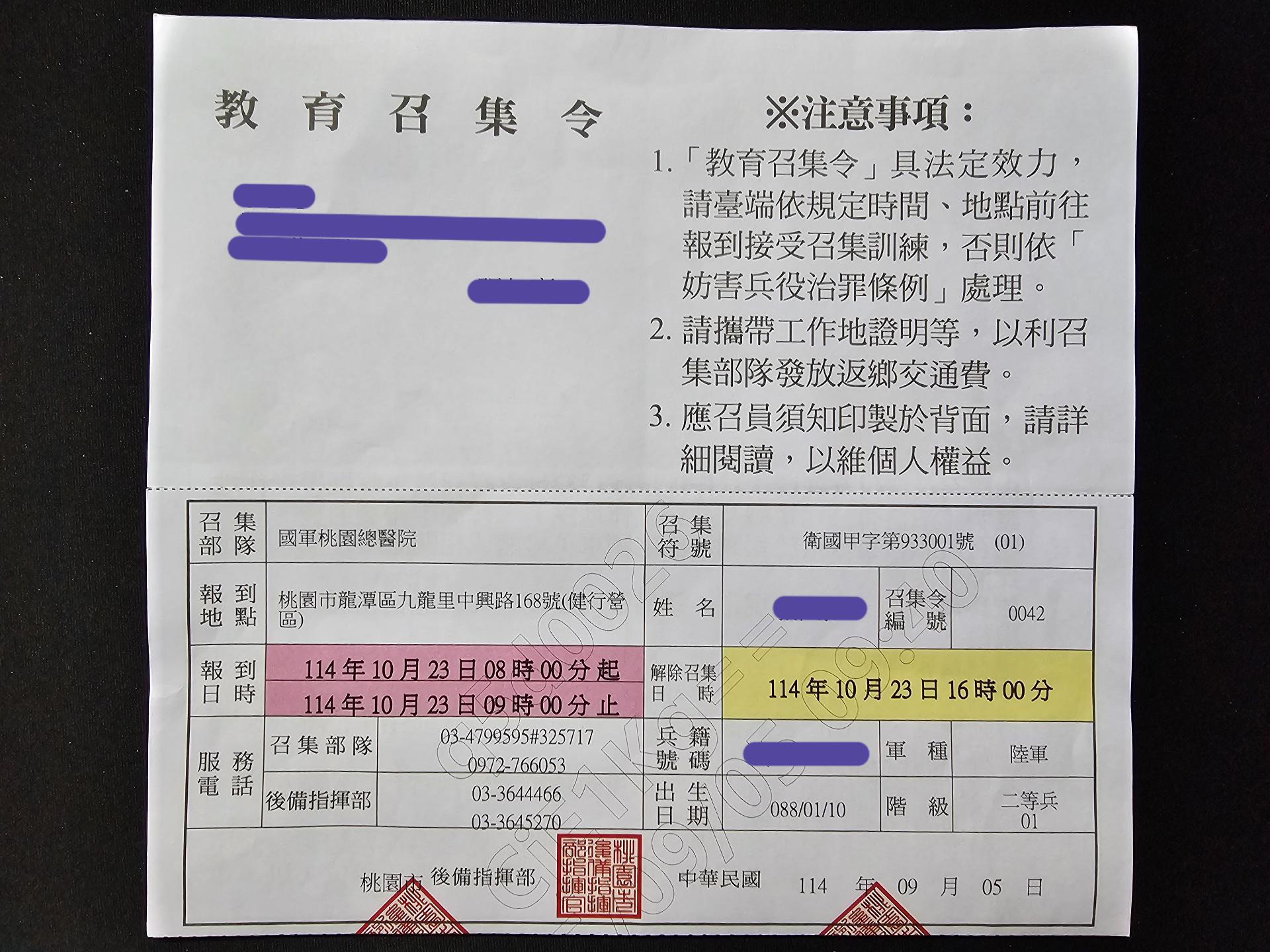 召集地點在「國軍桃園總醫院健行營區」