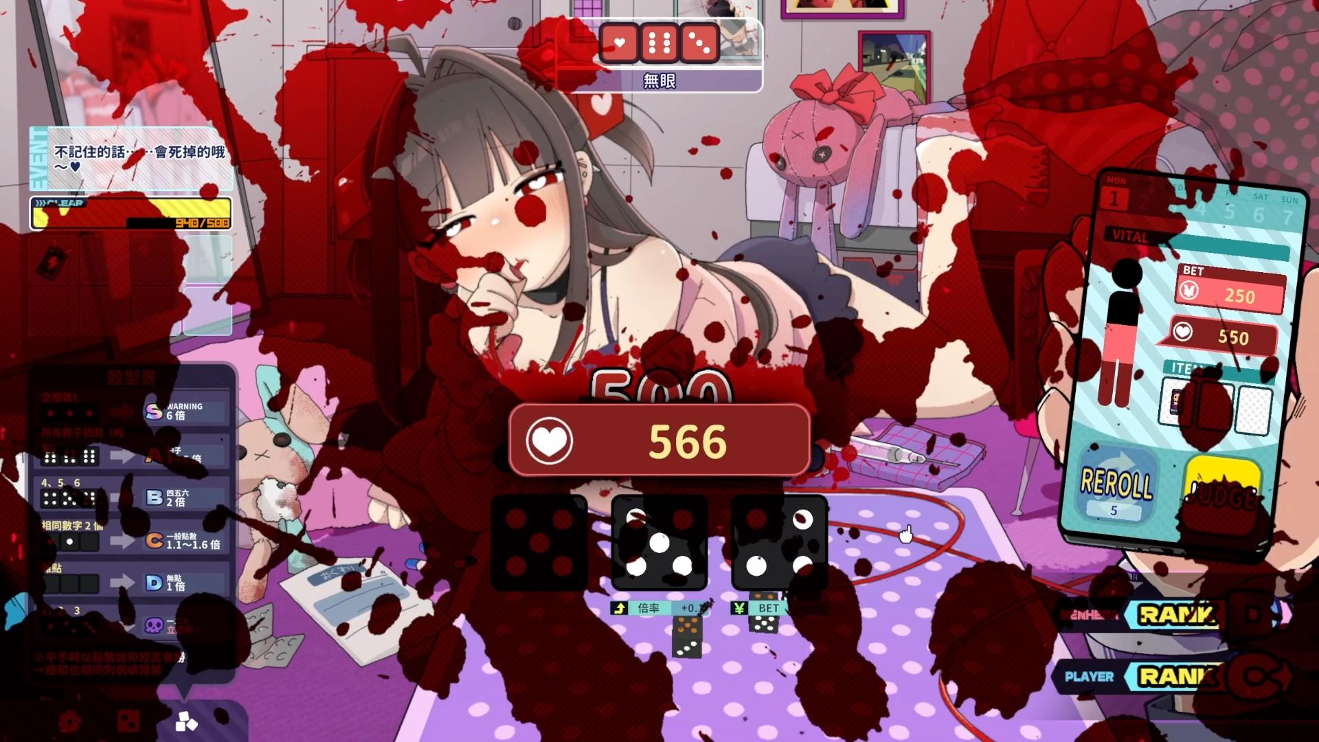 而以試玩版訂下的遊戲目標來看,第一天要達到500分,第二天2500分,到了第三天竟然要12500分才能過?我玩了兩局,就很確定要得到12500分幾乎是天方夜譚,除了要靠賽骰出夠大的牌型,還要抵抗來自病嬌和骰面附帶的負面效果,這些負面效果,還可能讓玩家更多血!