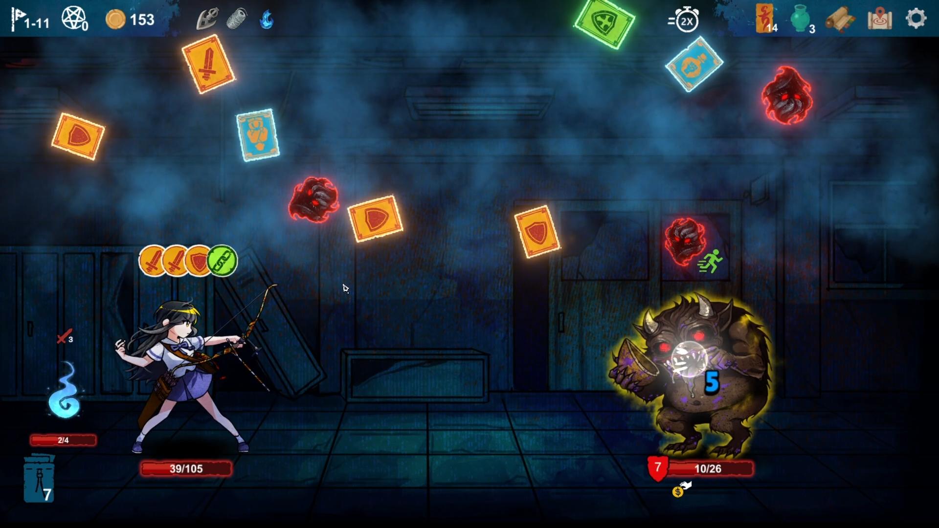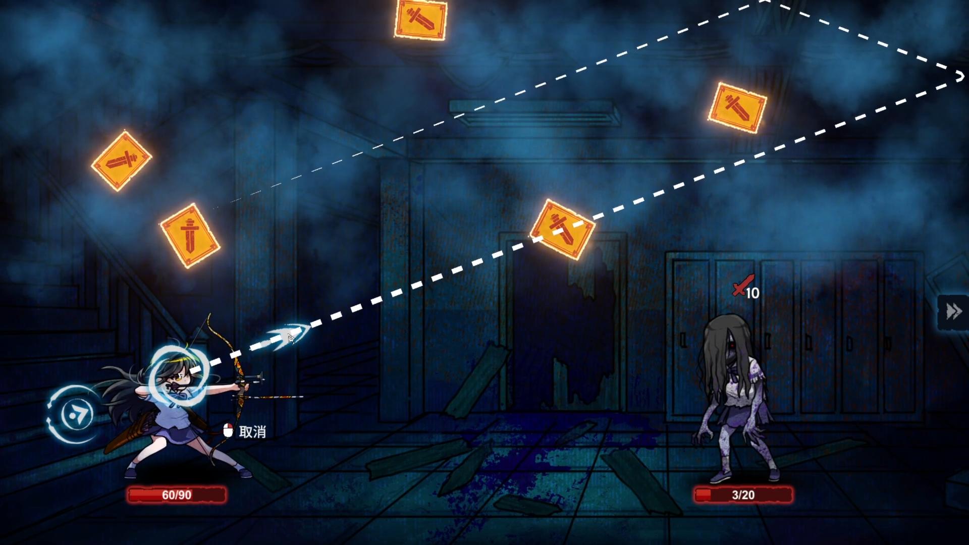 玩法:在無盡的午夜中奮戰,射箭打出卡牌,對抗徘徊校園的幽魂。