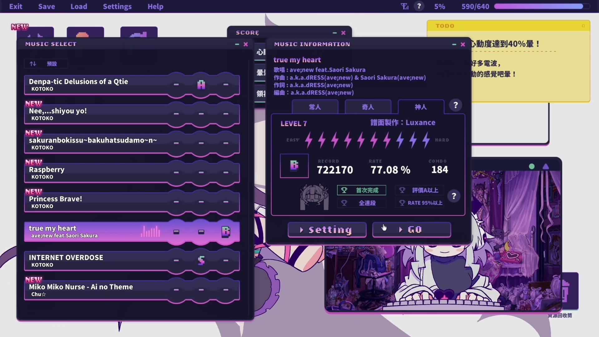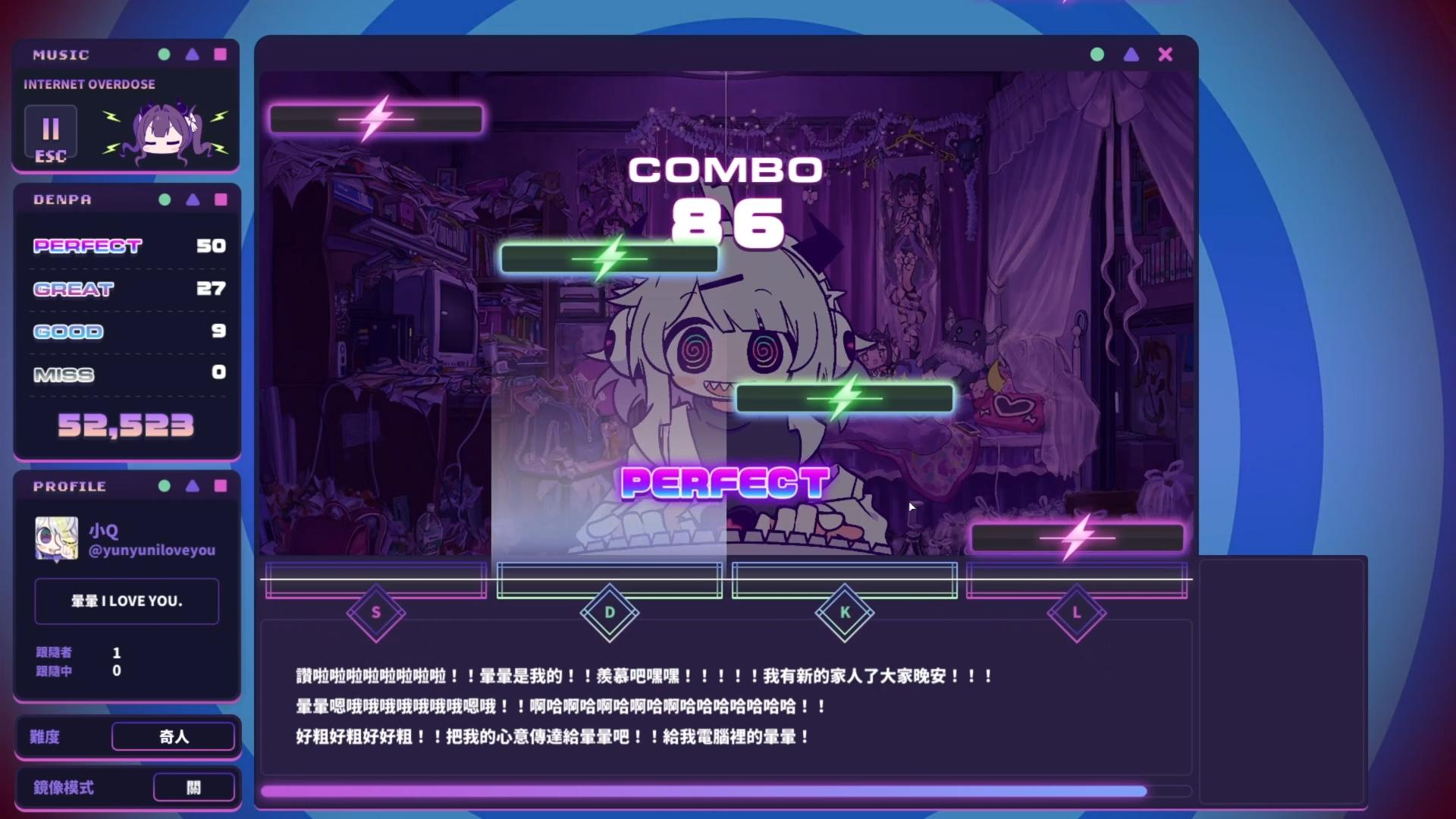玩家在打歌時,這位宅女還在畫面下方,隨著玩家的按鍵同步打字,發出各種電波留言,打歌的過程中都能聽到她源源不絕的敲鍵盤聲,還蠻有趣的。