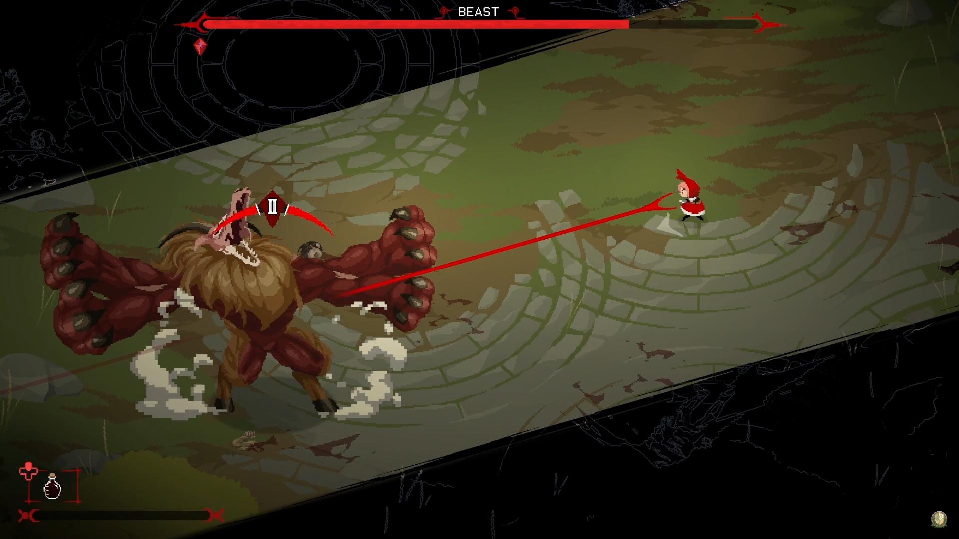 從試玩版的內容來看,這會是一款BOSS RUSH的作品,而且畫面還出乎意料的血腥!?與第一個BOSS相遇的時候,就能看到BOSS在手撕成年男性了。這讓我想起了《褻瀆神明》那樣的黑暗血腥基調, 與可愛的紅眼小女孩形成一個印象深刻的反差,挺好的。