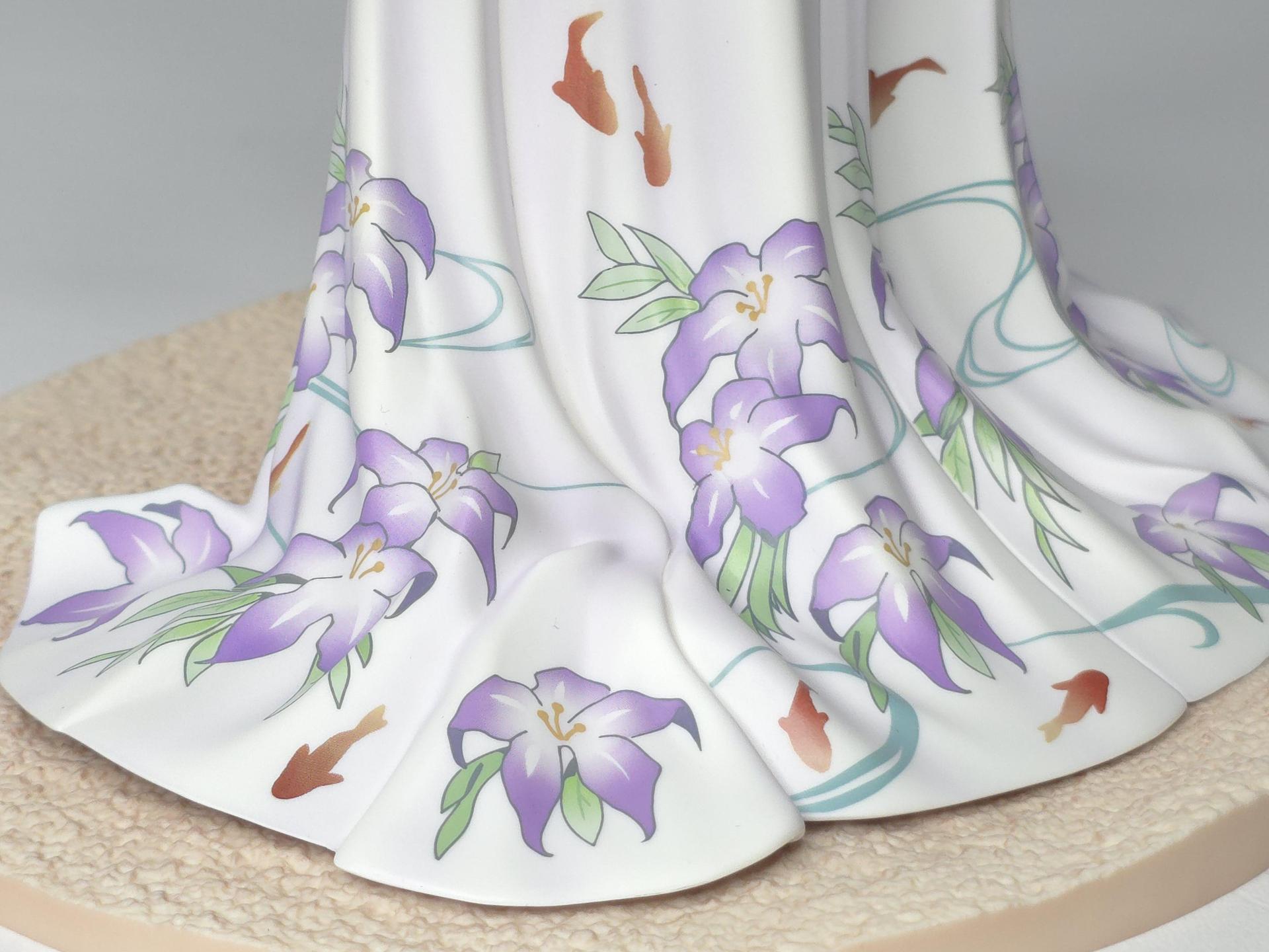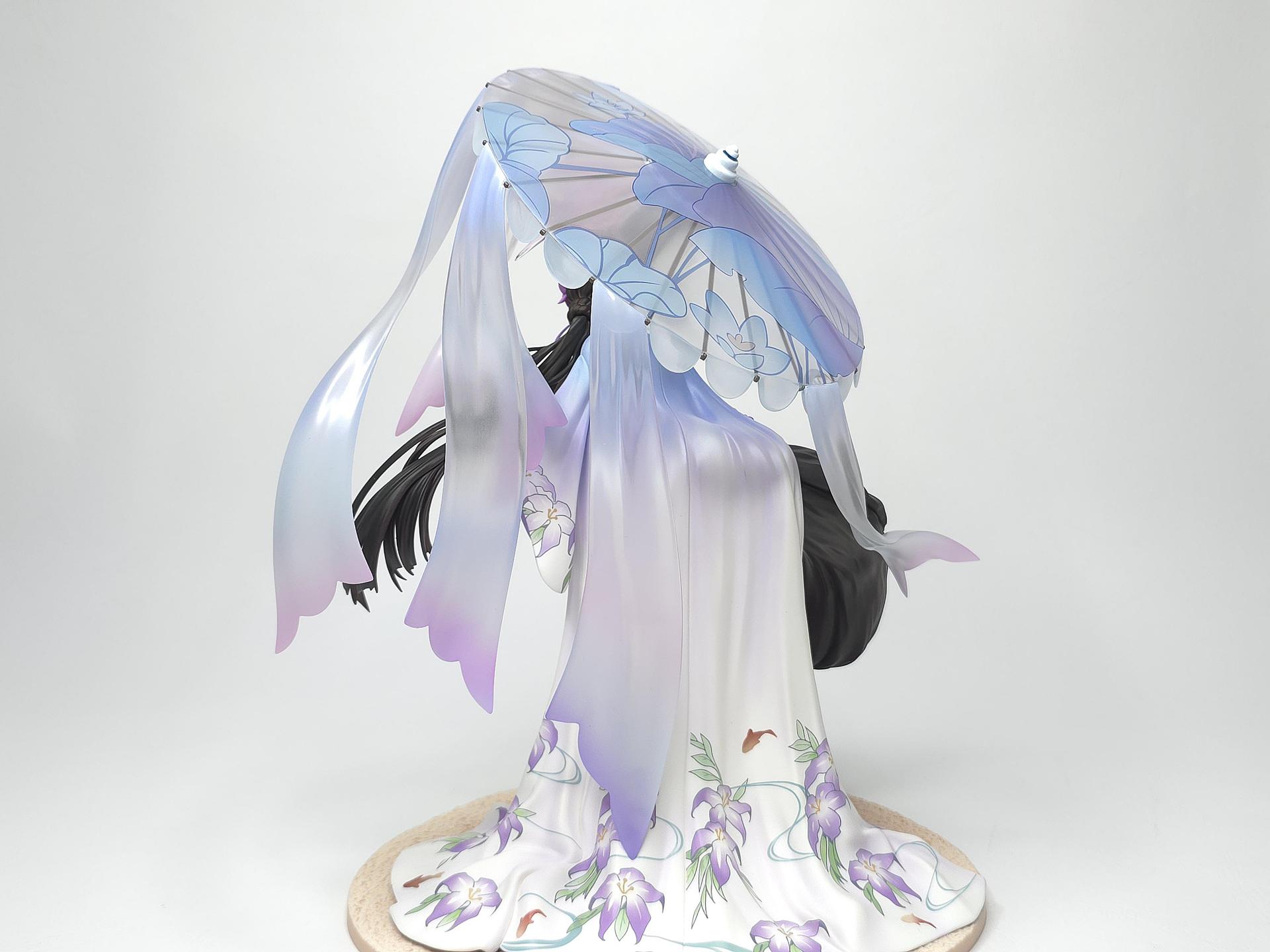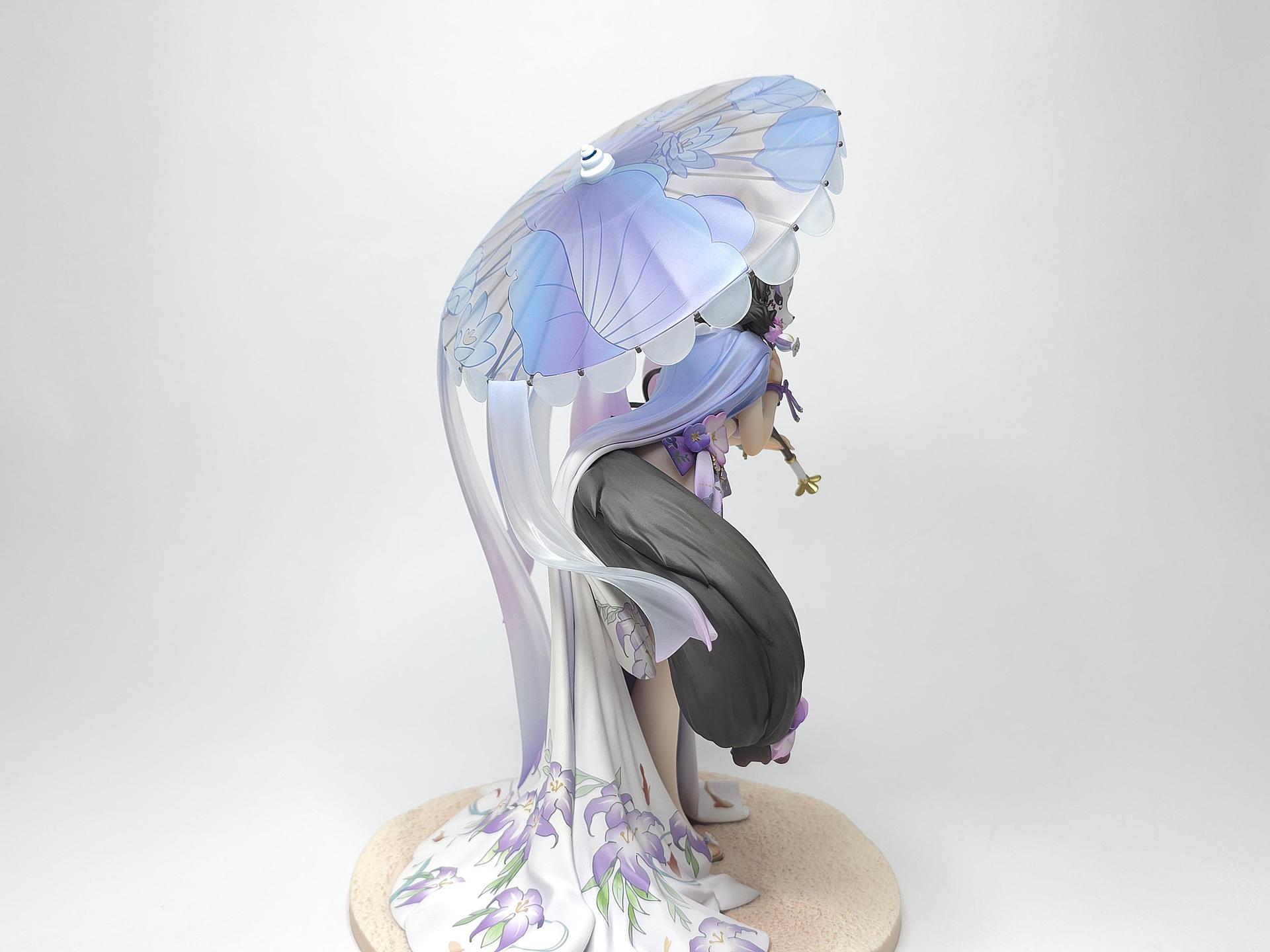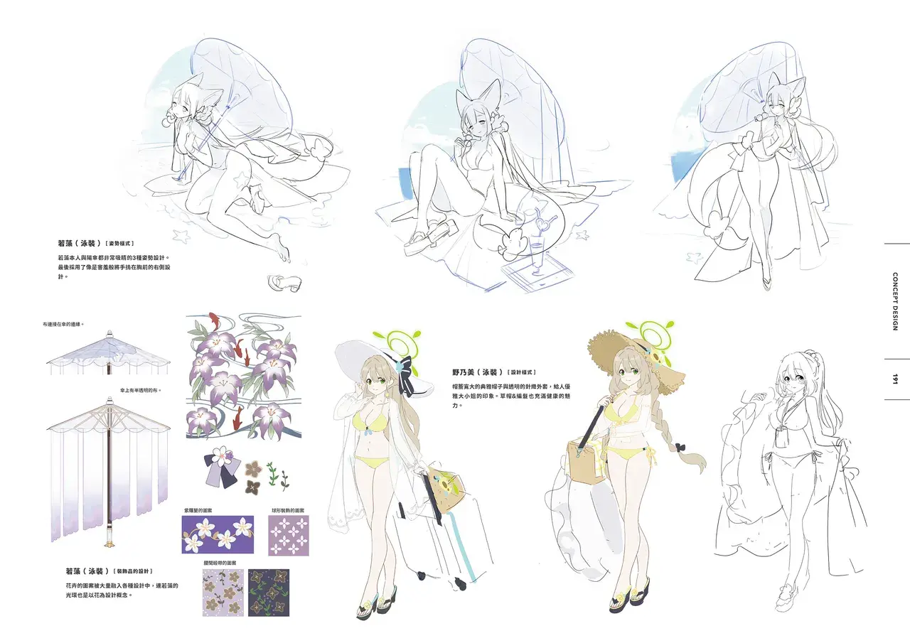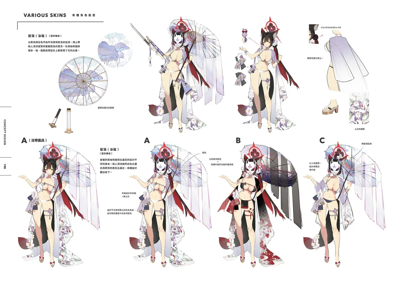 以黑色與紅色作為平日穿搭配色的若藻,換上帶給人清涼感受的紫藍配色的夏衣。在振袖和服與陽傘、槍、裝飾品等設計上都使用了花的元素。