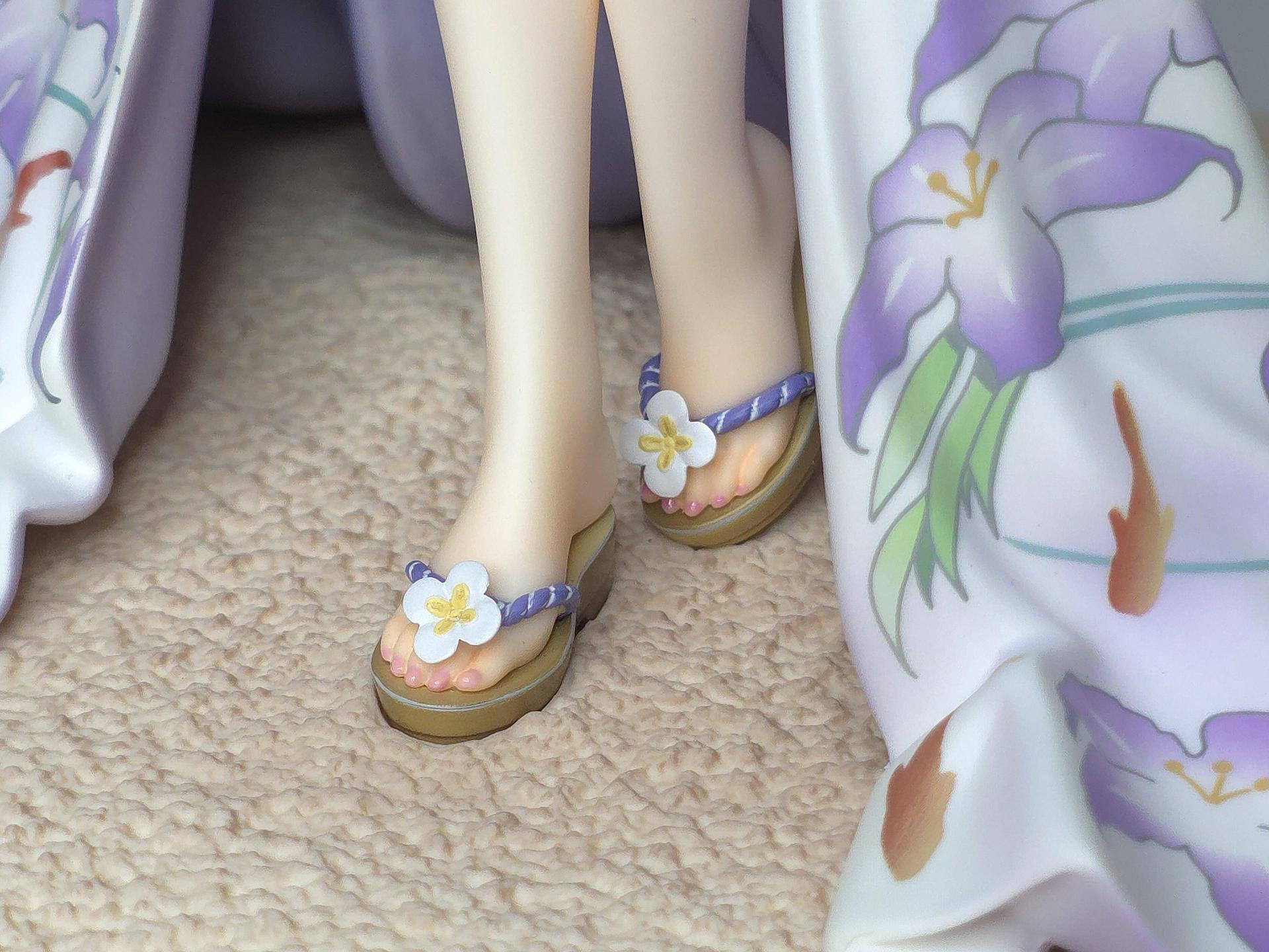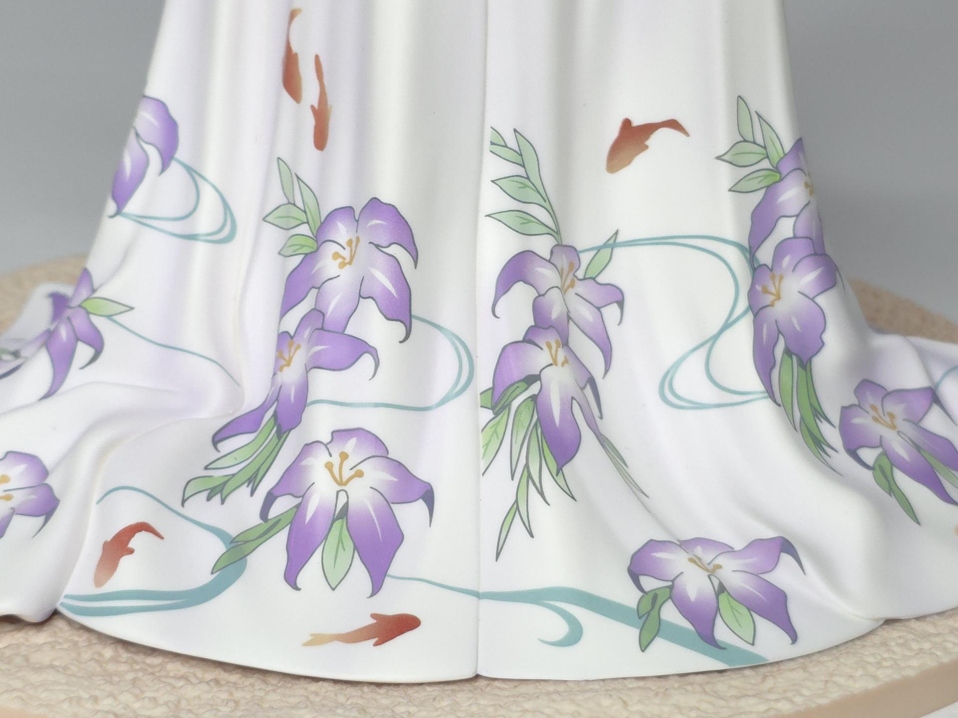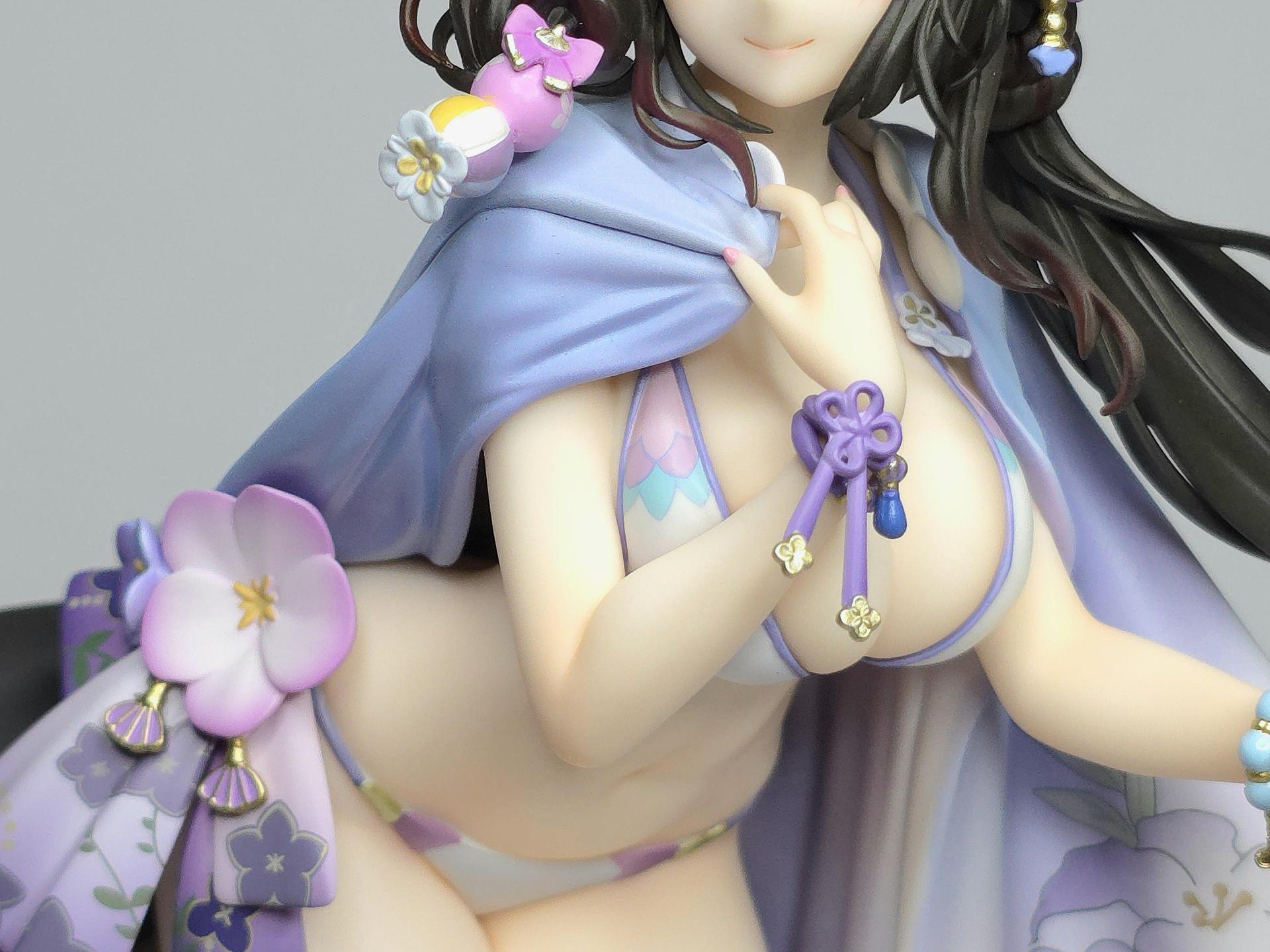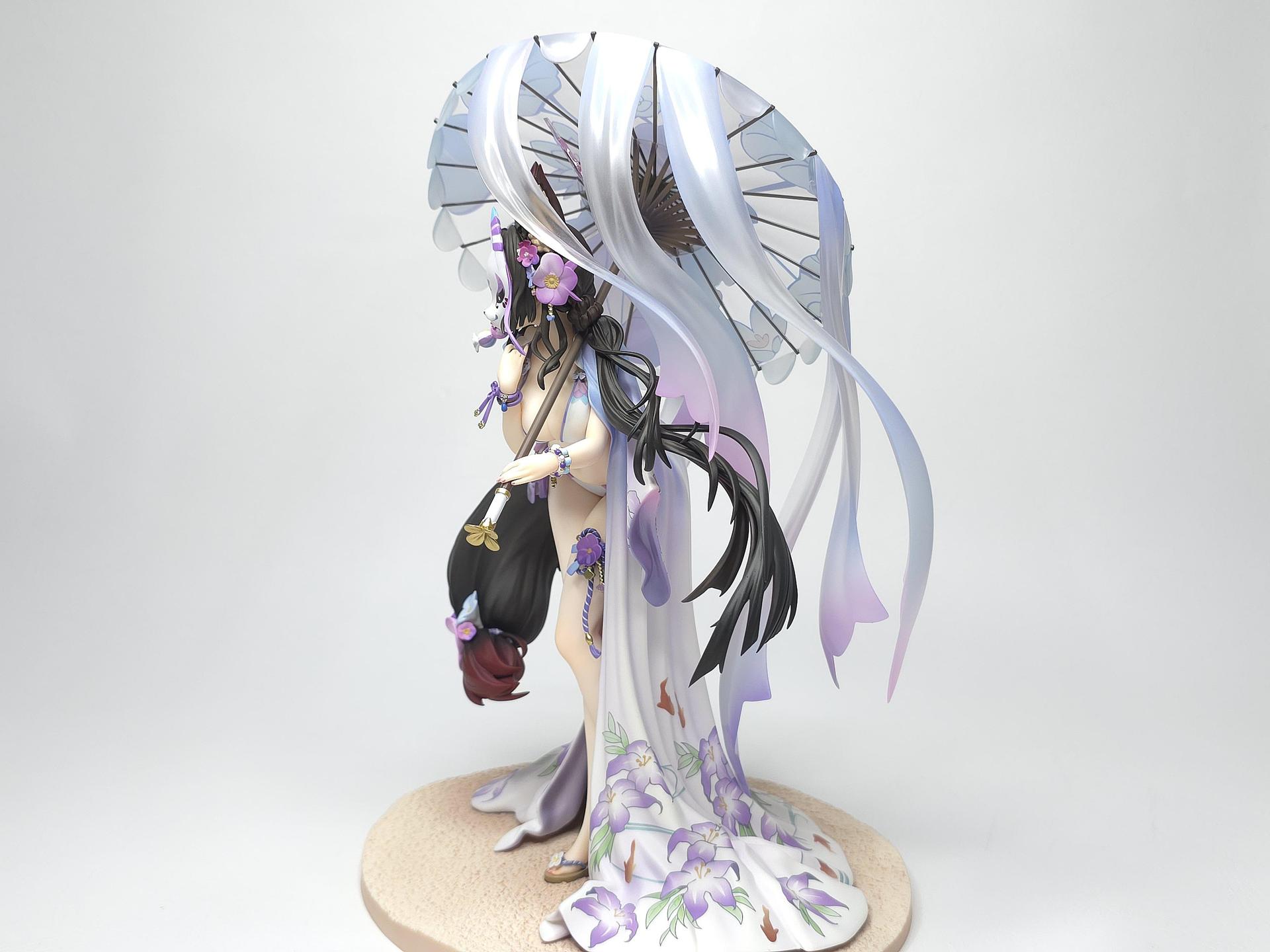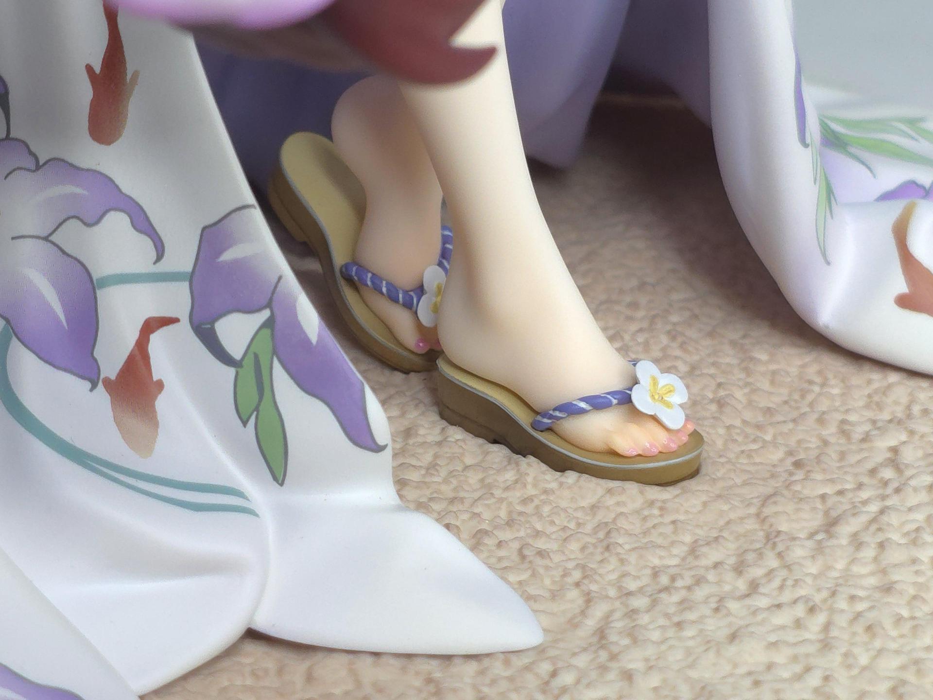 以黑色與紅色作為平日穿搭配色的若藻,換上帶給人清涼感受的紫藍配色的夏衣。在振袖和服與陽傘、槍、裝飾品等設計上都使用了花的元素。
