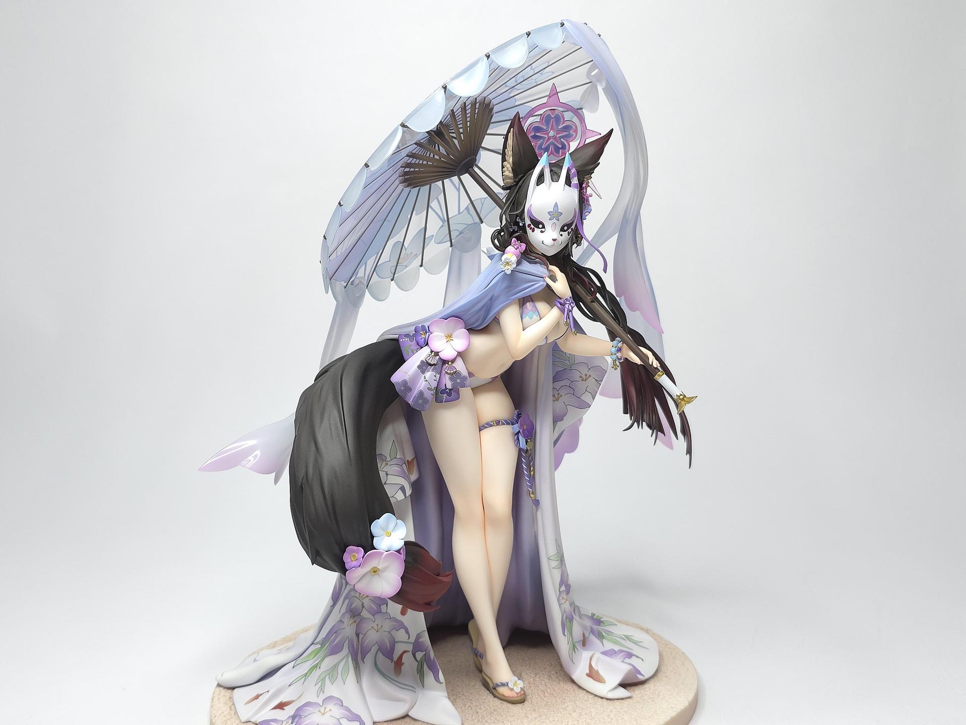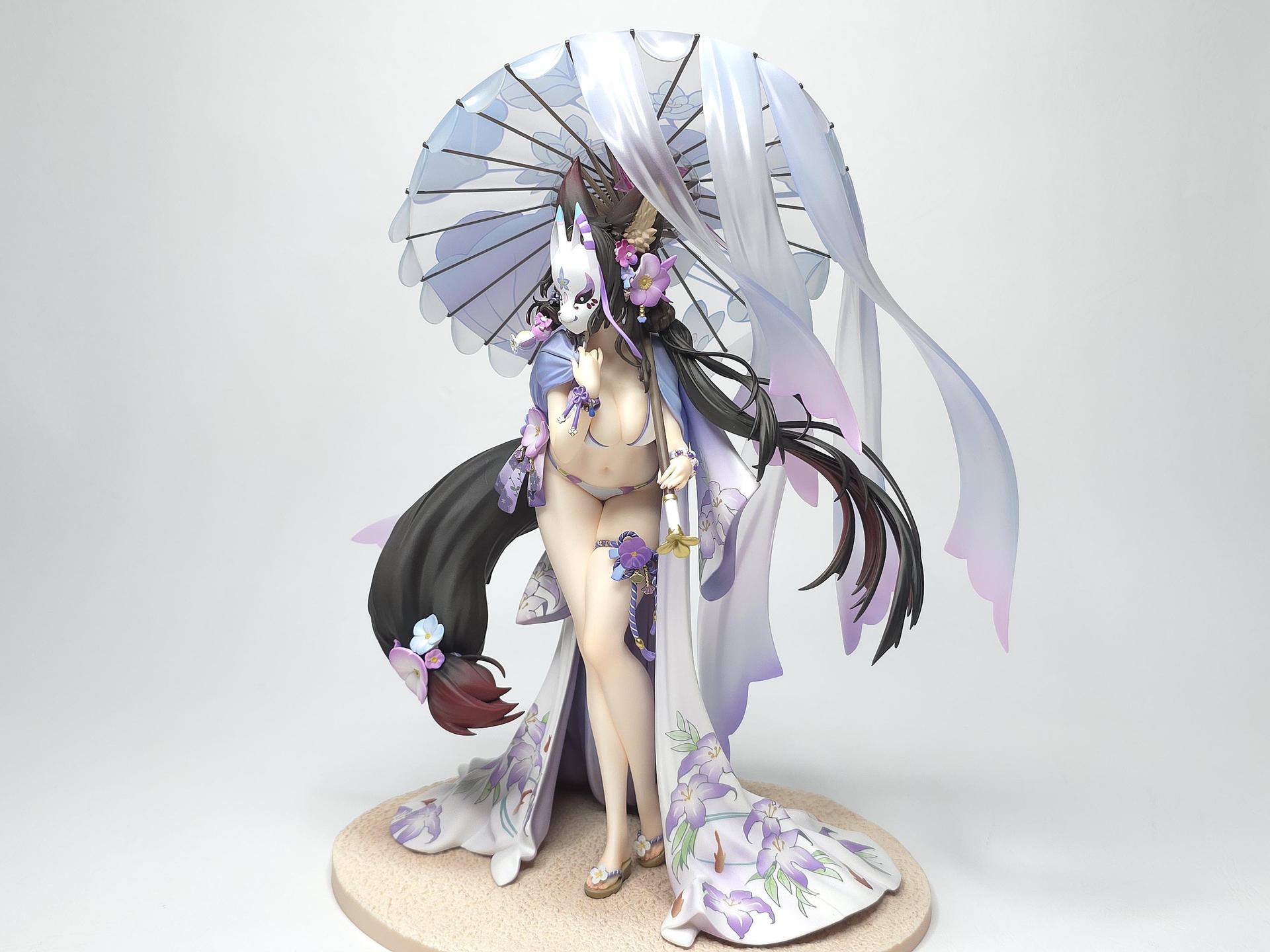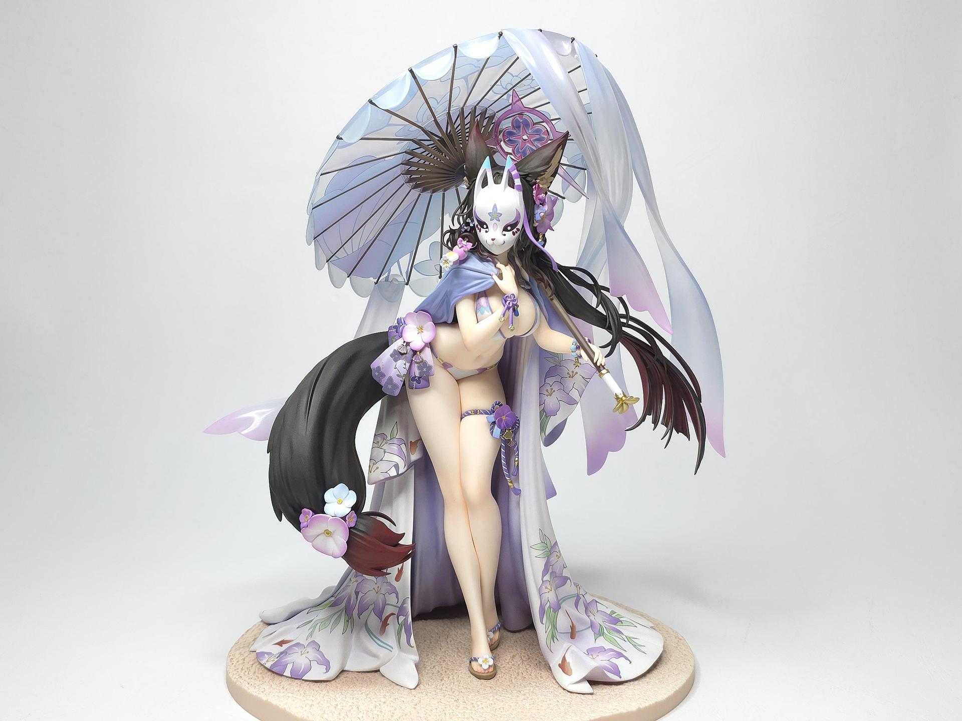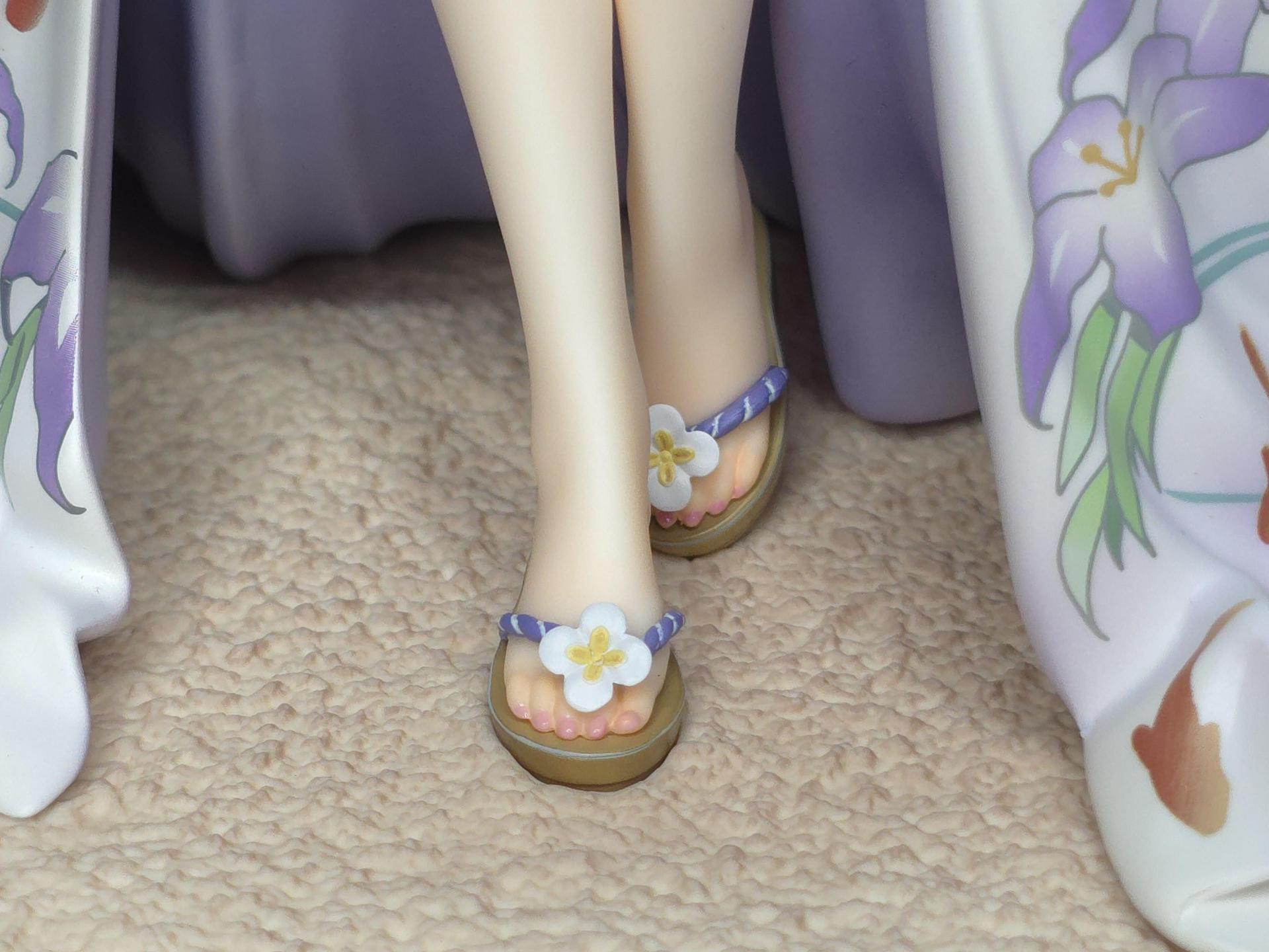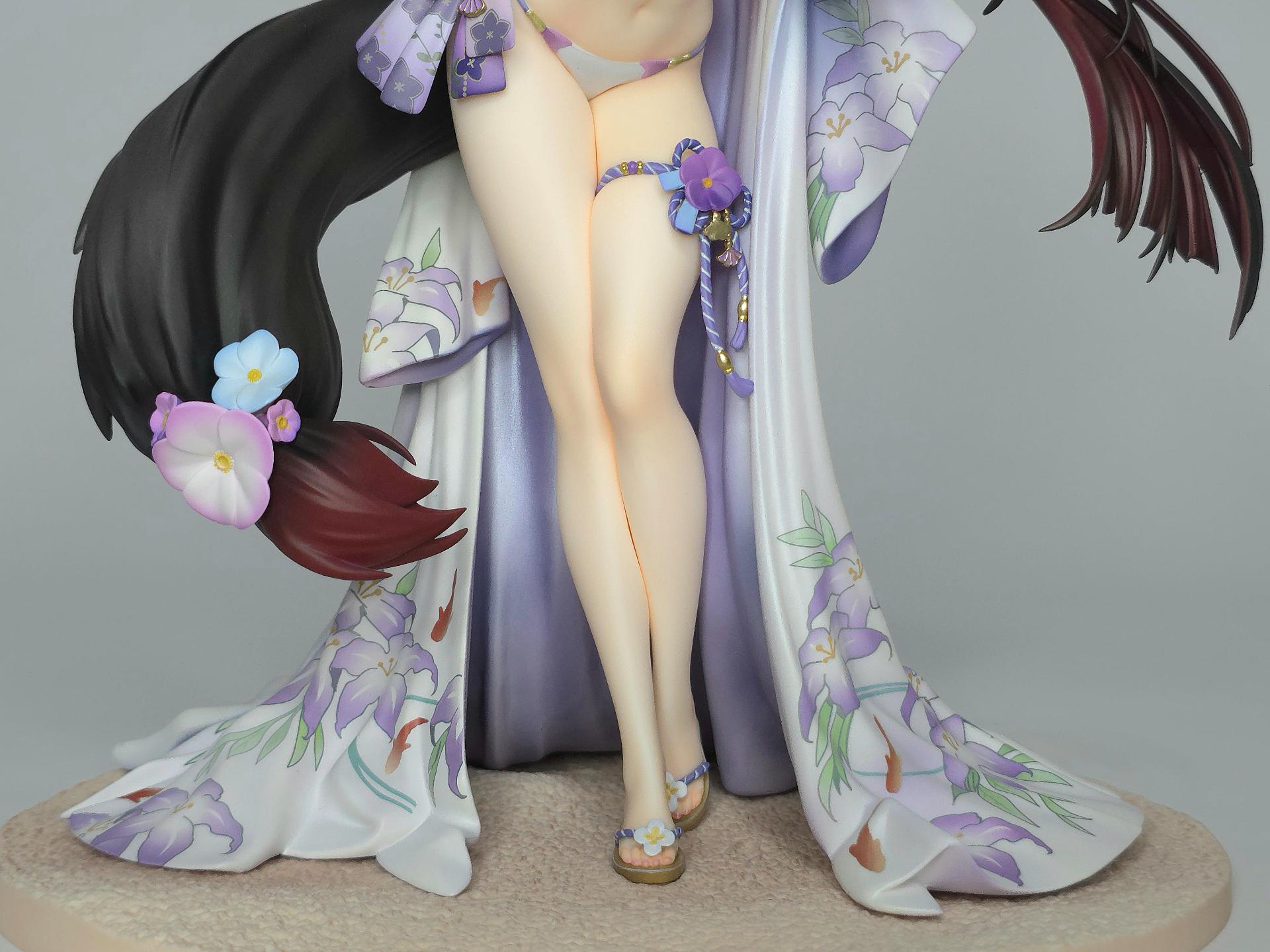以黑色與紅色作為平日穿搭配色的若藻,換上帶給人清涼感受的紫藍配色的夏衣。在振袖和服與陽傘、槍、裝飾品等設計上都使用了花的元素。
