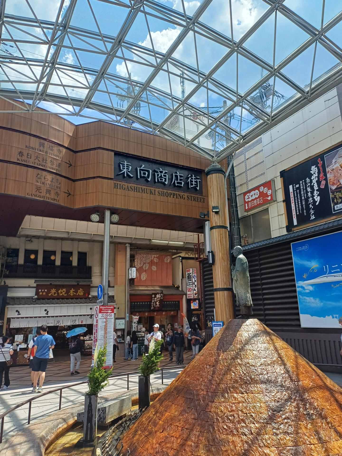到東向商店街吃午餐,入口處的雕像是行跡菩薩,建設奈良地區最著名的東大寺與許多佛寺以及宣揚佛法,可說是對奈良有極大的貢獻,JR和近鐵站出入口附近也都有雕像