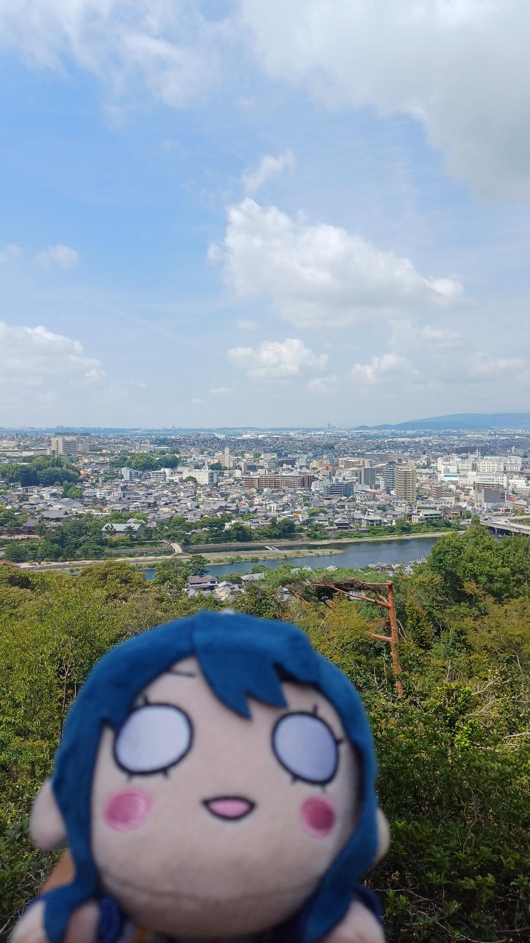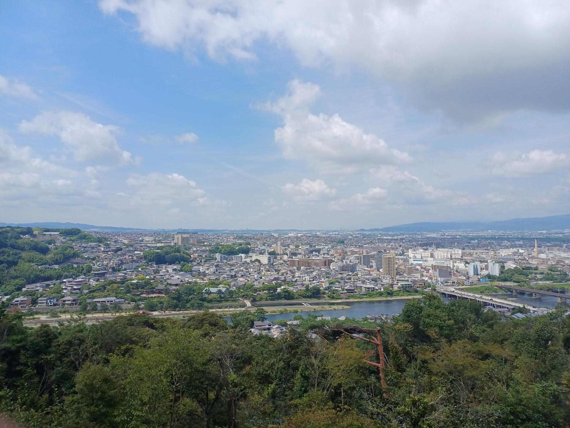 山頂視野遼闊還有一個大涼亭能坐著休息,在這裡可以把市區跟宇治川的景色盡收眼底,右邊兩座橋一座是JR奈良線的鐵道橋樑,一座則是剛才走過來的宇治橋