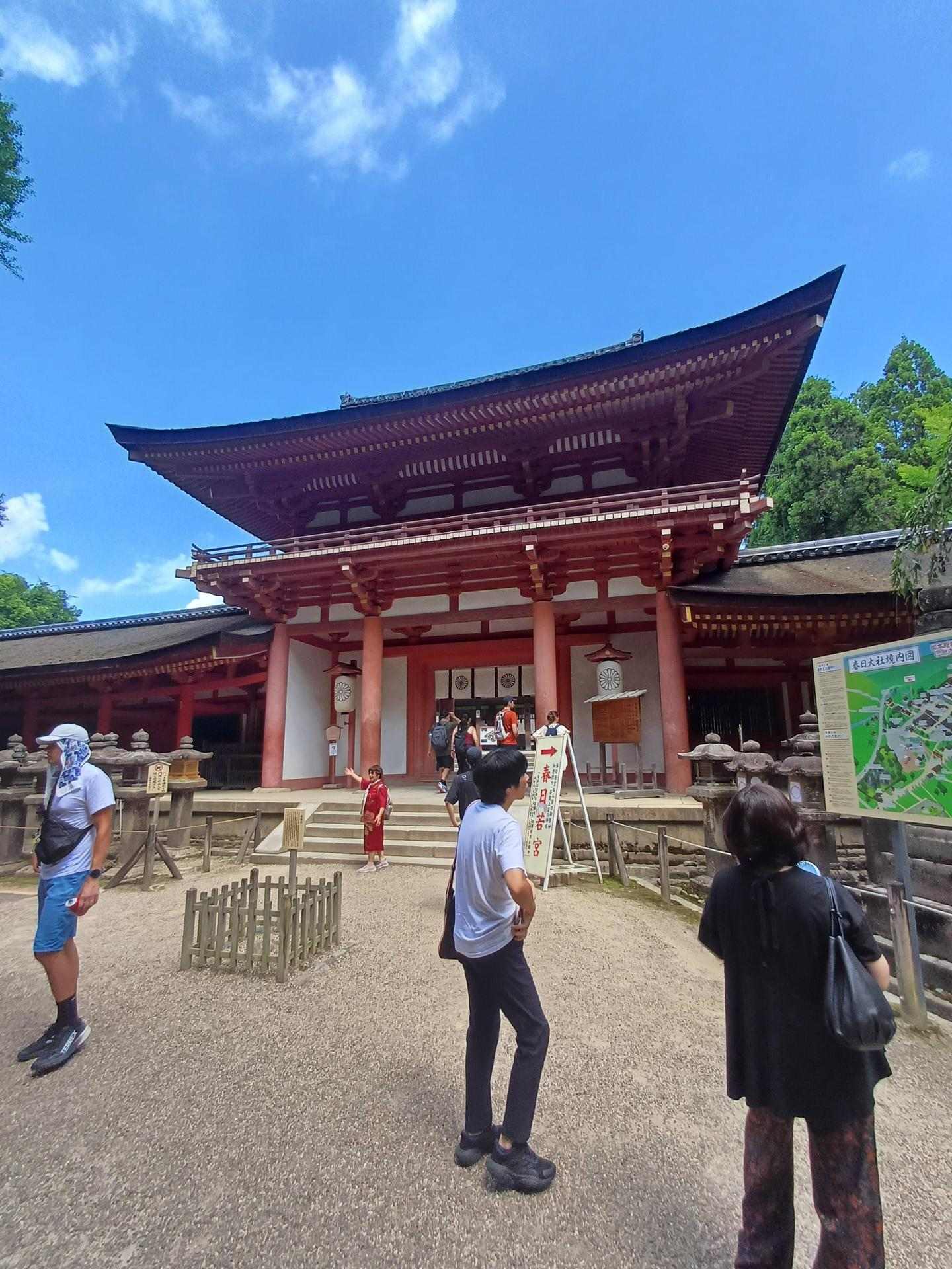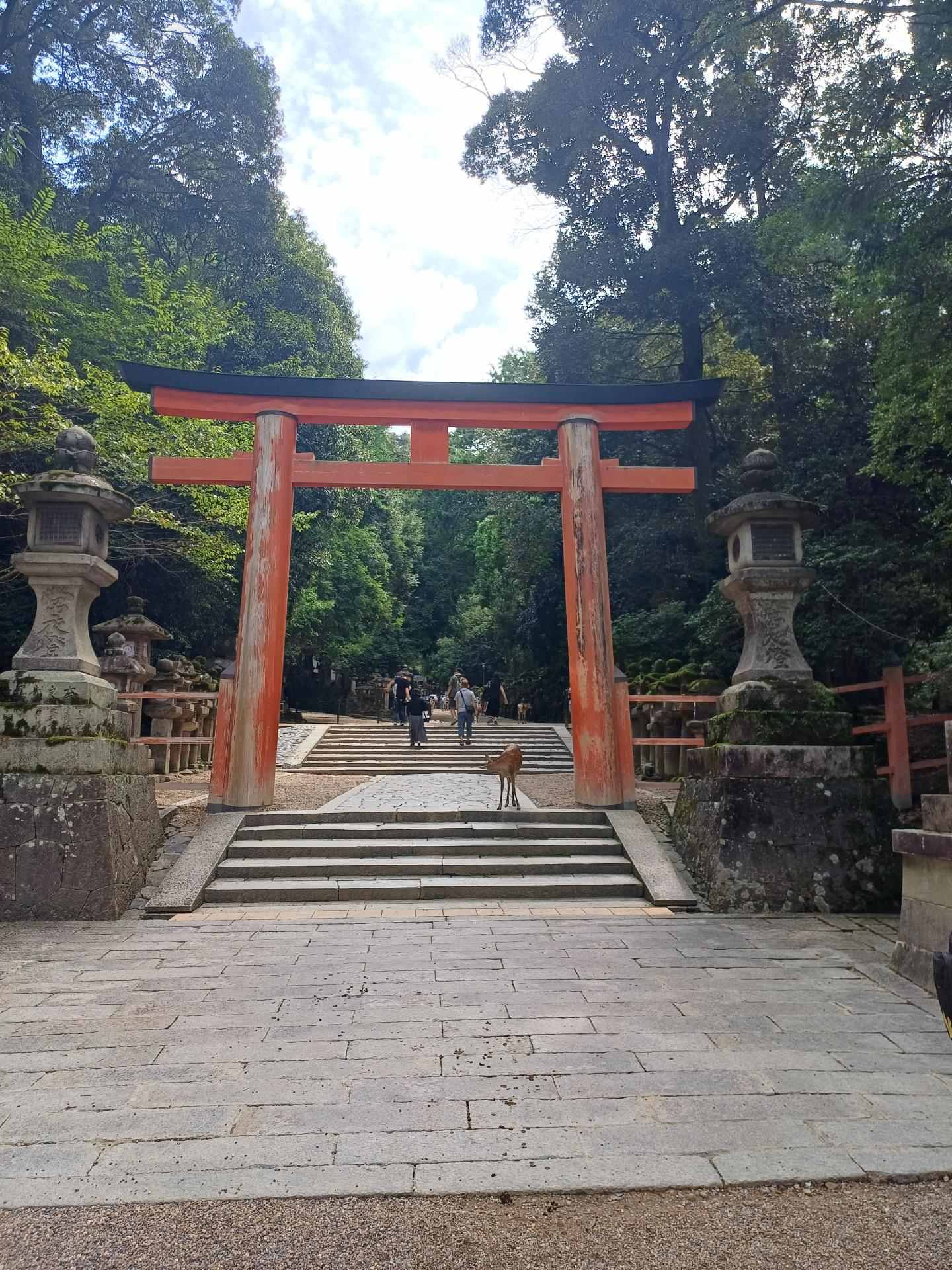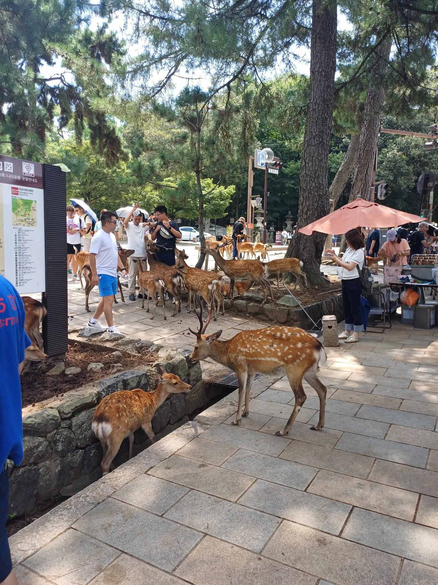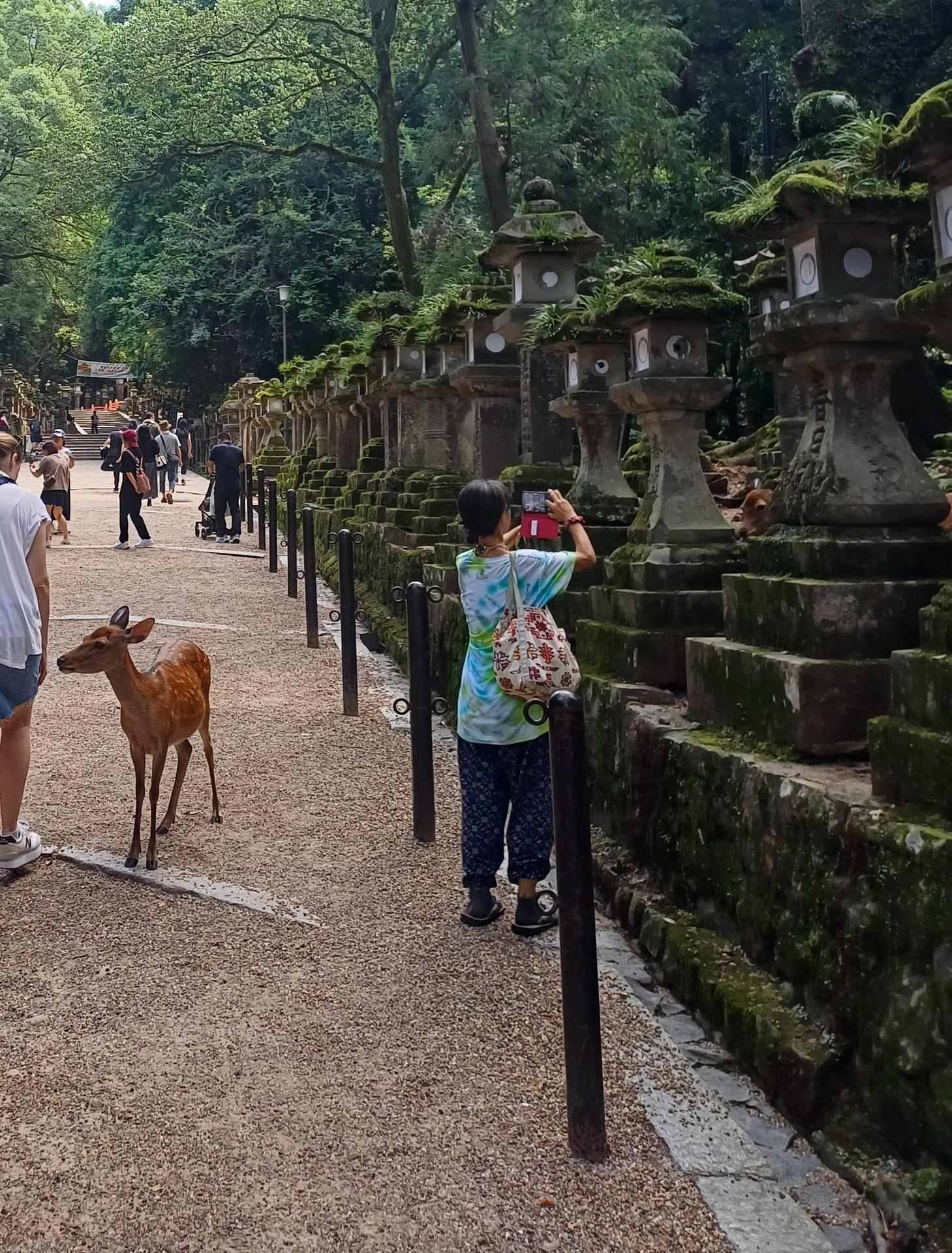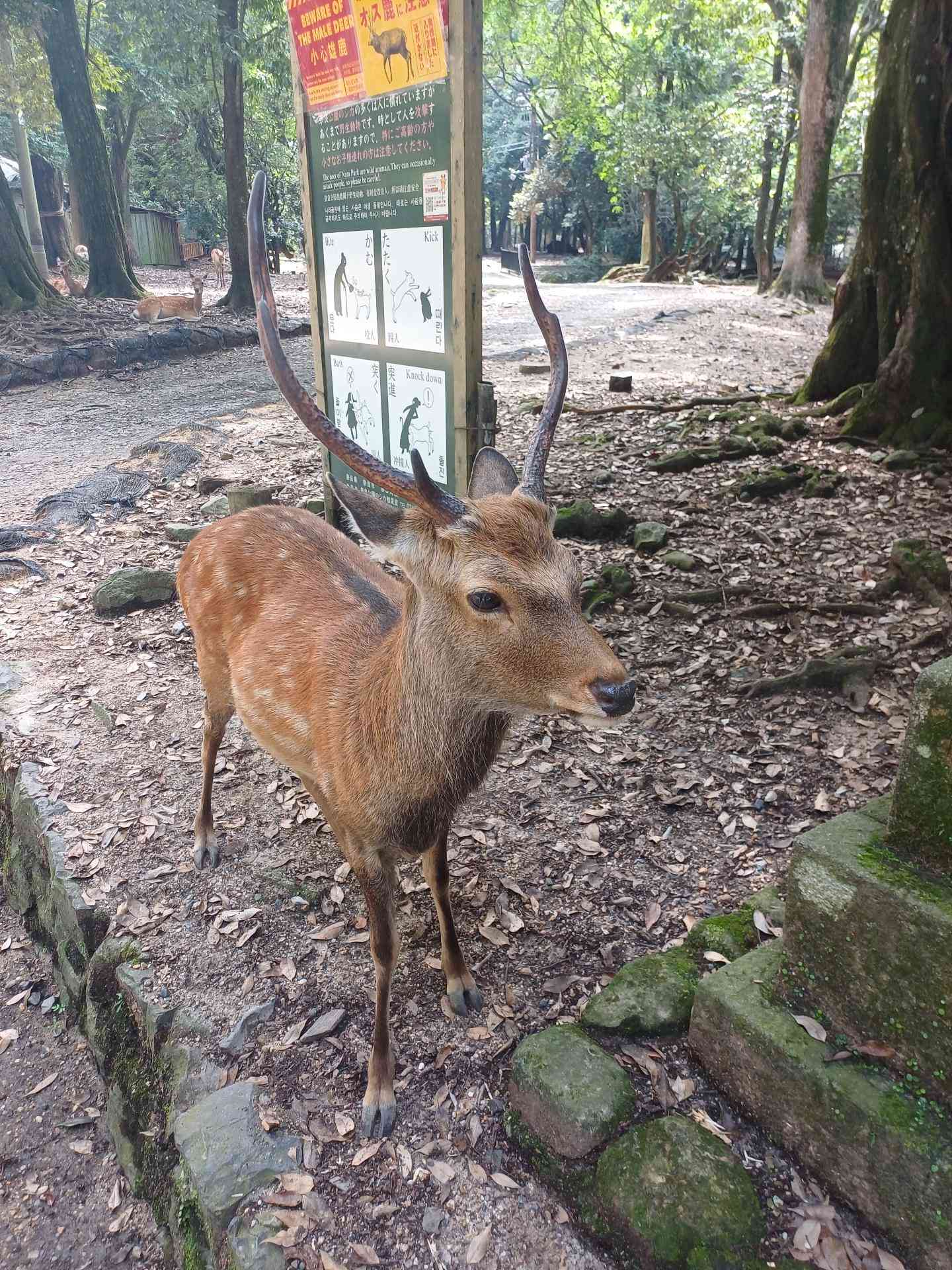 到奈良後先去比較遠的春日大社,參道上就有小鹿在樹蔭下休息,後來在這裡的洗手間發現此時正是雄鹿的繁殖期,會變得比平時暴躁許多,不過這裡的鹿倒是都很溫馴,沒有遇到看板上的狀況,不然被這副大角頂到可不是開玩笑的