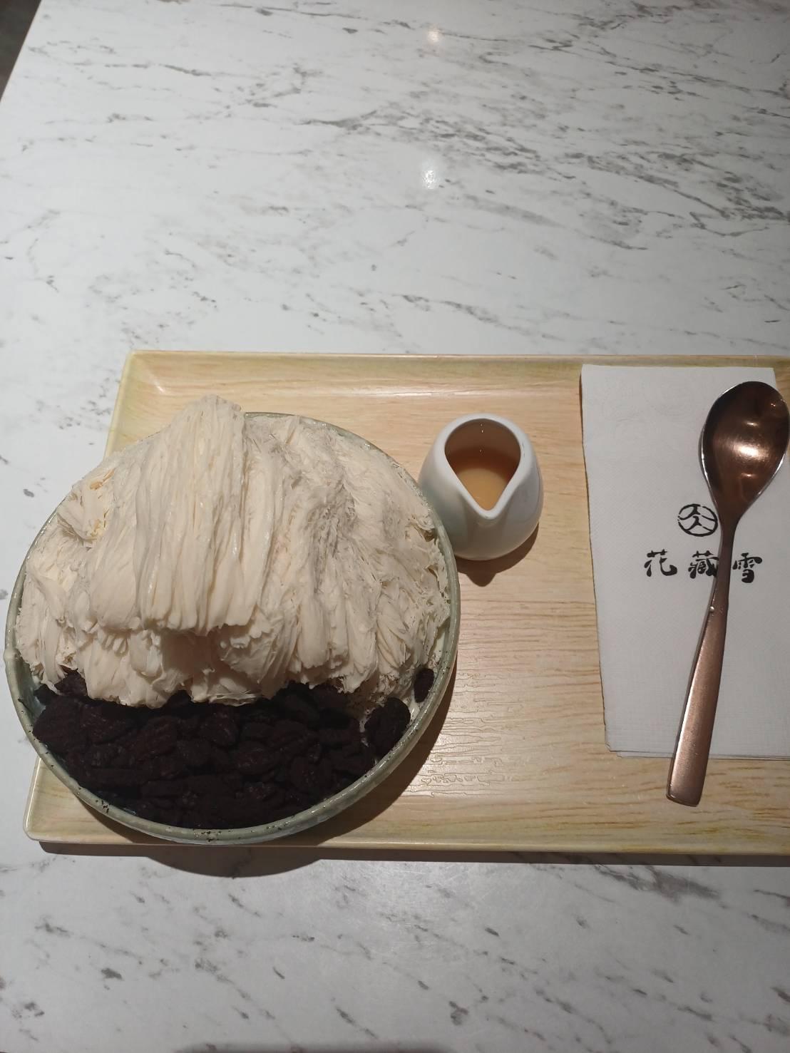 雪花冰和OREO巧克力餅的風味,整體來說算香甜可口,且旁邊還有煉乳可淋在雪花冰上一起食用。