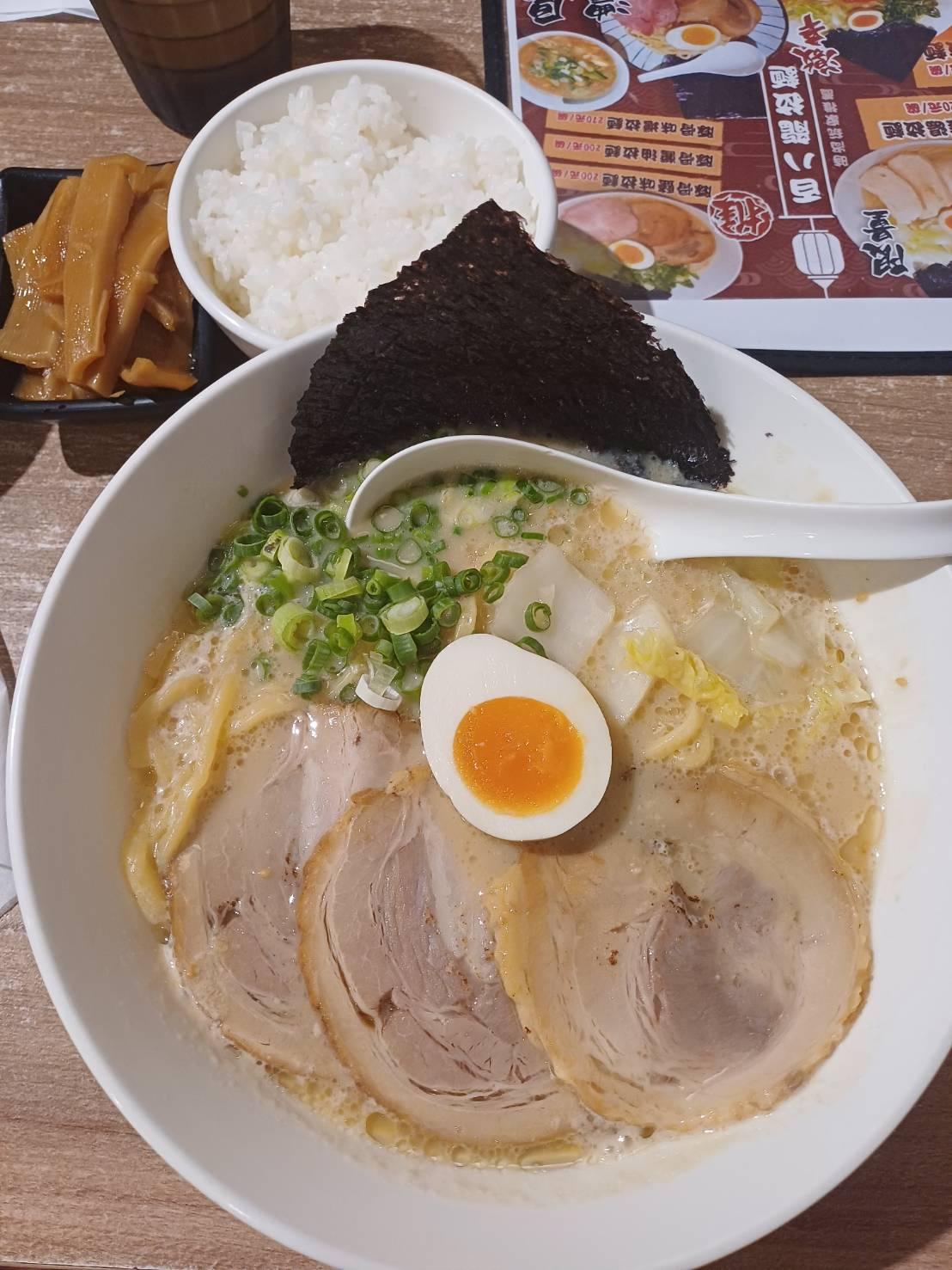 拉麵的麵選粗麵,配三片叉燒、糖心蛋、蔥花、海苔片、湯頭選豚骨味噌,拉麵的嚼勁本身算相當有嚼勁,且吃起來類似於烏龍麵的風格,湯頭甜跟鹹二者的比例各佔一半,吃完拉麵和料則在將點過的白飯在倒入湯頭,以茶泡飯來吃,等同於一碗麵同時有二種吃法。