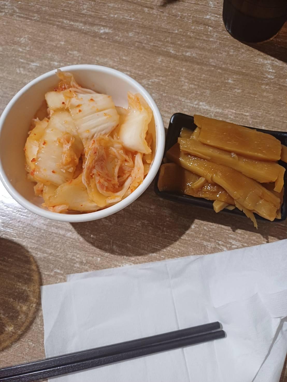 泡菜跟筍干的鹹度算相當入味,也較丸湯屋的小菜好吃許多,配白飯或拉麵吃都相當下飯。
