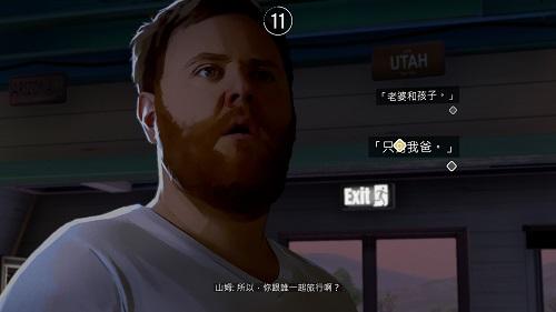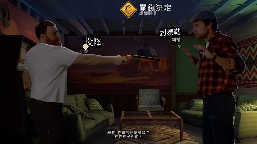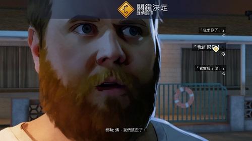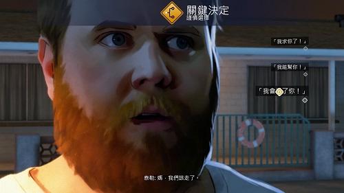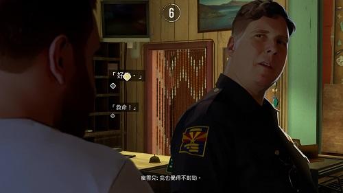 「文斯」老婆與小孩出現,選「我們趕快離開這裡」,警察「山姆」被殺,就會跳「少一個警察」獎盃。