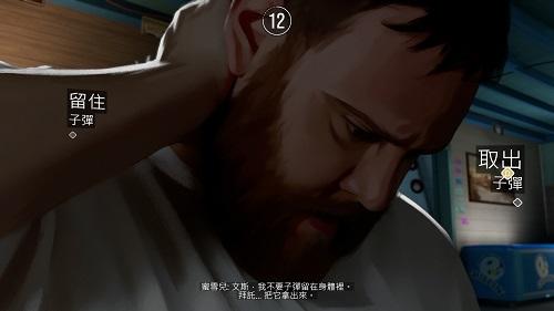 「蜜雪兒」中彈,「文斯」選右方「取出子彈」,完成QTE,就會跳「呼叫沃克醫生」獎盃。