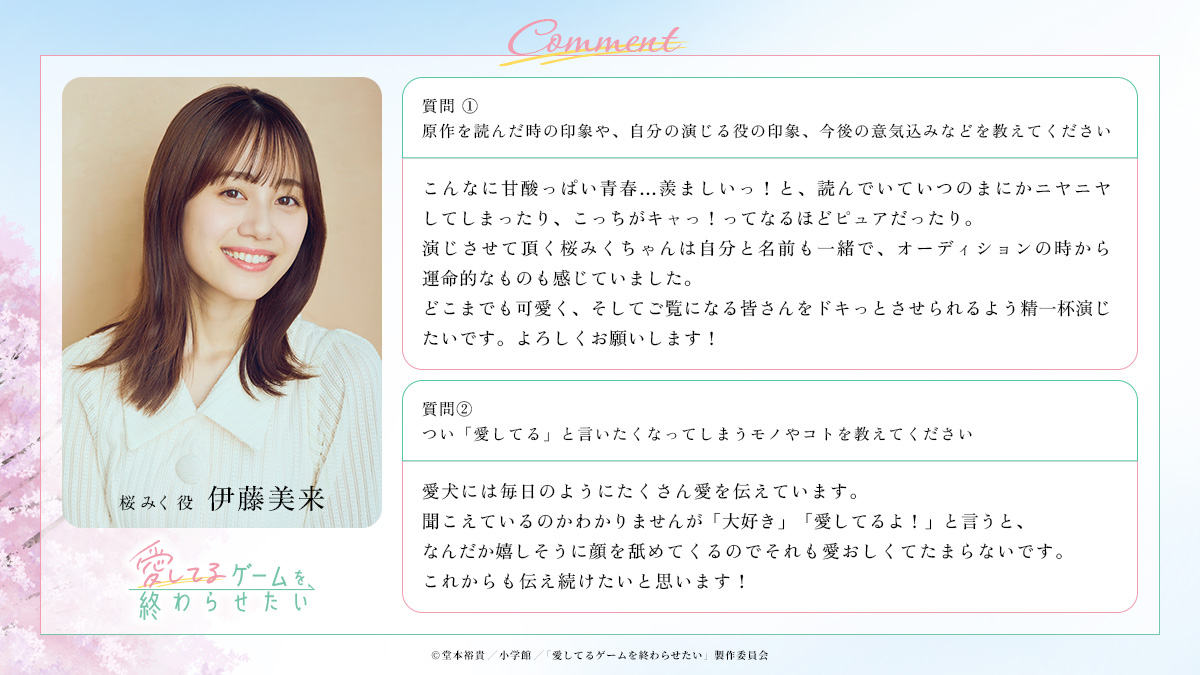 聲優部份,男主角 淺蔥優希 和女主角 櫻美玖,將分別由 石川界人 和 伊藤美來 等人擔綱演出。官方也釋出來自聲優們的留言,如有興趣的可自行點選下方圖片來觀看。