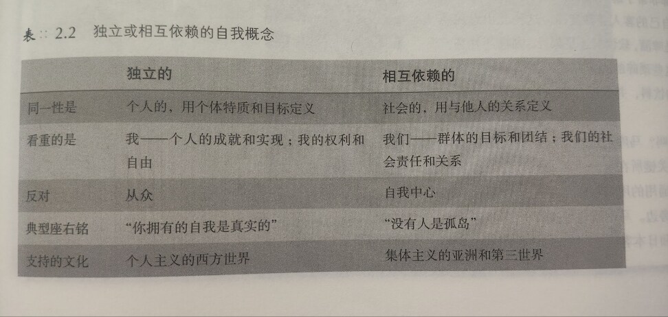 (附圖,摘自《社會心理學》,亞洲人是相互依賴的那一區塊,用別人的關係來定義自我。)