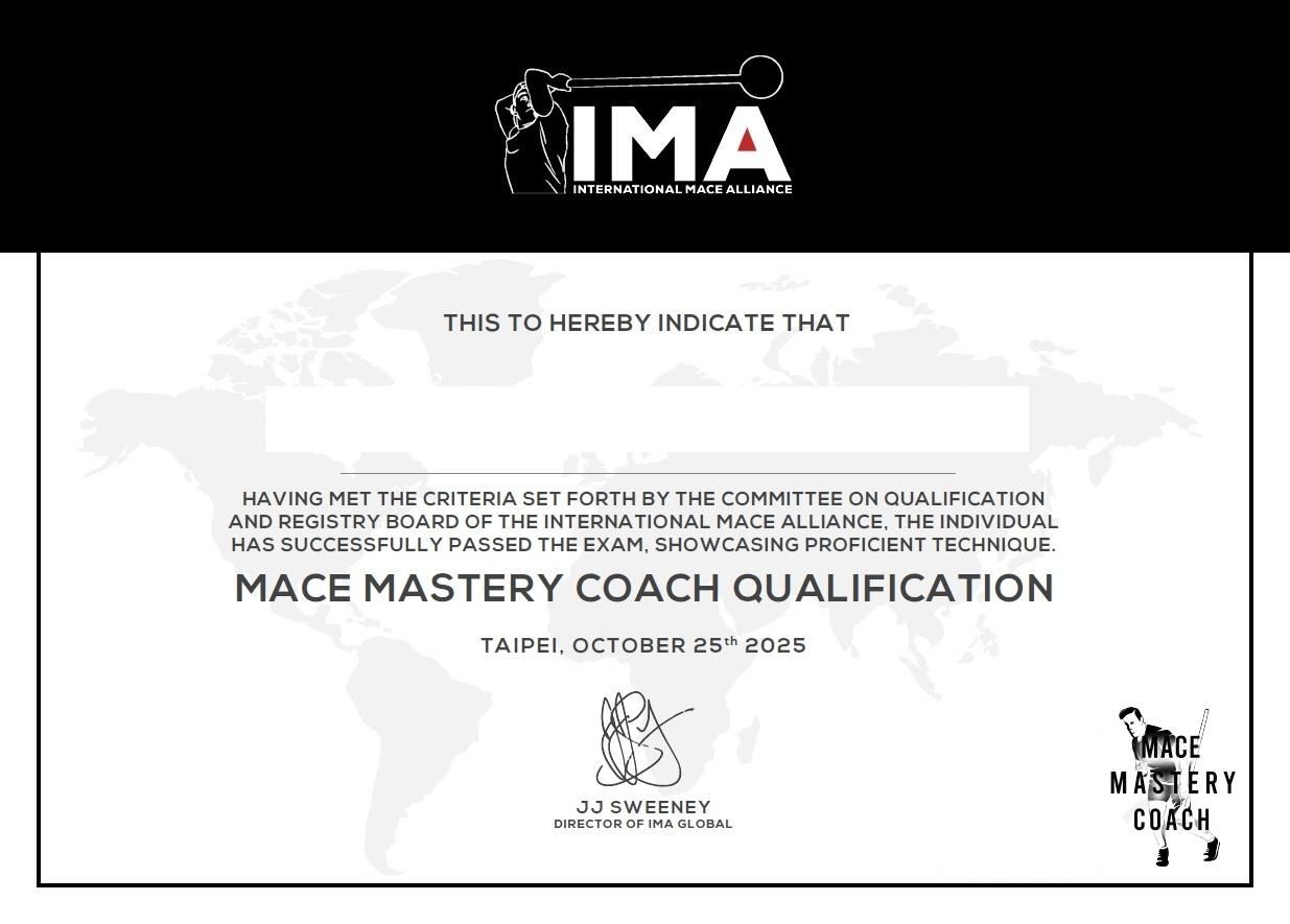 就在今年10月25日,「IMA Mace Mastery Level 2國際錘鈴教練證照」的場次終於順利開成,這張證照同樣是由人體無限教育學院引進。