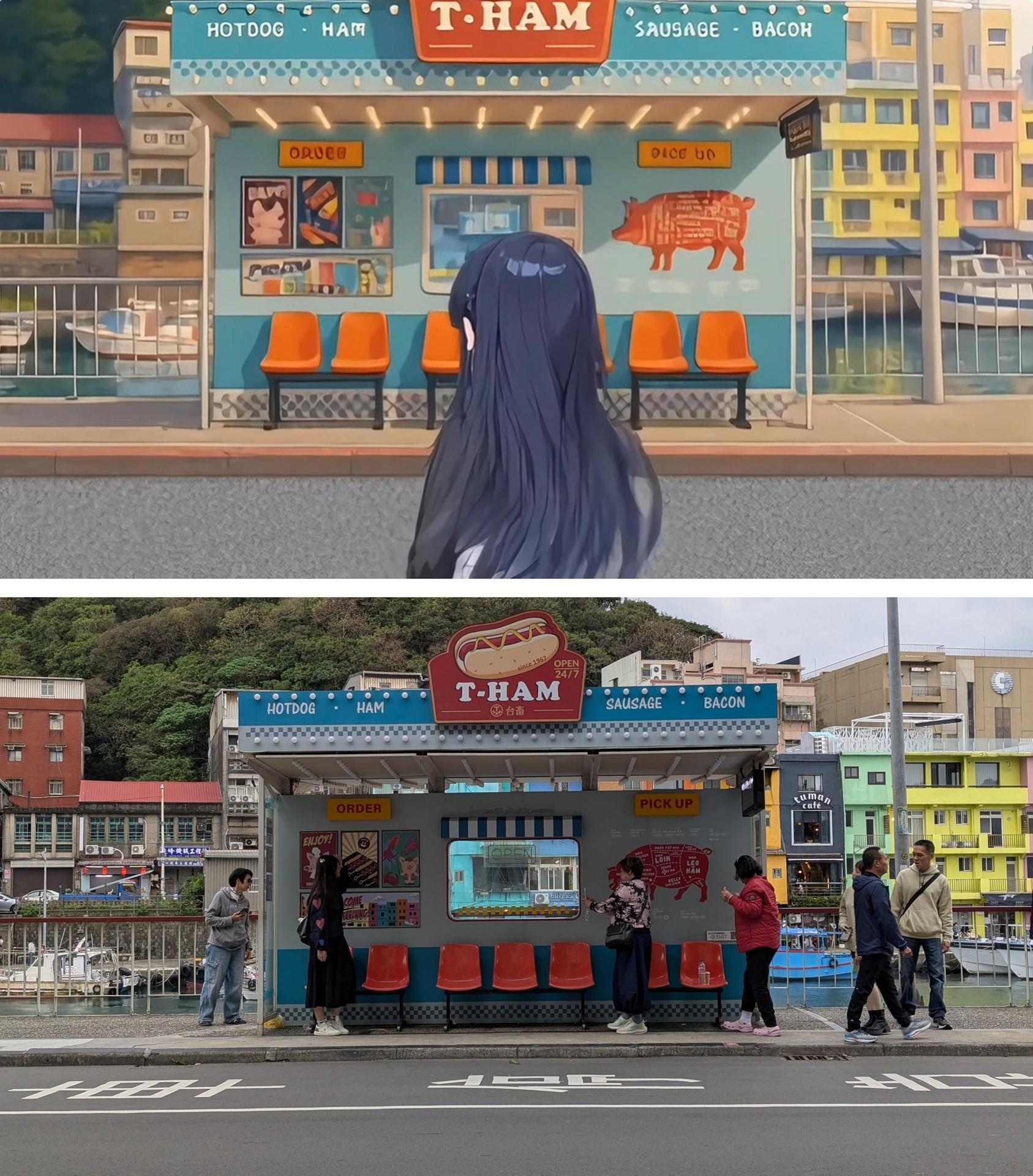 嘉琪搭乘公車來到政濱漁港時對街的熱狗堡攤造型的候車亭,以嘉琪為視角補足文雄到來前的劇情。本站由台灣農畜產工業(台畜)認養,是基隆八大造型候車亭之一。