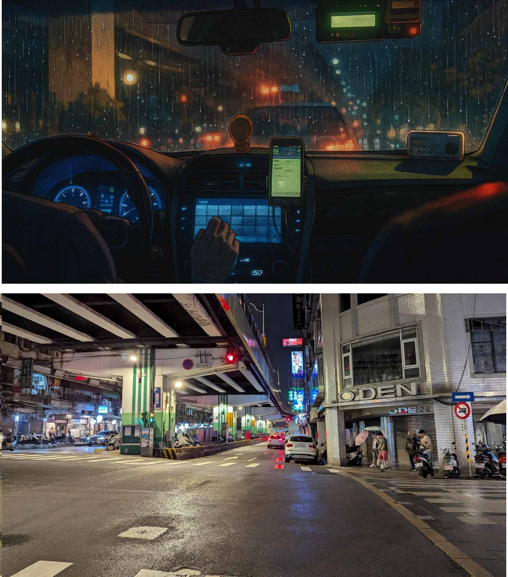 東岸高架道路下(推測)兩人搭上計程車返程途中經過經過的高架橋下。從崁仔頂魚市場上車後推測行經的路線會經過的高架橋為東岸高架道路,雖然說不太像,不~是非常不像,不曉得兩人正確回家的路在哪裡呢。