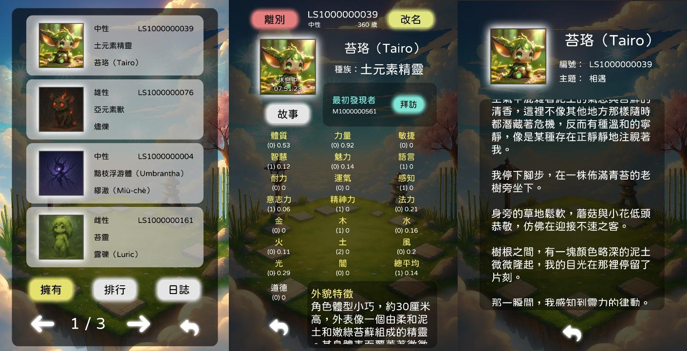 - 每隻生物都有基本數值跟介紹,也能花原質幫它改名字。輸入編號可以和生物離別,而發現者的名字會優先顯示在那裡。