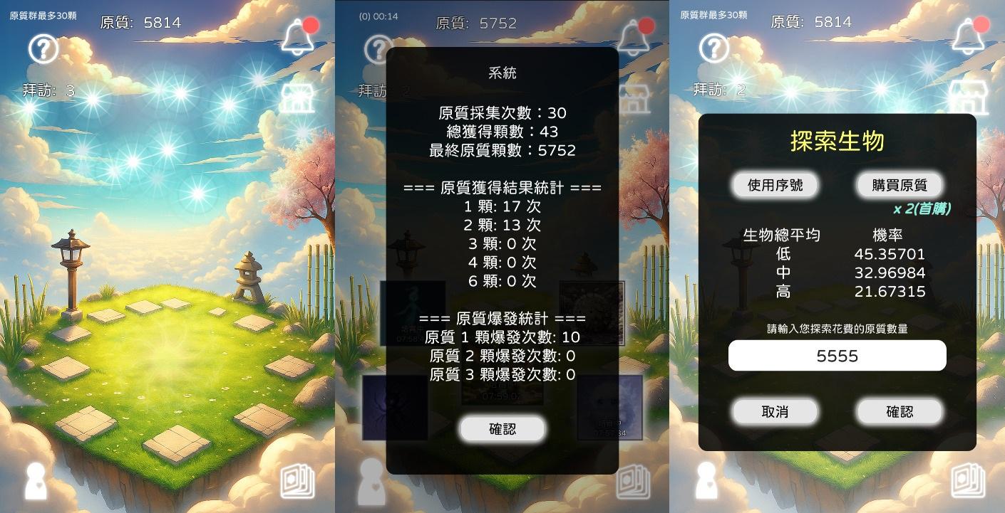 - 想探索生物就點傳送陣,用原質申請即可,投入越多原質,越有可能發現更稀有的生物。