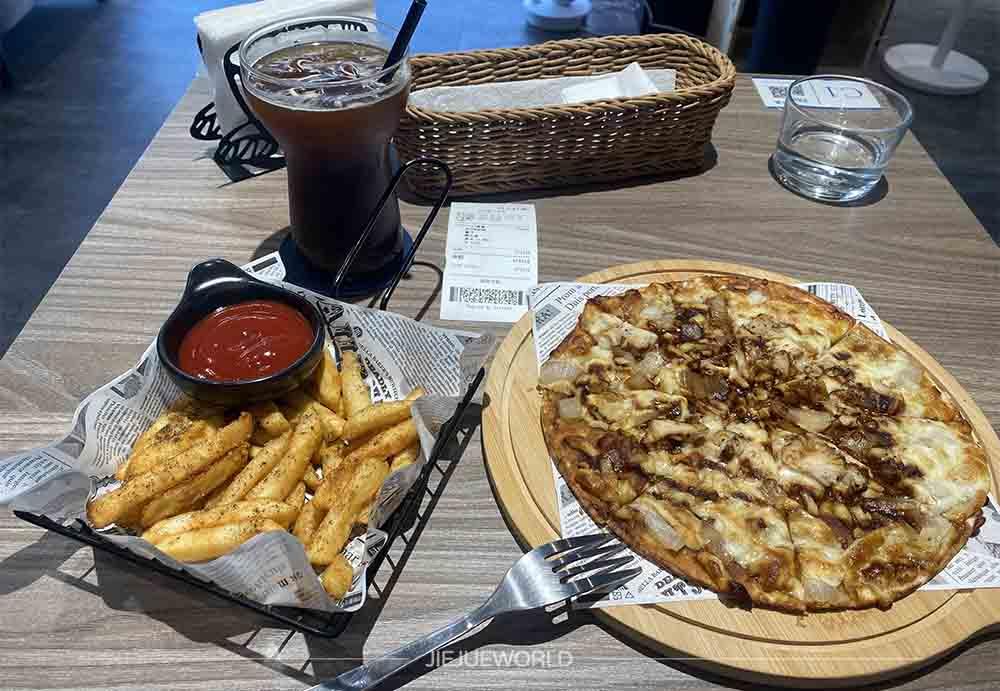 點了BBQ烤嫩雞披薩套餐(NT. 350) 會附上一杯美式咖啡+脆薯,沒有加收服務費,只能現金 / LINE PAY付款。