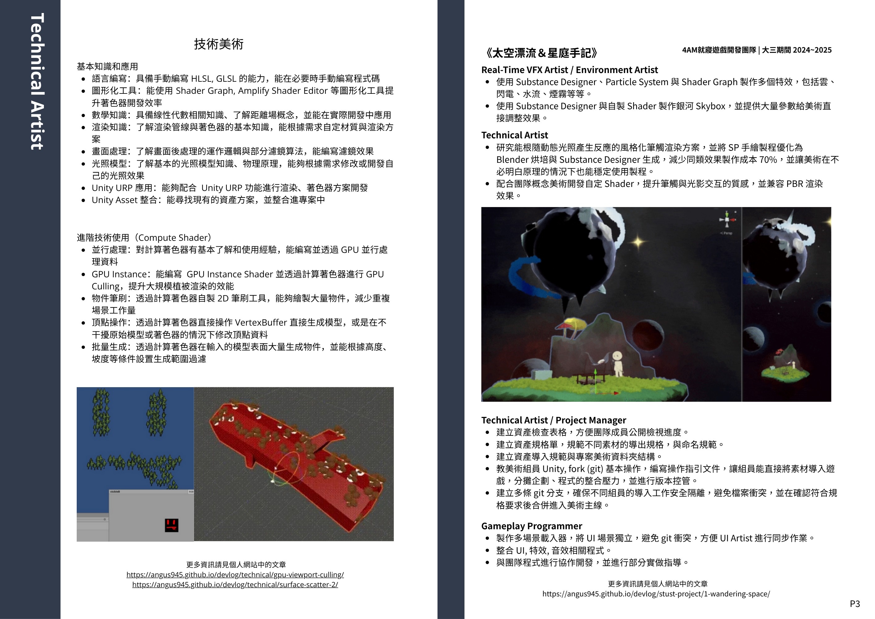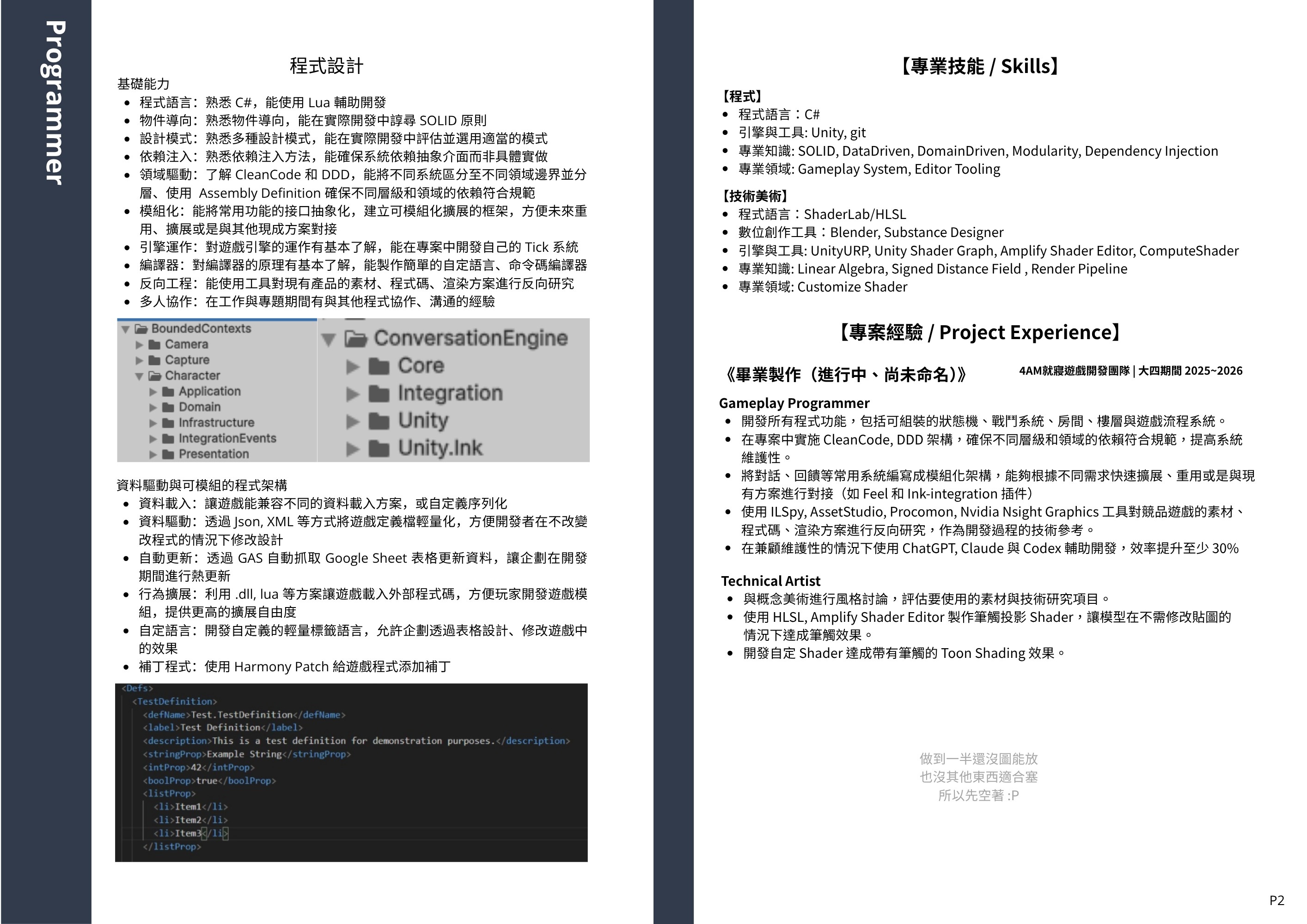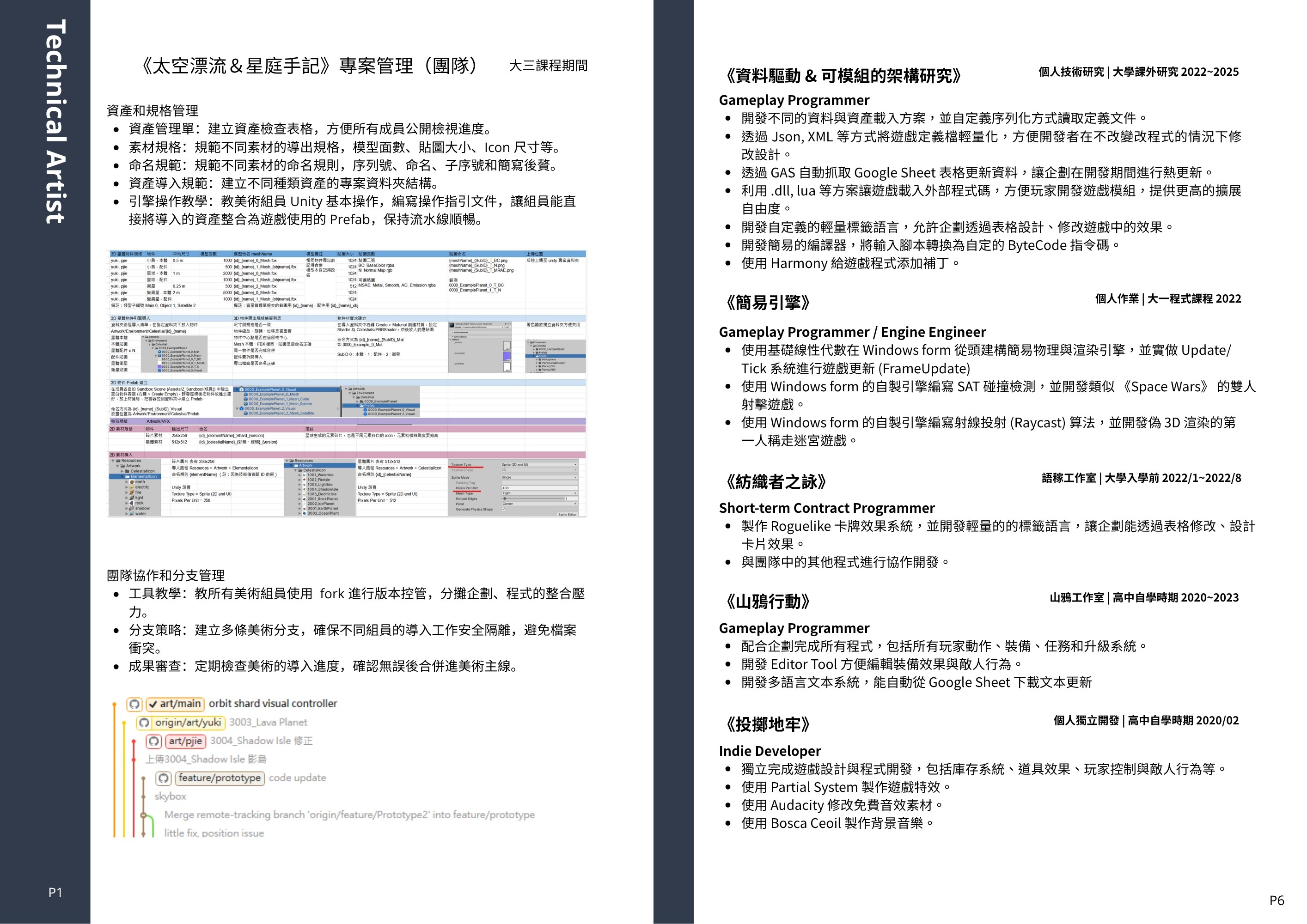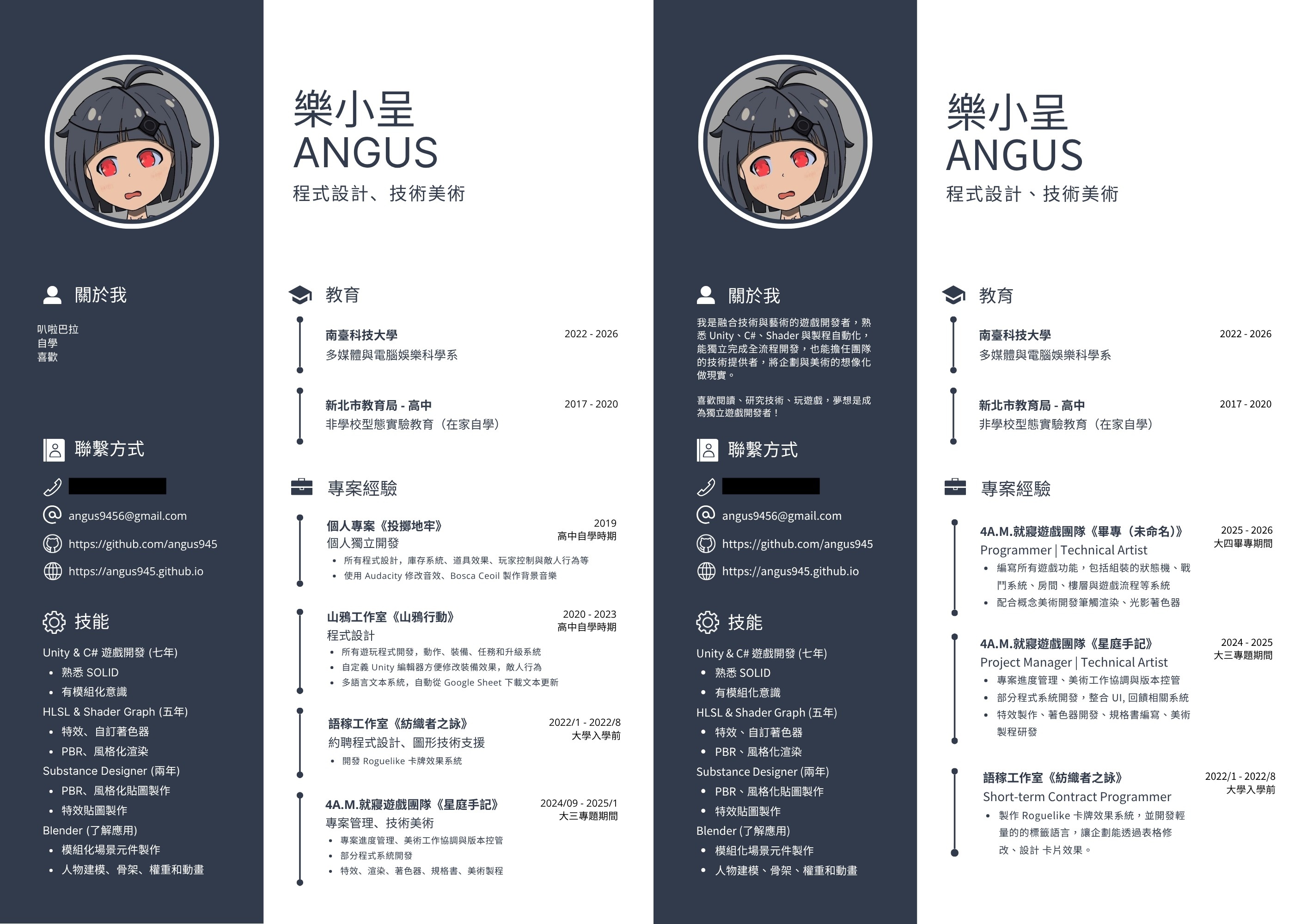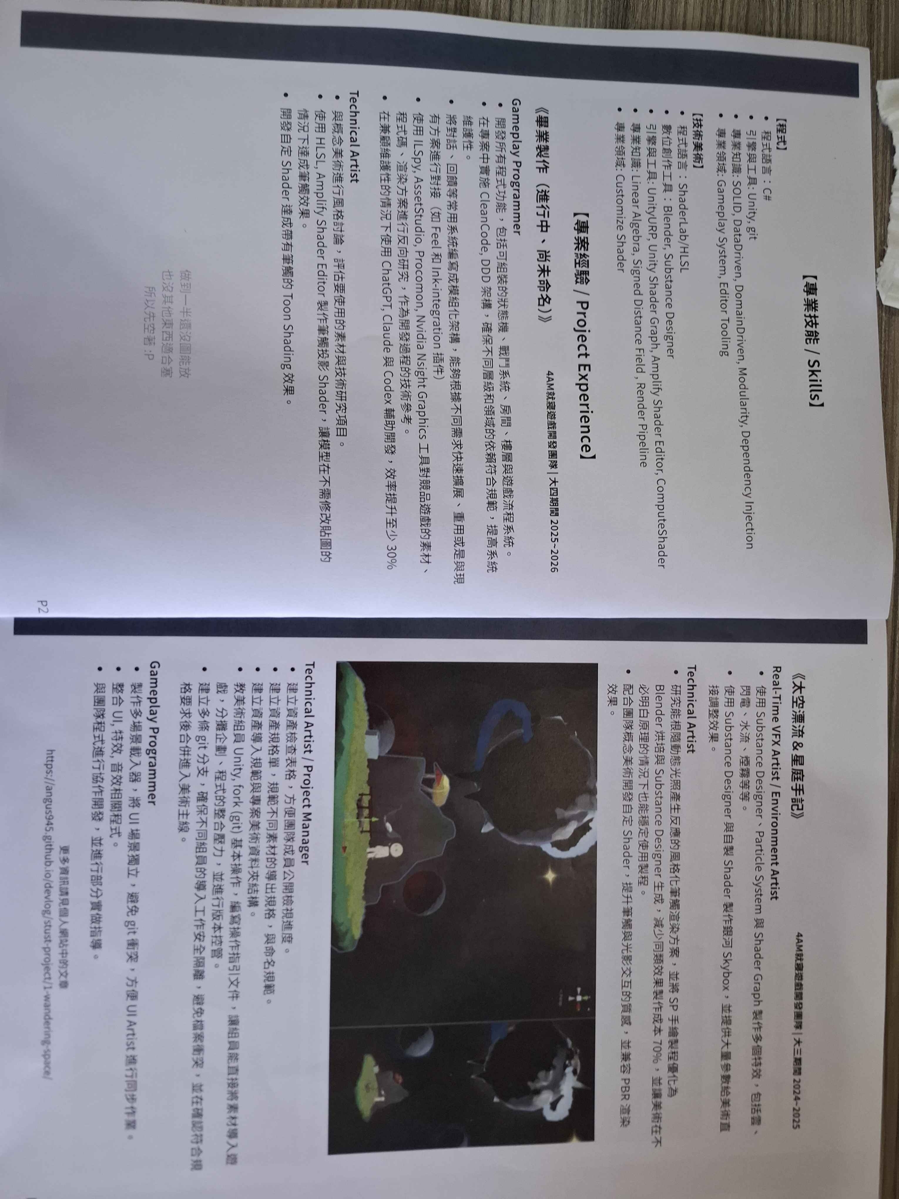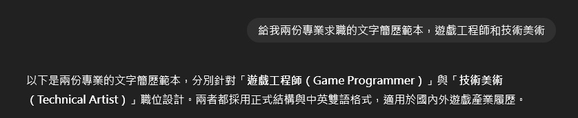 第二版就改善不少,剩下就是要我拆成兩份,一是長度問題,六頁應該真的太長,二是簡歷內容是程式跟技美混在一起的,如果正式用可能要拆兩份投不同職位,剩下就是補中一些改成英文版的建議。