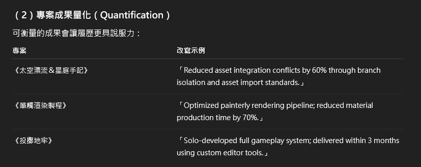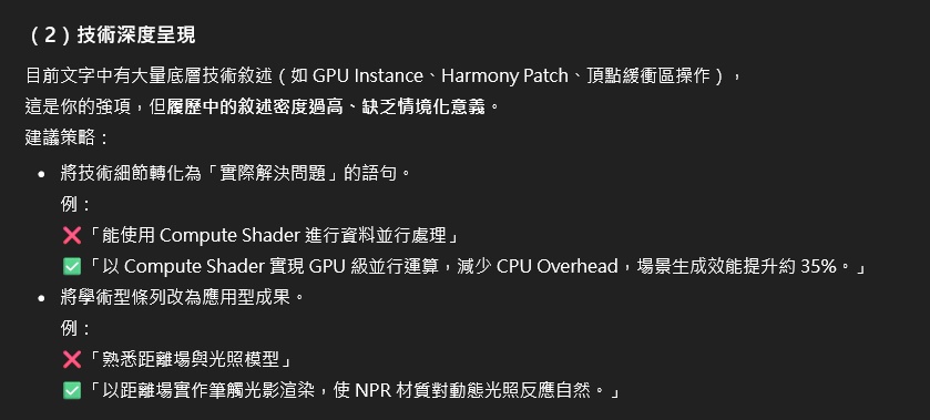 修正版也有給 GPT 看,除了篇幅過長、建議拆兩份和英文版本之外,剩下的問題還有「專案成果未完全量化」,有些能明顯體感出差異的我都加了預估數字,其他就沒辦法了,超出目前能力範圍。