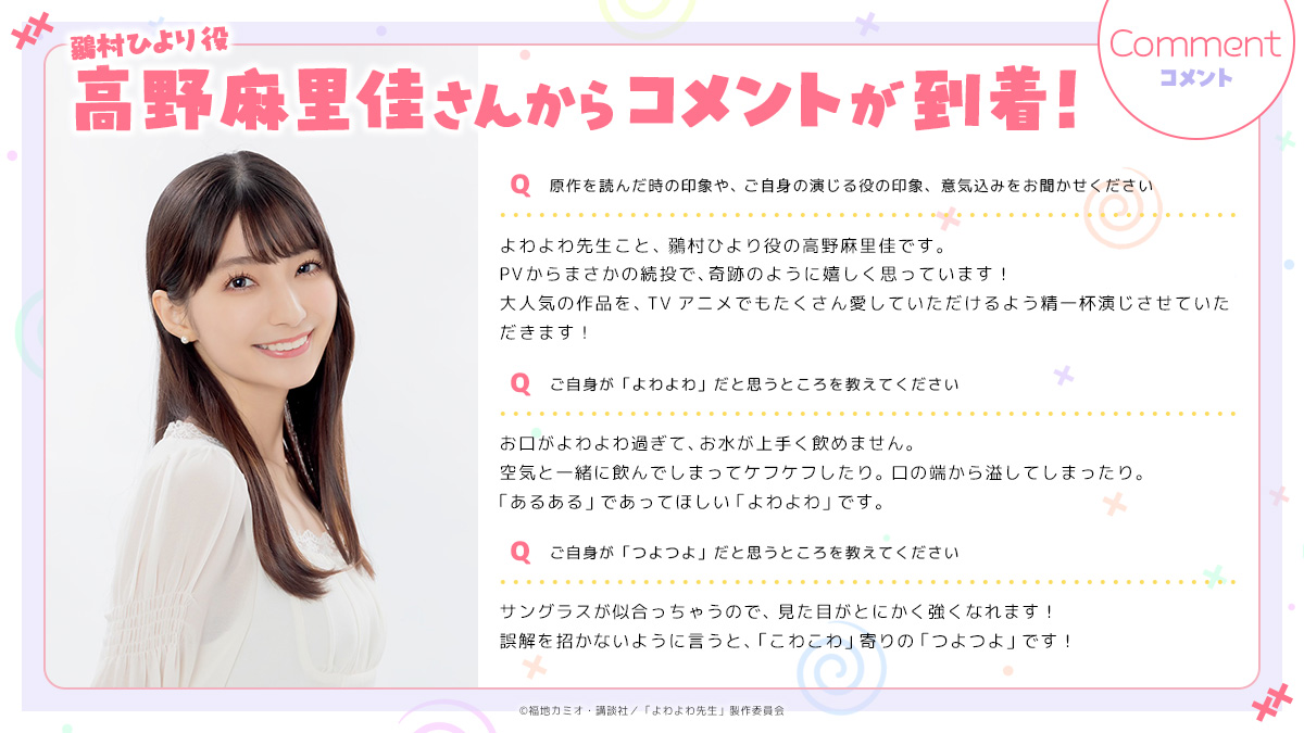 由 福地カミオ 創作,於「週刊少年 Magazine(講談社)」連載並宣布改編成電視動畫的漫畫作品《弱弱老師》(よわよわ先生),官方在今(8)日釋出了動畫概念概念視覺圖與主演聲優資訊。