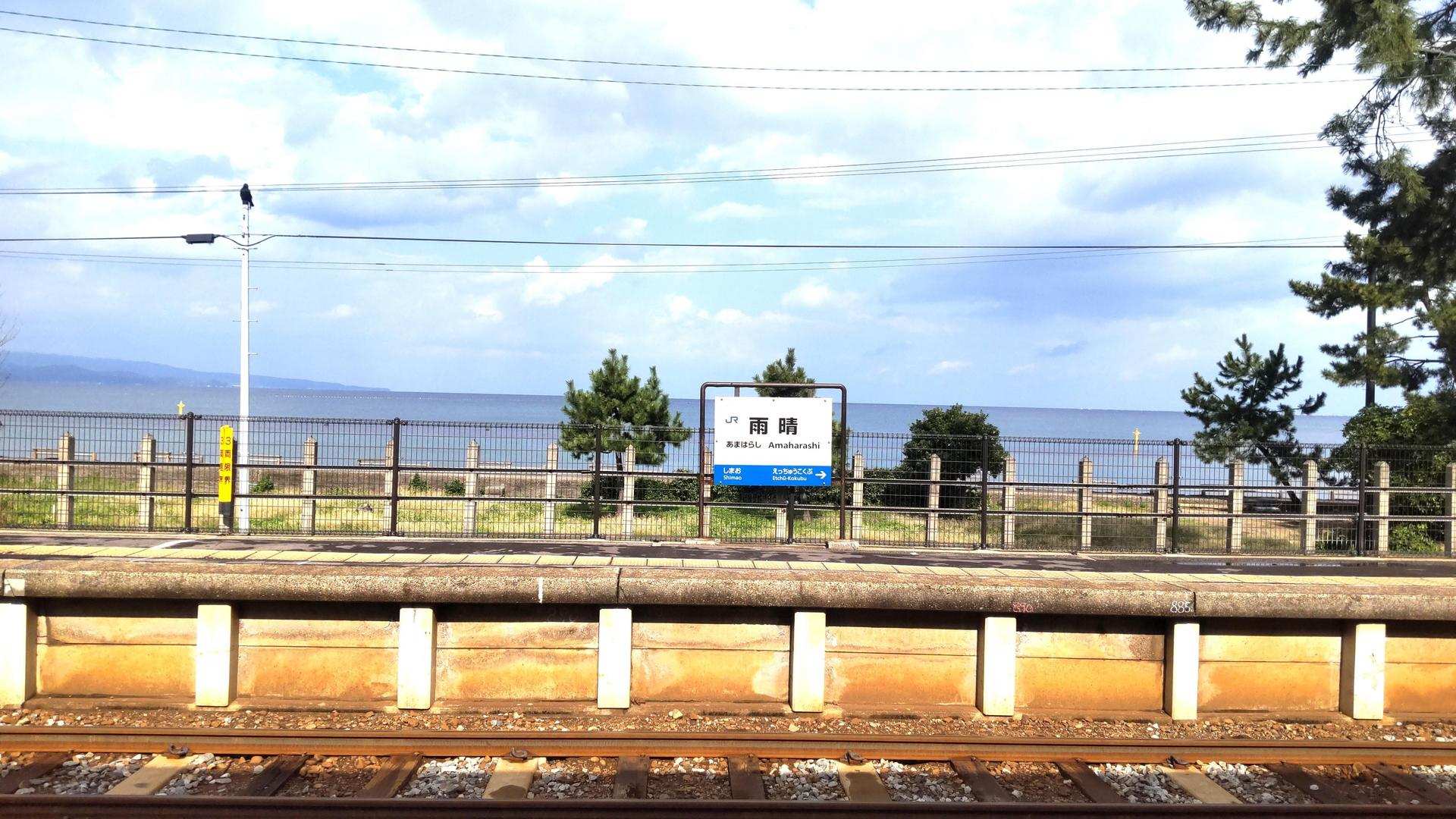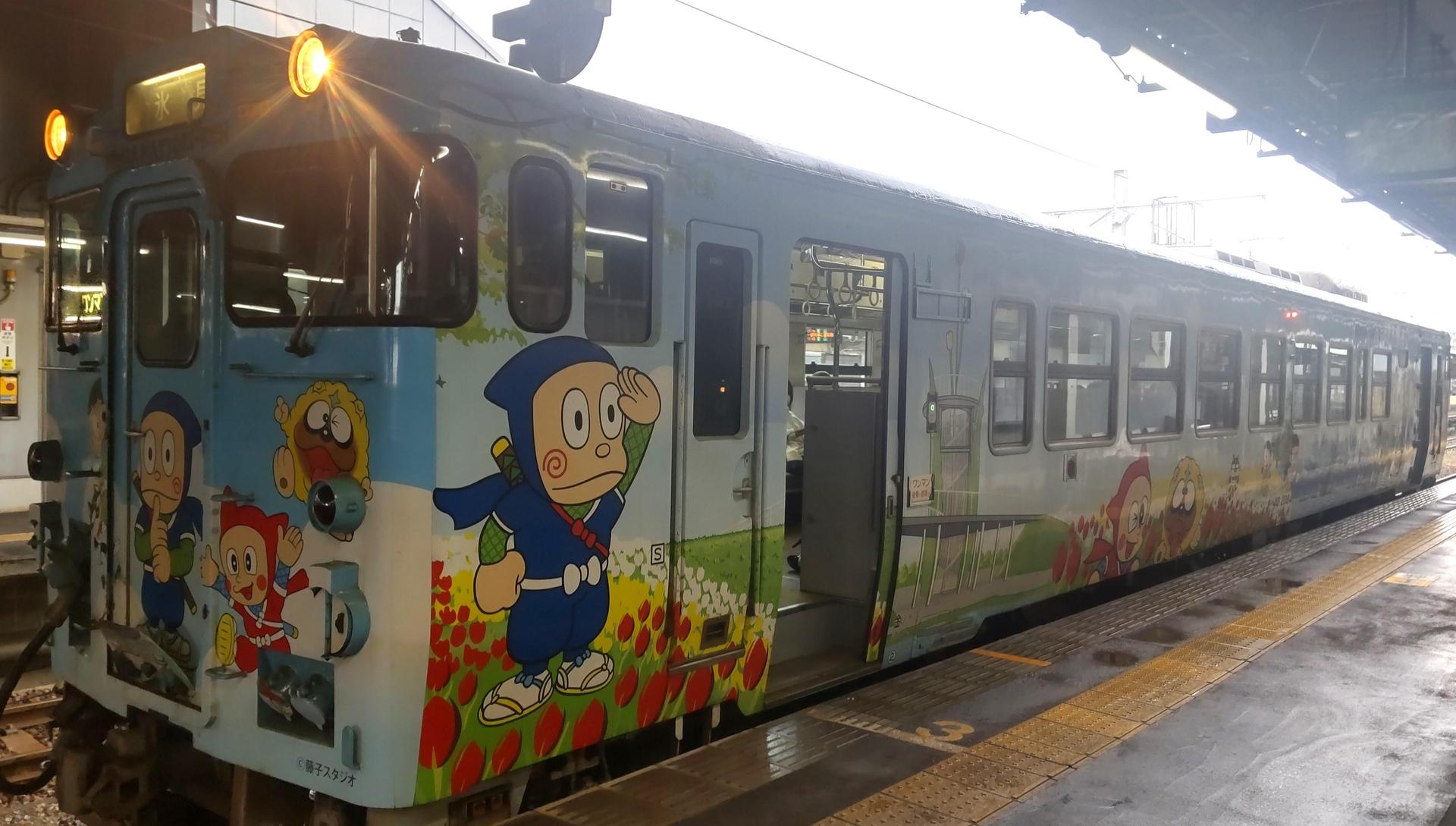 從高岡坐冰見線往雨晴出發,剛好坐上哈特利的車子,車身有彩繪,廣播也有配音員的聲音介紹,很有趣。